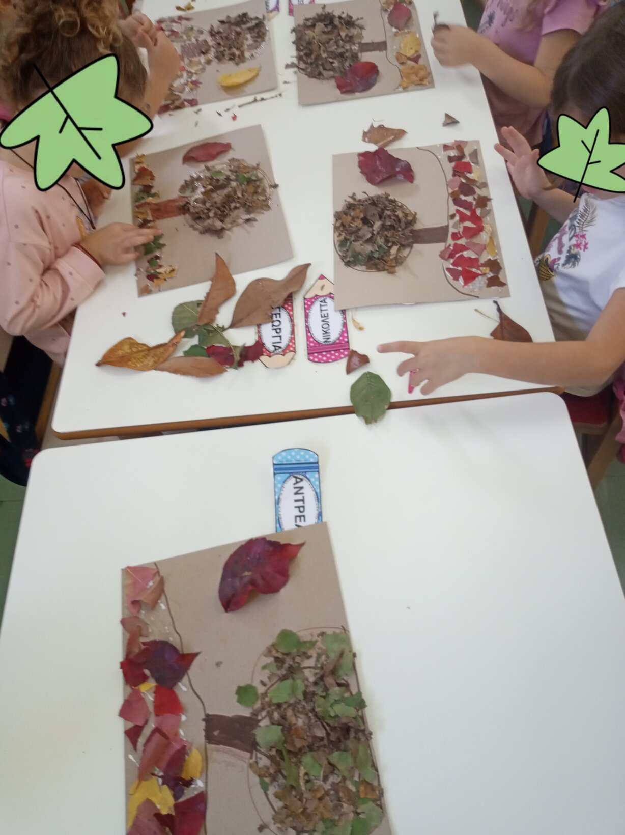 Ζητήσαμε από τους γονείς στον περίπατό τους να μαζέψουν φθινοπωρινά φύλλα σε κόκκινο, κίτρινο, πορτοκαλί, καφέ και πράσινο χρώμα μαζί με τα παιδιά και να τα φέρουν στο σχολείο. Η ανταπόκριση ήταν άμεση. Τα παιδιά τα χρησιμοποίησαν και έφτιαξαν ένα όμορφο φθινοπωρινό πίνακα με υλικά που χρησιμοποίησαν από τη φύση.