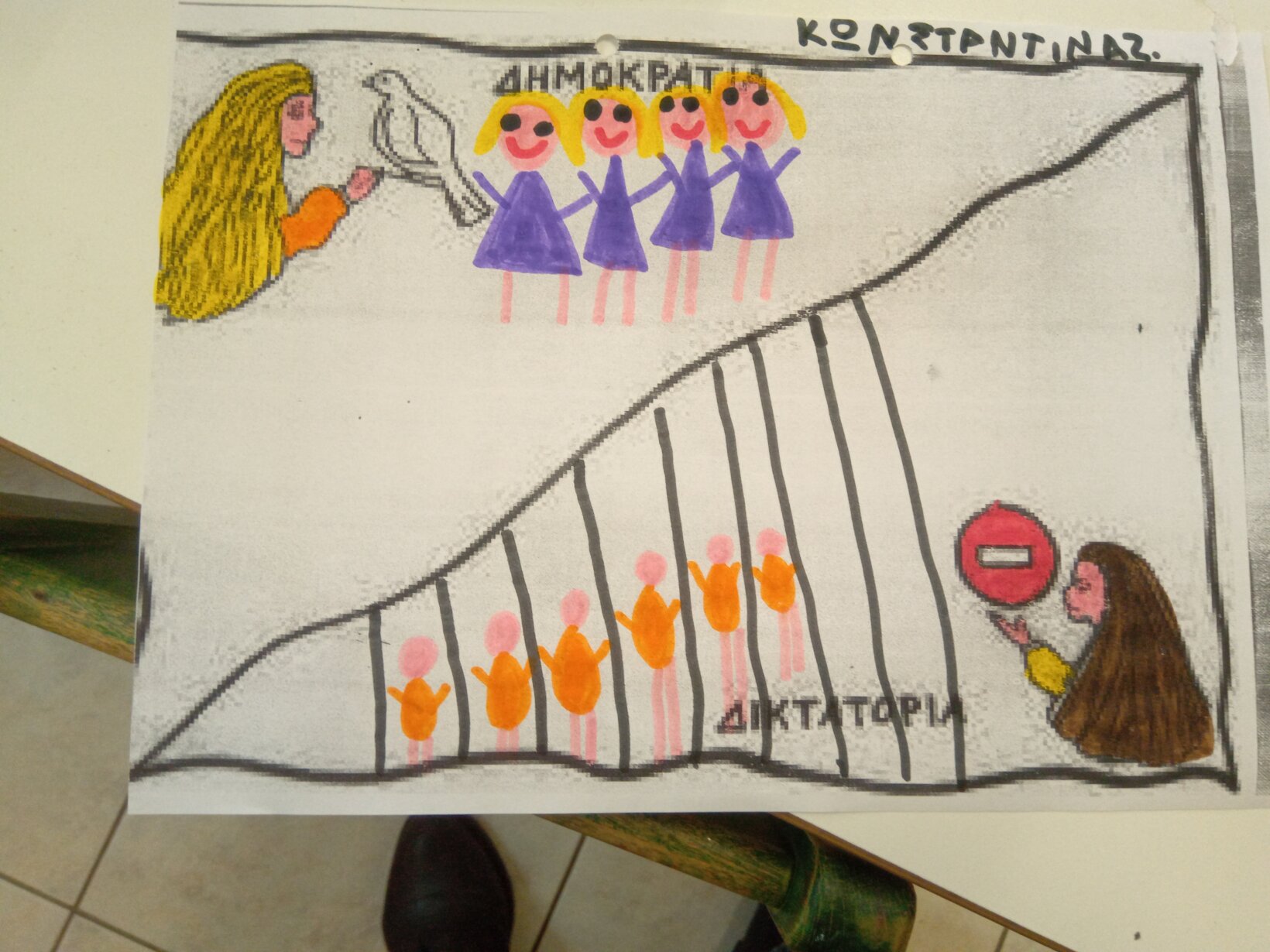 Διαβάσαμε όμως και παραμύθια σχετικά με το θέμα όπως ” Η κυρα -Δημοκρατία” για να ξεχωρίσουμε τις έννοιες ΔΗΜΟΚΡΑΤΙΑ-ΔΙΚΤΑΤΟΡΙΑ και να τις ζωγραφίσουμε όπως τις αντιλαμβανόμαστε