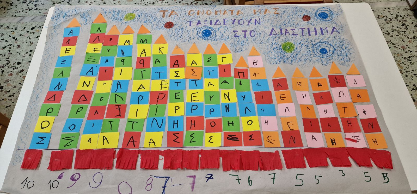 Τις ομαδικές εργασίες τις αγαπάμε πολύ γιατί μας ενώνουν ακόμη περισσότερο σαν ομάδα και καλλιεργούν τη συλλογικότητα… Σήμερα, λοιπόν, ολοκληρώσαμε ακόμη μία ομαδική εργασία! Δημιουργήσαμε τα ονόματά μας, αυτή τη φορά σε σχήμα πυραύλου… Μάθαμε ποιανού όνομα είναι το πιο ψηλό και άρα είναι και αυτό που έχει και τα πιο πολλά γράμματα! Έπειτα, γράψαμε κάτω από κάθε πύραυλο τον δικό του αριθμό γραμμάτων και τους βάλαμε με τη σειρά από το μικρότερο προς το μεγαλύτερο! Σε εμάς βγήκαν πρώτοι οι Αλέξανδροί μας (είναι 2)…. ΦΥΓΑΜΕ ΓΙΑ ΤΟ ΔΙΑΣΤΗΜΑ!