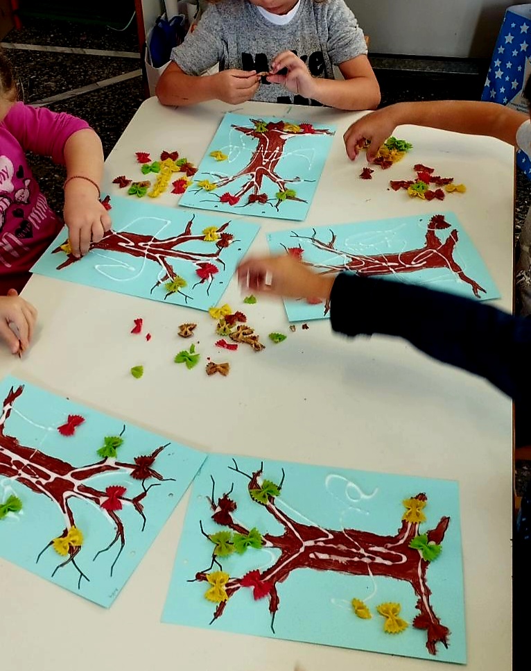 Η έμπνευση για την κατασκευή μας ήρθε από τα βάθη της κουζίνας μας… Βρήκαμε ζυμαρικά τα οποία μπορούν να «μεταμορφωθούν» με λίγη φαντασία σε ζωάκια, δέντρα, ακόμα και στεφάνια… Εμείς τα σκεφτήκαμε ως φύλλα δέντρων!