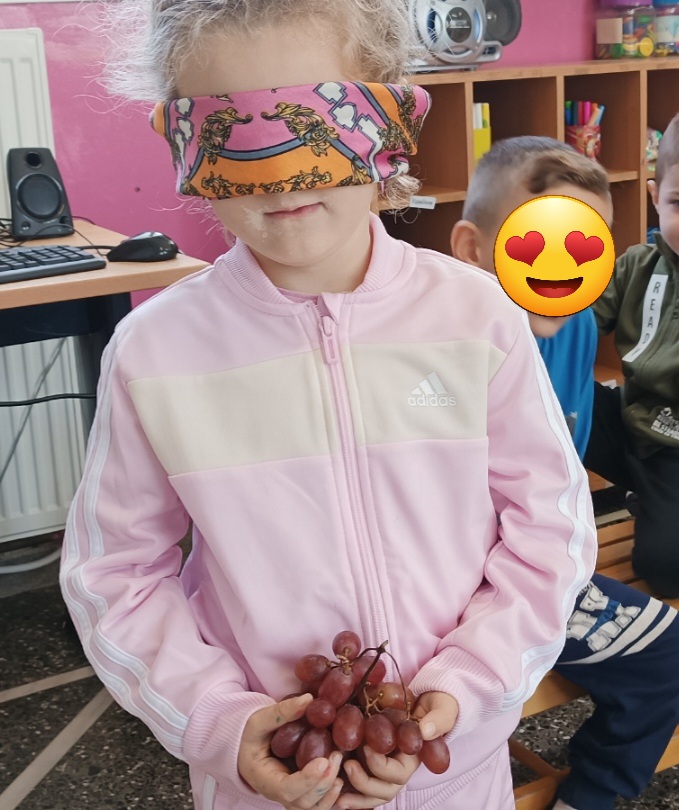 Αφού γνωρίσαμε τα φθινοπωρινά φρουτάκια, η Νηπιαγωγός έκλεισε με τη σειρά τα ματάκια κάθε παιδιού με ένα μαντήλι… Δώσαμε σε κάθε παιδί ένα φρουτάκι και προσπαθούσε να μαντέψει μέσω της αφής ποιο είναι! Ήταν μία άκρως διασκεδαστική δραστηριότητα όπου τα παιδιά συμμετείχαν με έντονο ενδιαφέρον!