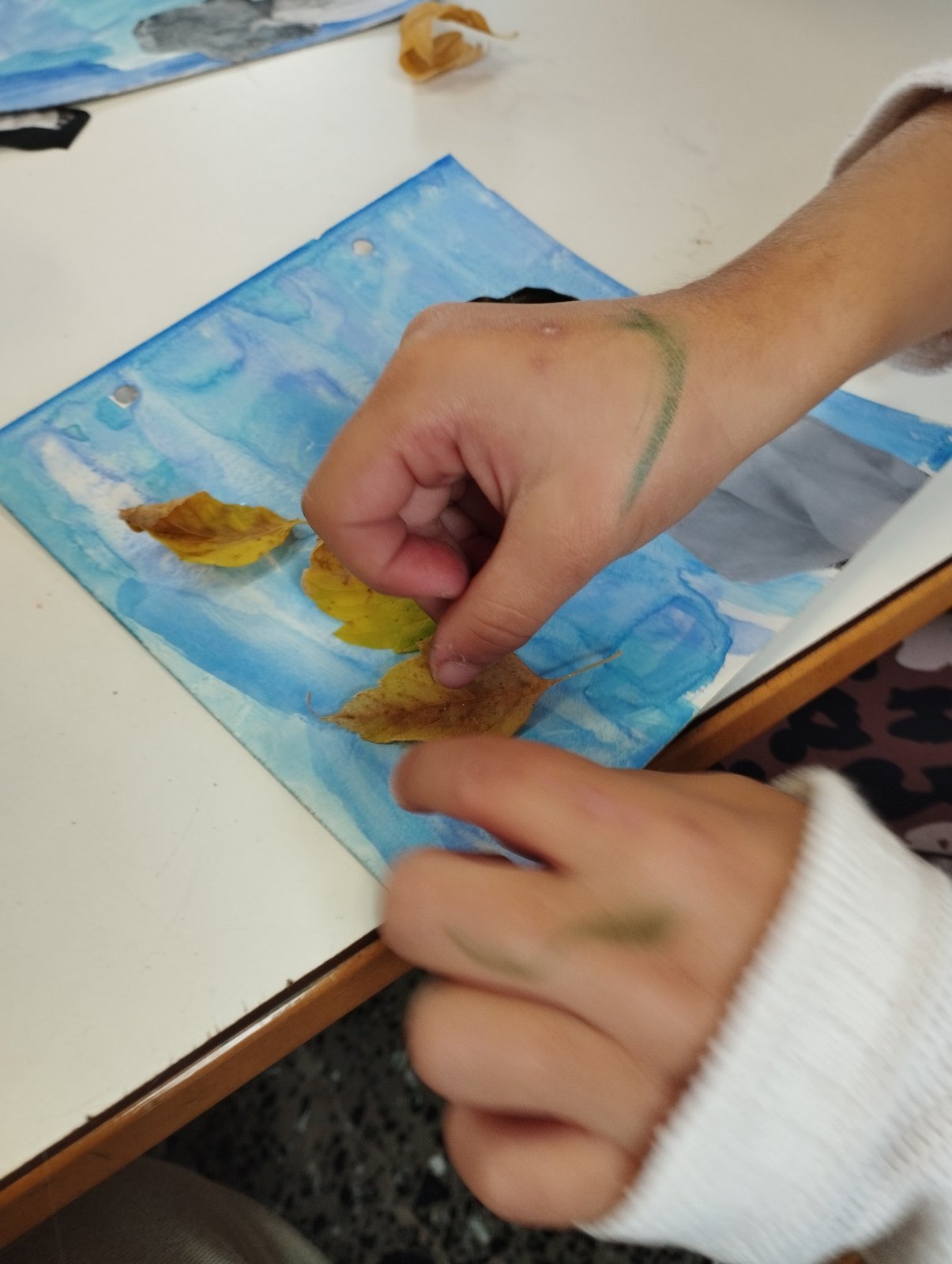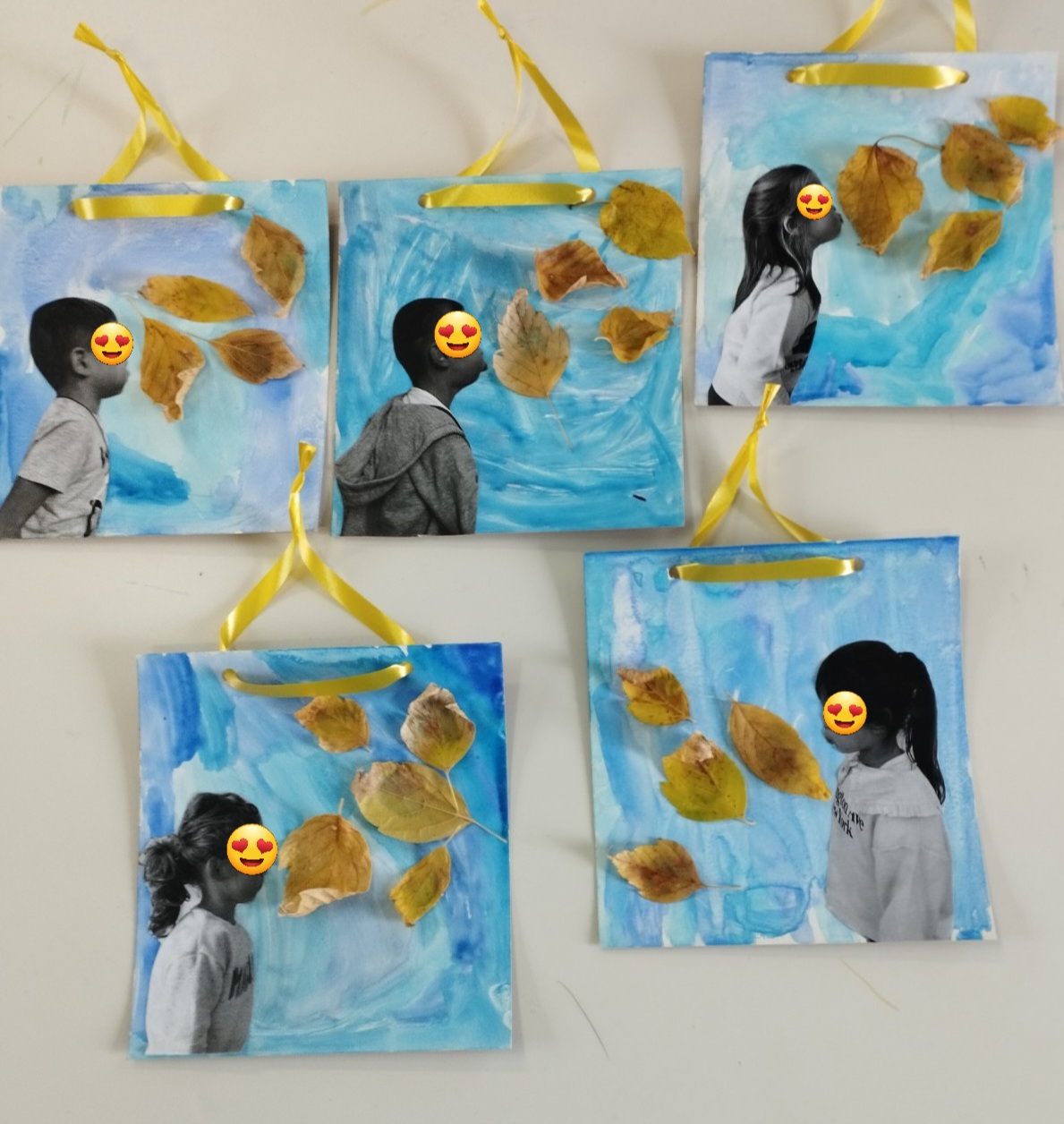 Βρισκόμαστε στον τελευταίο μήνα του φθινοπώρου και η αυλή του σχολείου μας έχει γεμίσει με ξερά φύλλα περισσότερο από κάθε άλλη περίοδο… Οι καθημερινές εικόνες της αυλής καθώς και το ελαφρύ ψυχρό αεράκι μας έδωσαν έμπνευση για μία εικαστική δημιουργία! Τα παιδιά ζωγράφισαν ελεύθερα, σε λευκό χαρτόνι, με νερομπογιές στις αποχρώσεις του μπλε… Όσο τα χαρτονάκια μας στέγνωναν, εμείς ξεχυθήκαμε στην αυλή και μαζέψαμε κίτρινα φύλλα μικρού μεγέθους ώστε να τοποθετηθούν στην δημιουργία μας! Η Νηπιαγωγός είχε φροντίσει να φωτογραφίσει τα παιδιά τα οποία παρίσταναν πως φυσούσαν τα φύλλα…