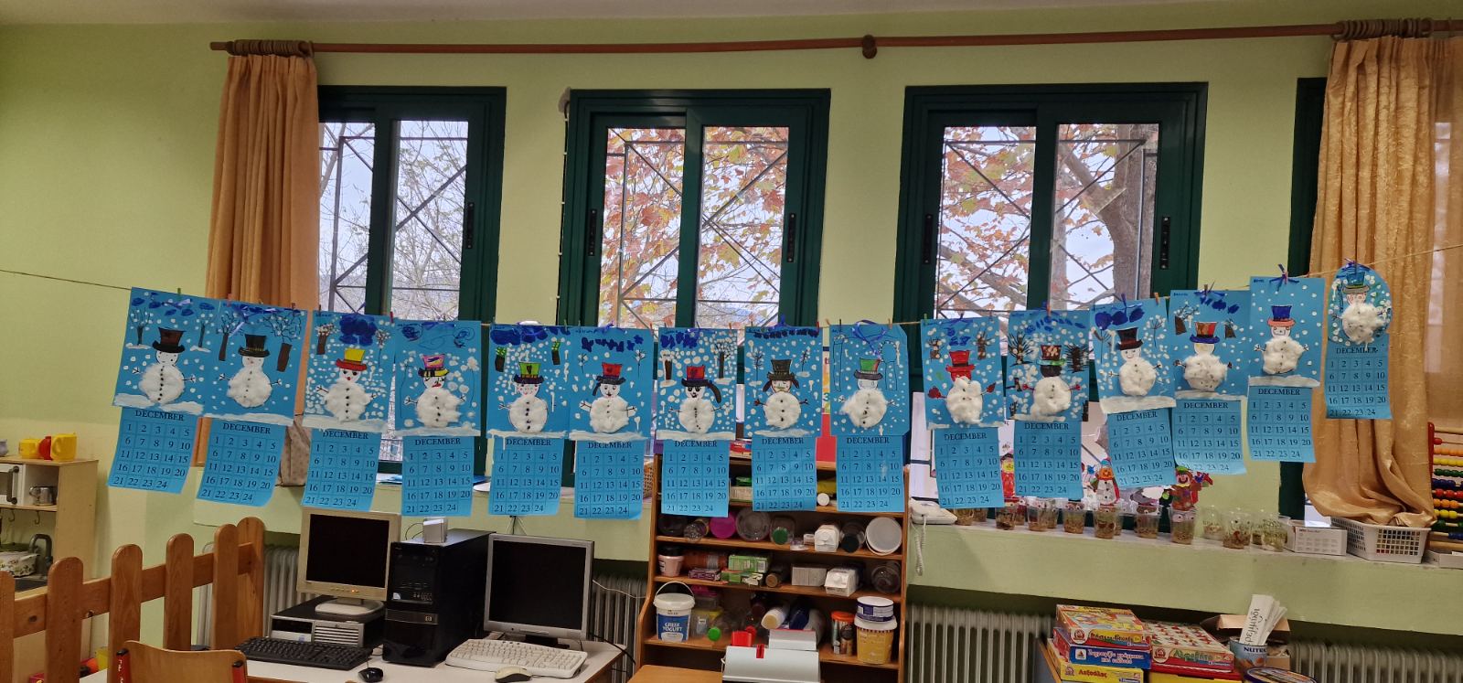 Τα ατομικά μας ημερολόγια είναι έτοιμα! Η Νηπιαγωγός, μας εκτύπωσε το ημερολόγιο του Δεκεμβρίου και τα νηπιάκια μας στο πάνω μέρος δημιούργησαν ένα χιονάνθρωπο! Ζωγραφίσαμε ένα χειμερινό χιονισμένο τοπίο και στο χιονάνθρωπο προσθέσαμε βαμβάκι για ένα τρισδιάστατο αποτέλεσμα… Μετράμε αντίστροφα!
