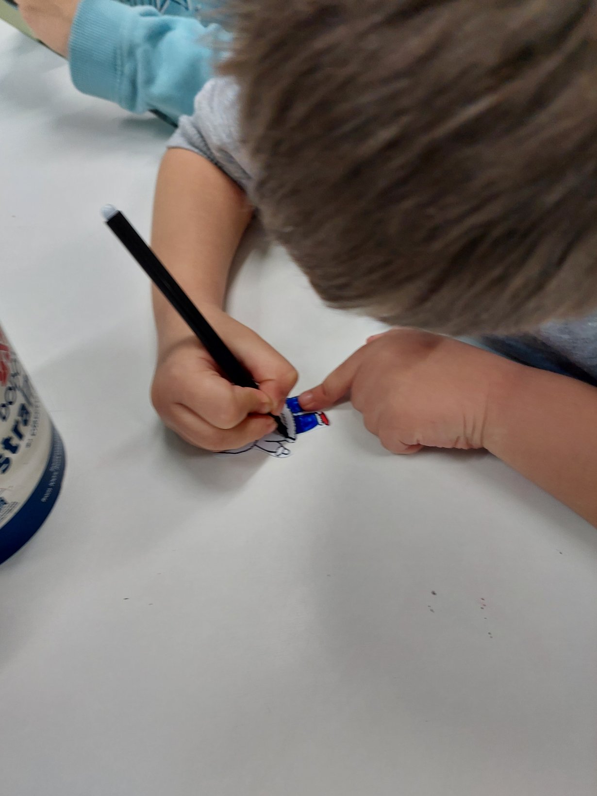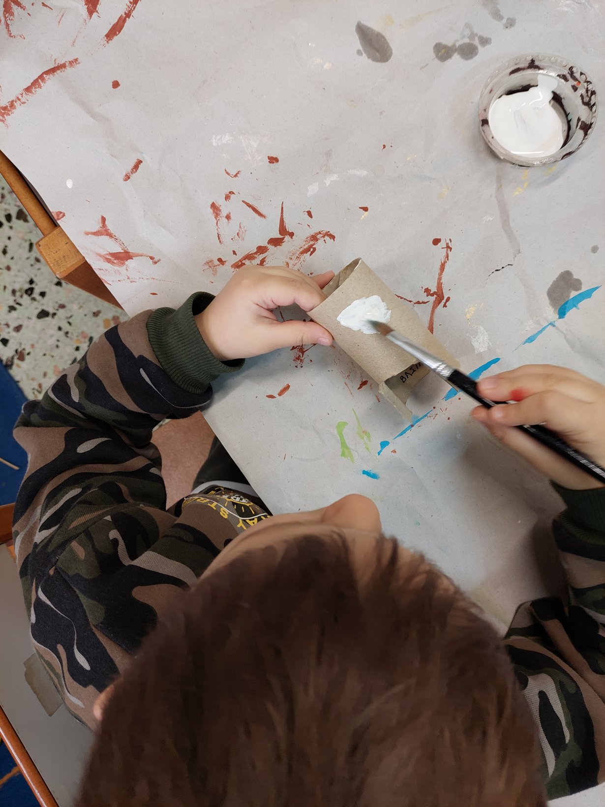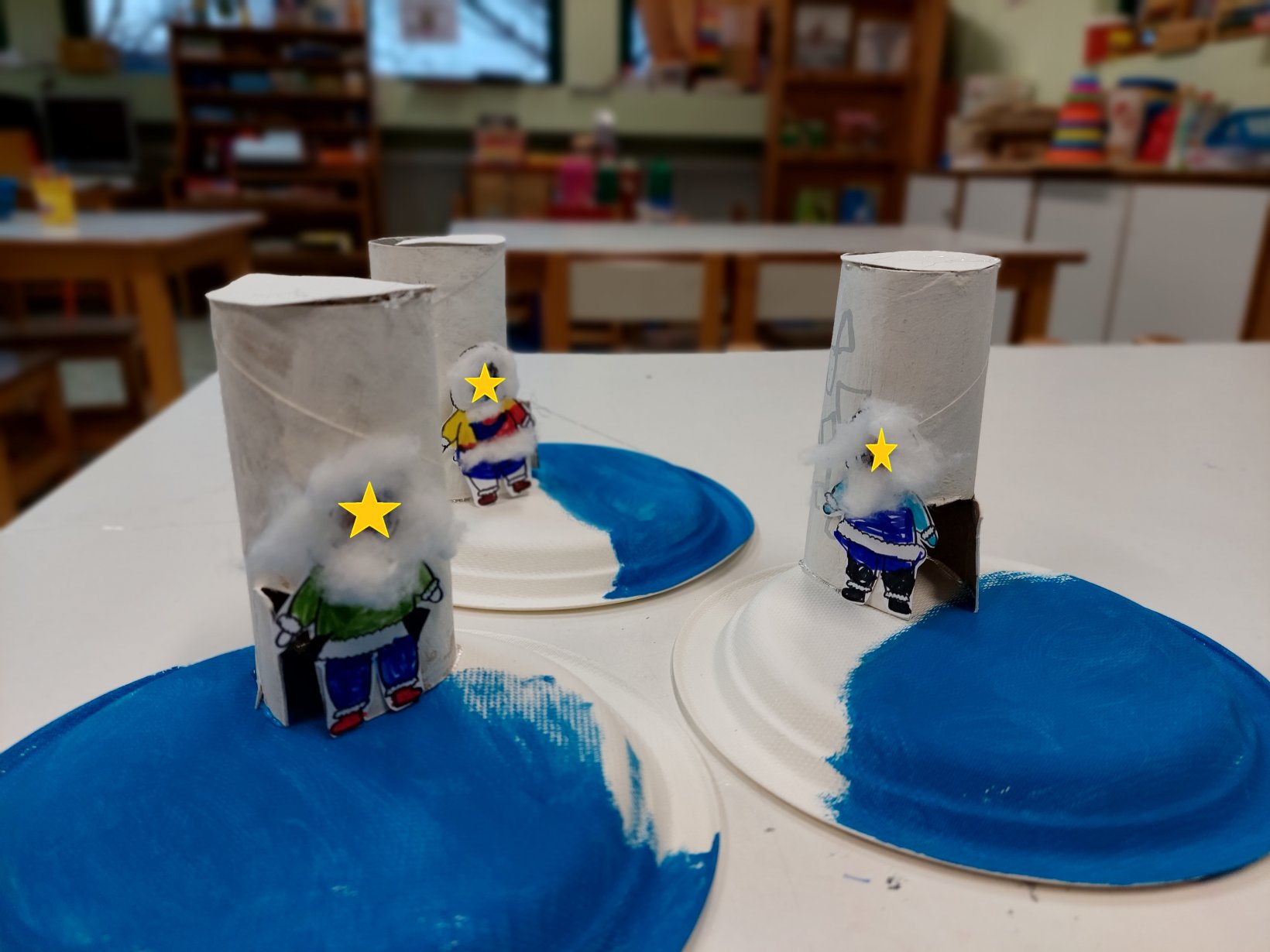 Δημιουργήσαμε κι εμείς, λοιπόν, τα δικά μας ιγκλού με ρολό από χαρτί υγείας το οποίο χρωματίσαμε λευκό και η Νηπιαγωγός χάραξε ένα άνοιγμα το οποίο θα χρησίμευε στην είσοδο των Εσκιμώων στα ιγκλού. Χρωματίσαμε και περίπου μισά από τα χάρτινα πιατάκια σε χρώμα μπλε, ώστε να δείχνει τη θάλασσα και το υπόλοιπο παρέμεινε λευκό ώστε να δείχνει τον πάγο! Η Νηπιαγωγός είχε εκτυπώσει πατρόν Εσκιμώων το οποίο τα παιδιά χρωμάτισαν με μαρκαδόρους και σε κάποια σημεία κόλλησαν βαμβάκι… Το πιο ωραίο, βέβαια, ήταν ότι οι Εσκιμώοι είχαν μπροστά τις φατσούλες των παιδιών… Κάθε παιδί έγινε το ίδιο Εσκιμώος! Τέλος, τα παιδιά έκοψαν ένα κυκλικό σχήμα σε λευκό χαρτόνι κάνσον Α4 ώστε να κλείσουν από πάνω τα ιγκλού τους! Έτοιμα!