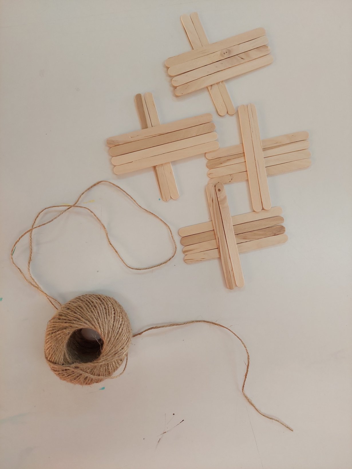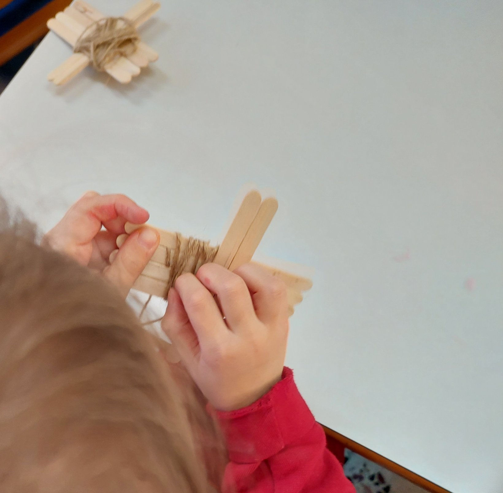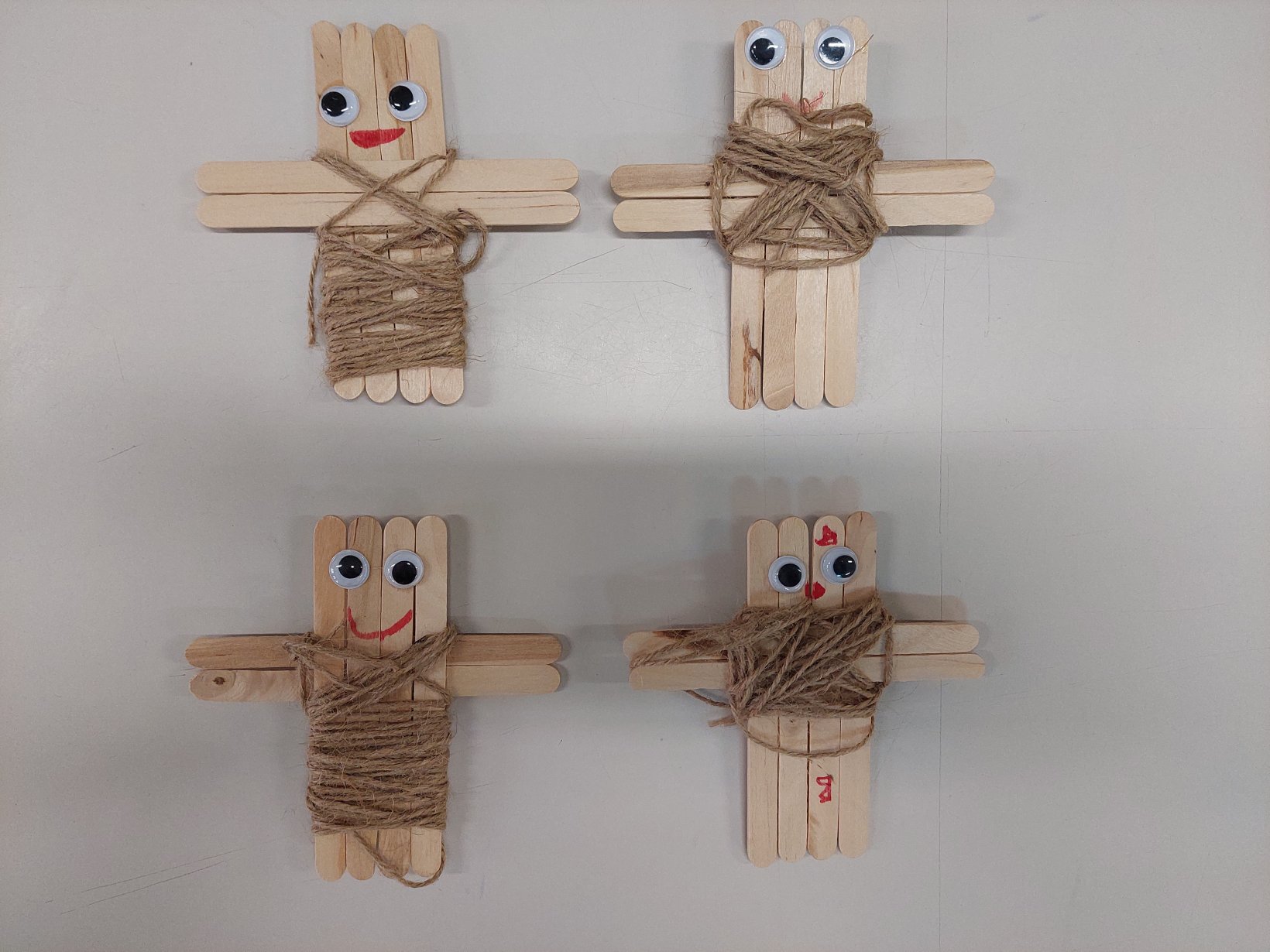 Μία κατασκευή για την τόνωση της λεπτής κινητικότητας εξελίχθηκε τις προηγούμενες ημέρες στο τμήμα μας… Η Νηπιαγωγός, ένωσε 4 λεπτά γλωσσοπίεστρα κάθετα και 2 οριζόντια, ώστε να σχηματίσουν σταυρό και να φαίνεται σαν ανθρώπινο σώμα με χεράκια! Έπειτα, τα παιδιά πήραν από ένα κομμάτι σπάγκο και ξεκίνησαν να τον τυλίγουν γύρω από το ανθρώπινο σωματάκι ώστε το τελικό αποτέλεσμα να θυμίζει ότι φοράει ρούχα! Τέλος, τα παιδιά τοποθέτησαν 3D ματάκια και ένα ζωγραφισμένο στοματάκι στο ανθρωπάκι τους!