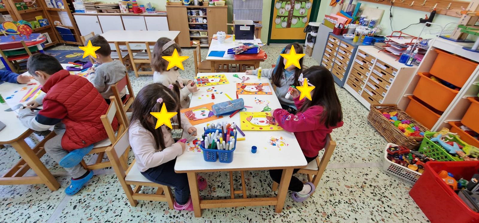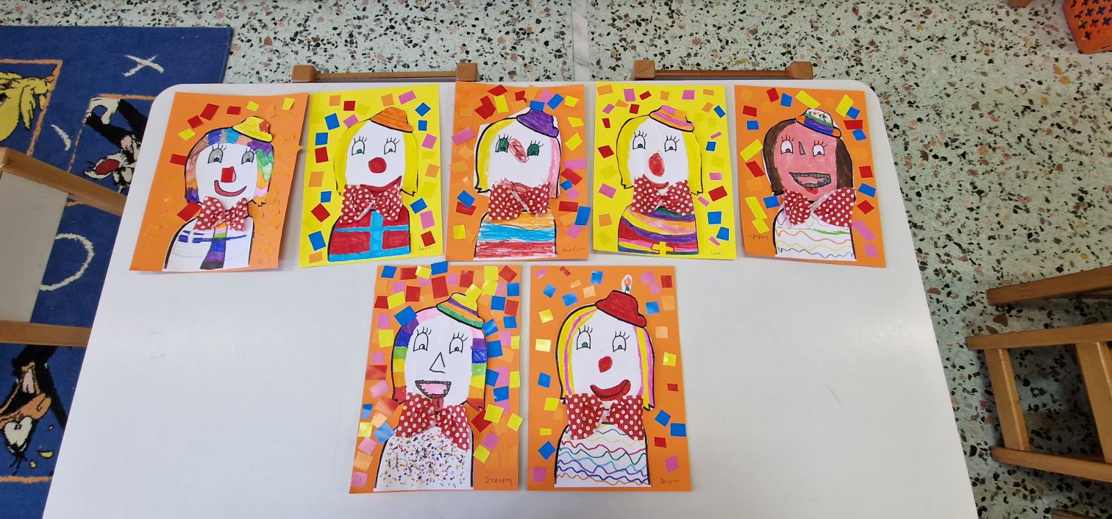 Αρχικά, τα παιδιά έκοψαν ψηφίδες από πολύχρωμα χαρτιά γλασέ… Το κάθε παιδί έφτιαξε τον κλόουν του όπως ακριβώς ήθελε και κόλλησε γύρω του τις ψηφίδες για να φαίνονται σαν κομφετί… Τέλος, προσθέσαμε ένα φιόγκο από πουά χαρτί γκοφρέ!