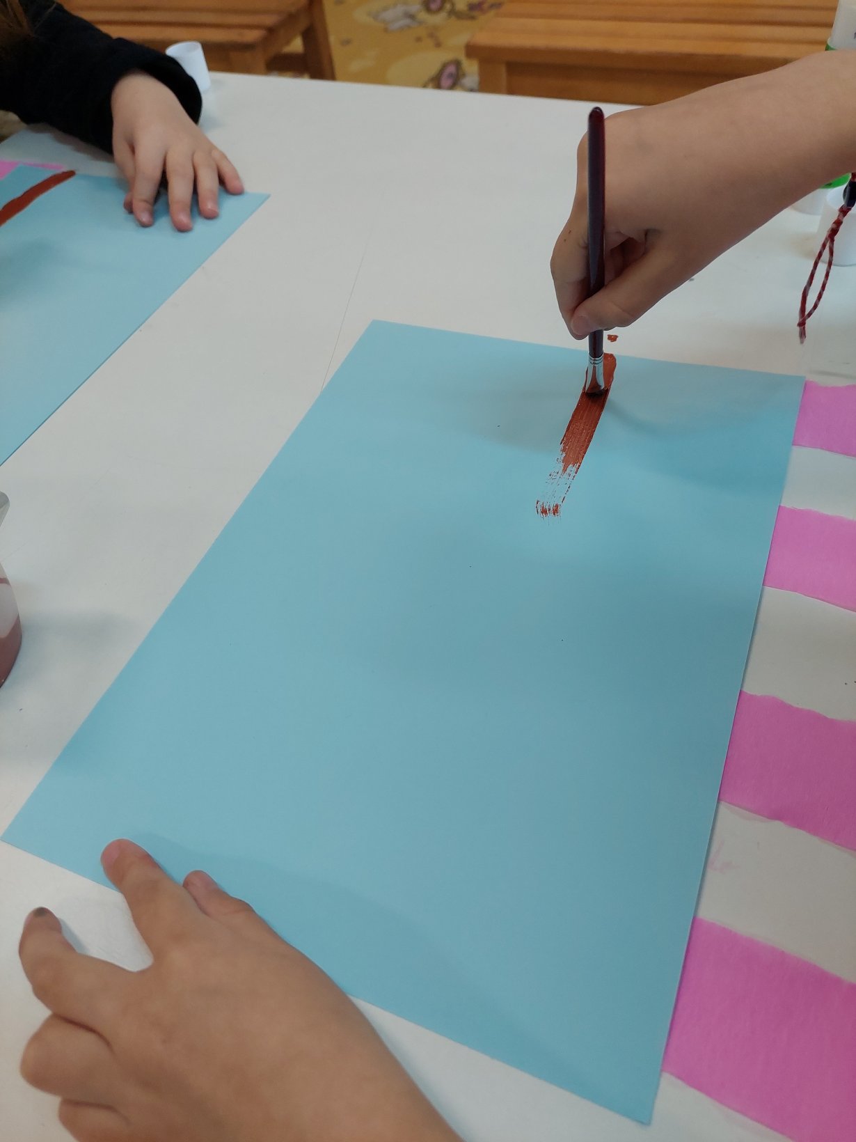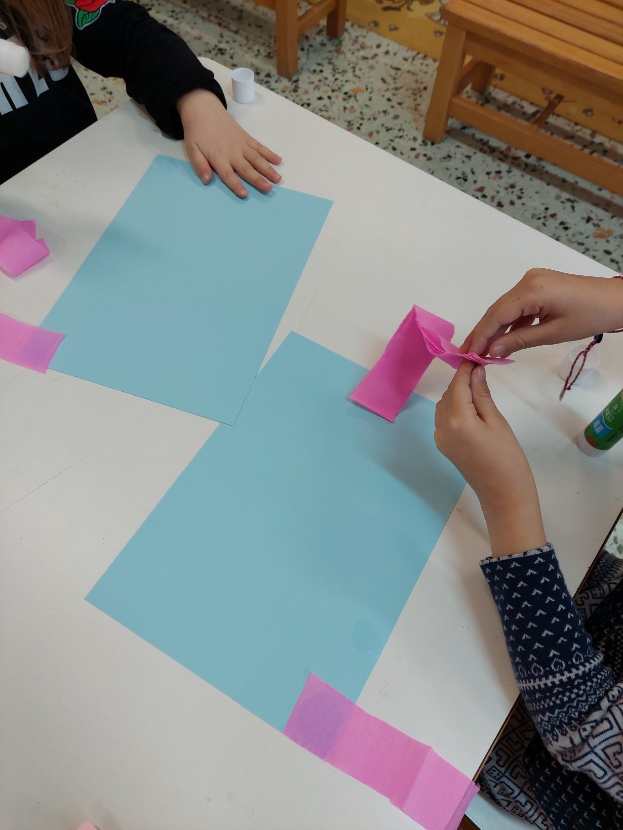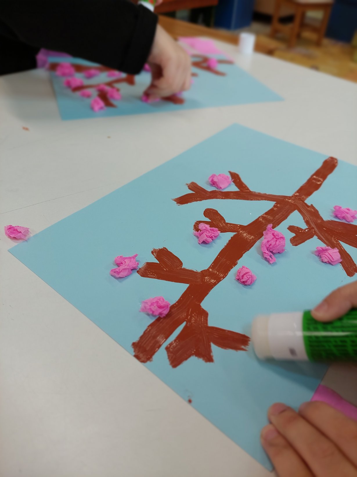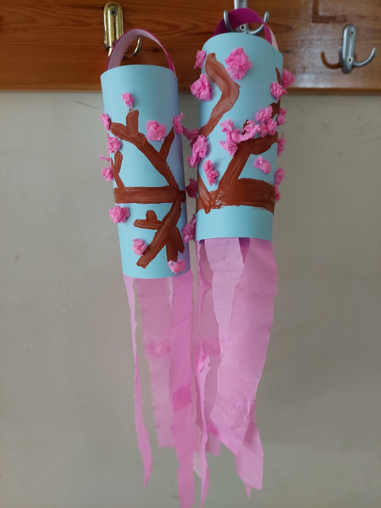 Πήραμε χαρτόνι Α4 γαλάζιου χρώματος και κολλήσαμε στη μία πλευρά λωρίδες από ροζ χαρτί γκοφρέ… Γυρίσαμε από την άλλη το χαρτόνι και συνεχίσαμε σχηματίζοντας τα κλαδιά της κερασιάς με τέμπερα καφέ χρώματος… Έπειτα, κολλήσαμε μπαλάκι από γκοφρέ ροζ χαρτί για να αποτυπώσουμε τα ανθάκια της κερασιάς! Κόψαμε και 2 λωρίδες από ροζ και φουξ χαρτόνι κάνσον για να δημιουργήσουμε το κράτημα του ανεμοδείκτη!