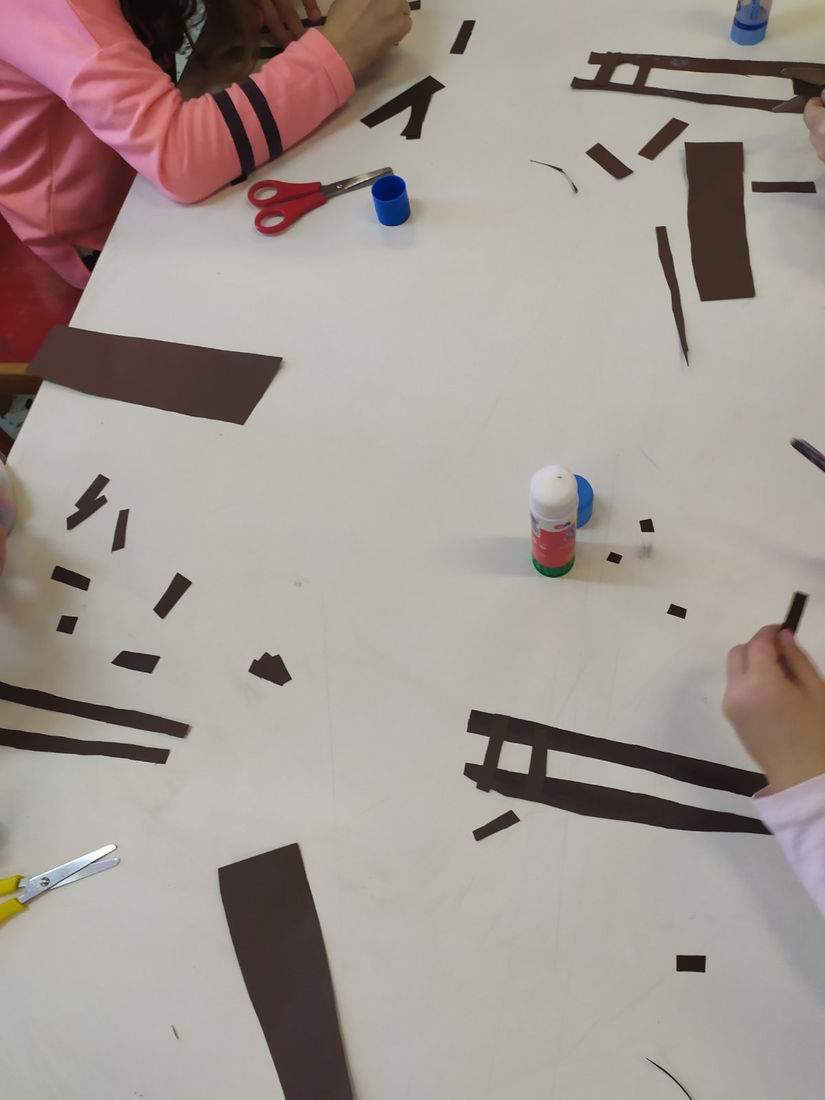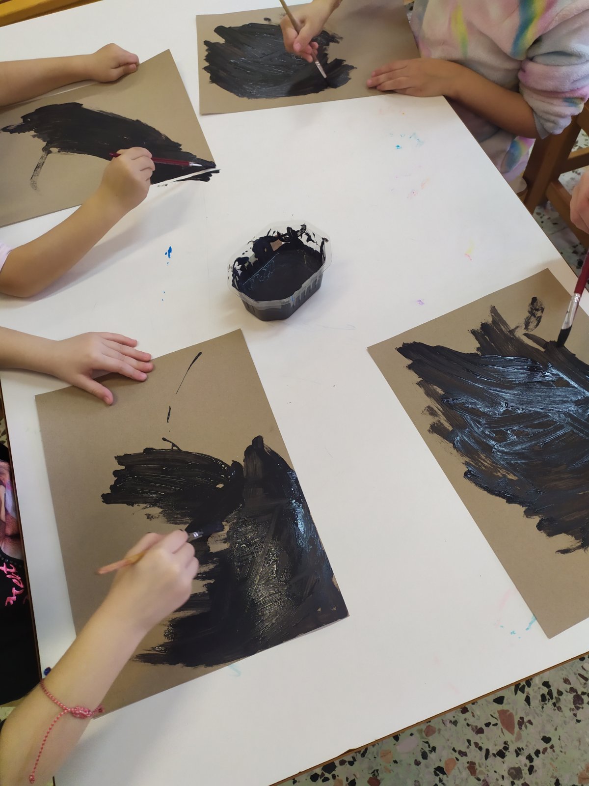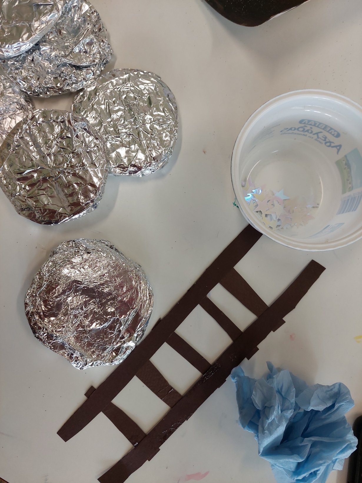 Τα παιδιά, έβαψαν με μαύρο χρώμα τέμπερας ένα χαρτόνι μεγάλου μεγέθους και πρόσθεσαν ασημόσκονη και αστεράκια! Όσο στέγνωναν, τα παιδιά προχώρησαν στην κατασκευή σκάλας από χαρτόνι κάνσον χρώματος πορτοκαλί και καφέ! Έκοψαν κομμάτια τα οποία τα σύνθεσαν και δημιούργησαν το καθένα ξεχωριστά τη δική του μοναδική σκάλα! Η Νηπιαγωγός έφτιαξε τα φεγγαράκια από ανακυκλώσιμο χαρτόνι από κούτες και το “έντυσε” με αλουμινόχαρτο… Ακόμη, εκτύπωσε τις φωτογραφίες των παιδιών! Πάνω ακριβώς από το φεγγάρι προστέθηκε γκοφρέ χαρτί γαλάζιου και μπλε χρώματος ώστε να το σκεπάζει!