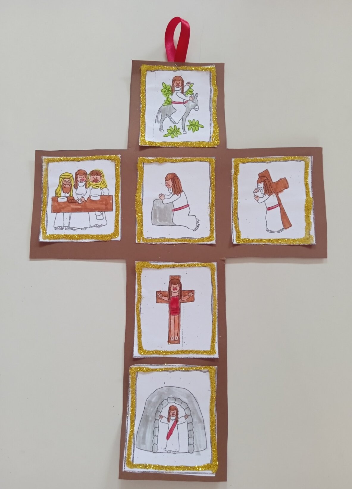 Μέσω αυτών των έξι εικόνων περιγράφεται η ζωή του Ιησού από τη γέννηση μέχρι και την Ανάστασή Του! Έπειτα από τις συζητήσεις που είχαμε στην τάξη μας, δημιουργήσαμε ένα σταυρό από καφέ χαρτόνι κάνσον και τα παιδιά ζωγράφισαν και σειροθέτησαν τις εικόνες που δείχνουν τη ζωή του Χριστού μας! Η κατασκευή ολοκληρώθηκε με λίγη χρυσόσκονη γύρω από κάθε εικόνα!