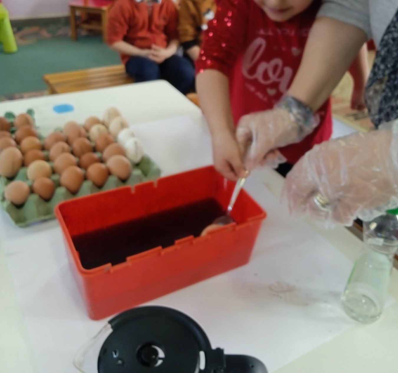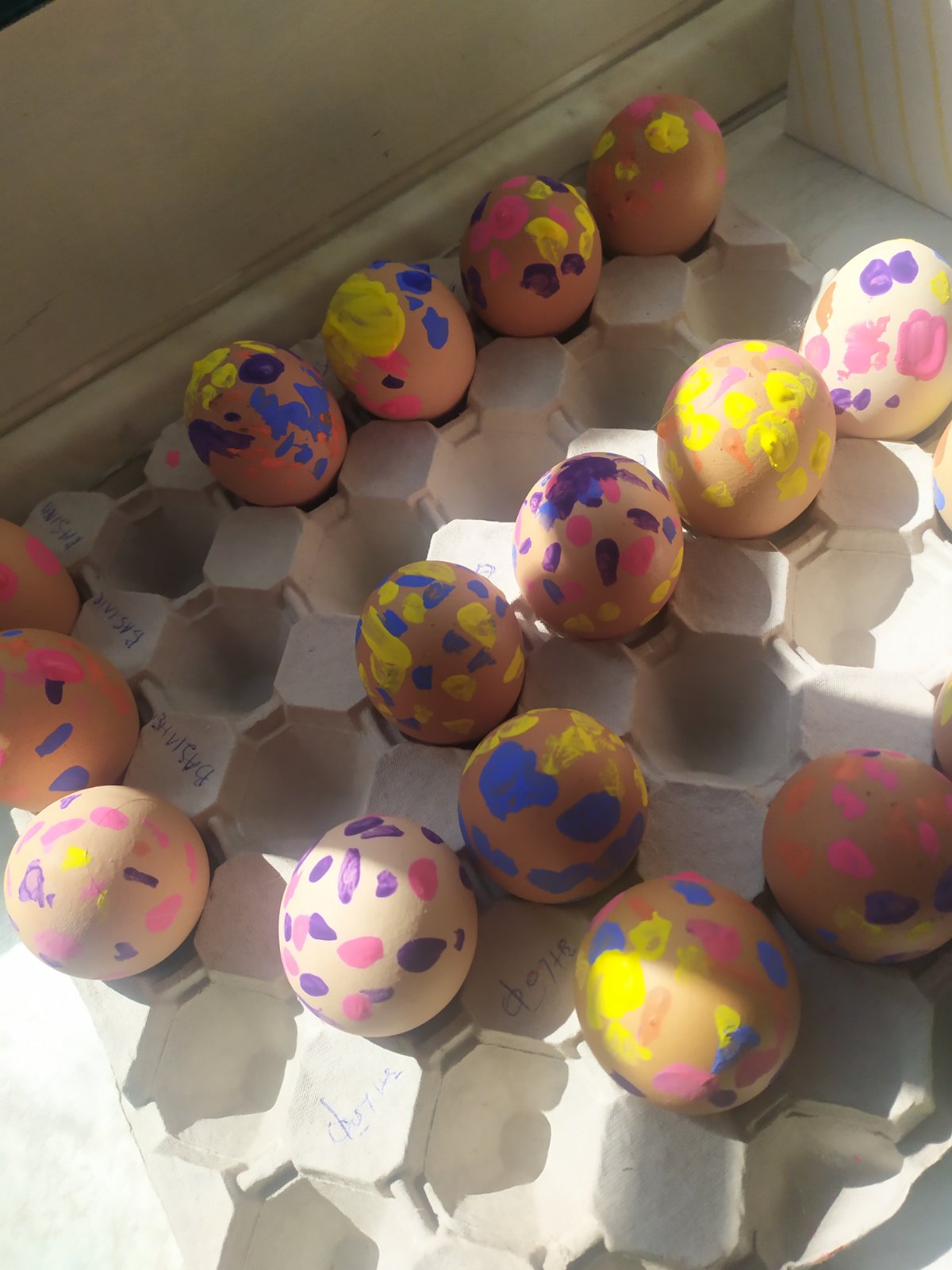 Ζητήσαμε από τους γονείς να μας φέρουν βρασμένα αβγουλάκια και τηρήσαμε το έθιμο της βαφής τους τόσο παραδοσιακά όσο και μοντέρνα! Βάψαμε κάποια κόκκινα με τη βαφή των αβγών και μιλήσαμε για τον συμβολισμό αυτού του εθίμου… Κάποια άλλα τα σχεδιάσαμε ελεύθερα με τέμπερες διαφόρων χρωμάτων! Το κάθε ένα είχε τη χάρη του!