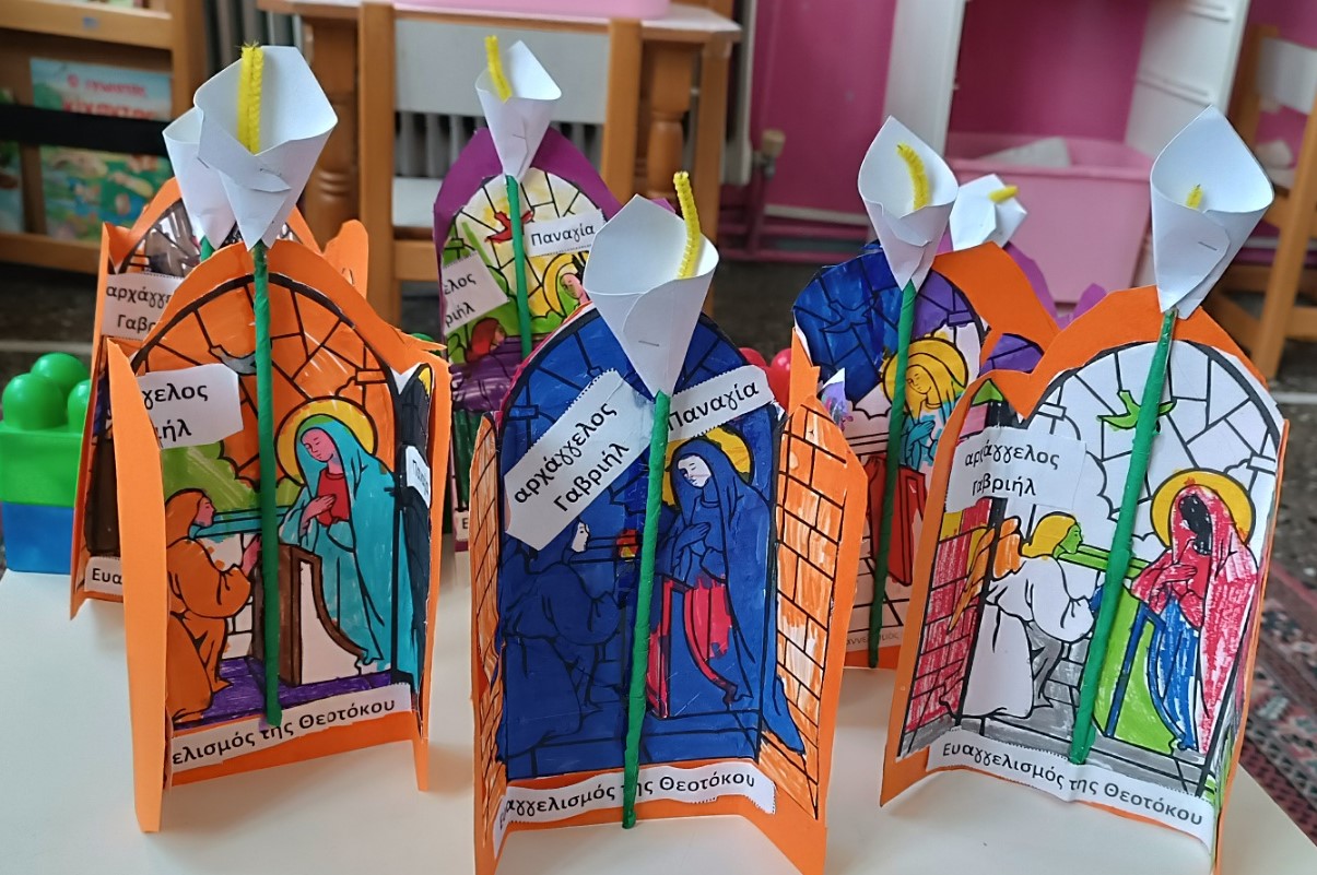 Με την λέξη Ευαγγελισμός αναφερόμαστε στη χαρμόσυνη είδηση για τον Χριστιανισμό, της επικείμενης γέννησης του Ιησού Χριστού, που δόθηκε από τον αρχάγγελο Γαβριήλ προς την Παναγία μας! Η 25η Μαρτίου είναι διπλή γιορτή για την Ελλάδα μας… Συζητήσαμε για την αναγγελία της γέννησης του Χριστούλη μας και αποτυπώσαμε σε κατασκευή αυτή την περιγραφή! Σε πορτοκαλί & μωβ χαρτόνι κάνσον, η Νηπιαγωγός πατρόναρε το εξωτερικό μέρος της “εικόνας” την οποία τα παιδιά έκοψαν… Τα νηπιάκια μας, ζωγράφισαν, έκοψαν και κόλλησαν πάνω στο χαρτόνι τον Αρχάγγελο Γαβριήλ και την Παναγία μας καθώς και τα ονόματά τους! Τέλος, με σύρμα πίπας δημιούργησαν το κλωνάρι του κρίνου… Η Νηπιαγωγός το ολοκλήρωσε τοποθετώντας το λευκό μέρος του λουλουδιού!