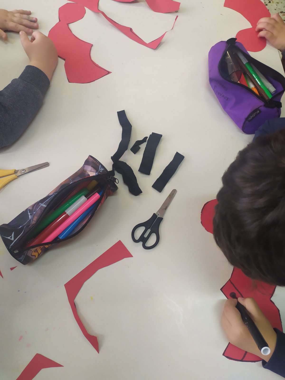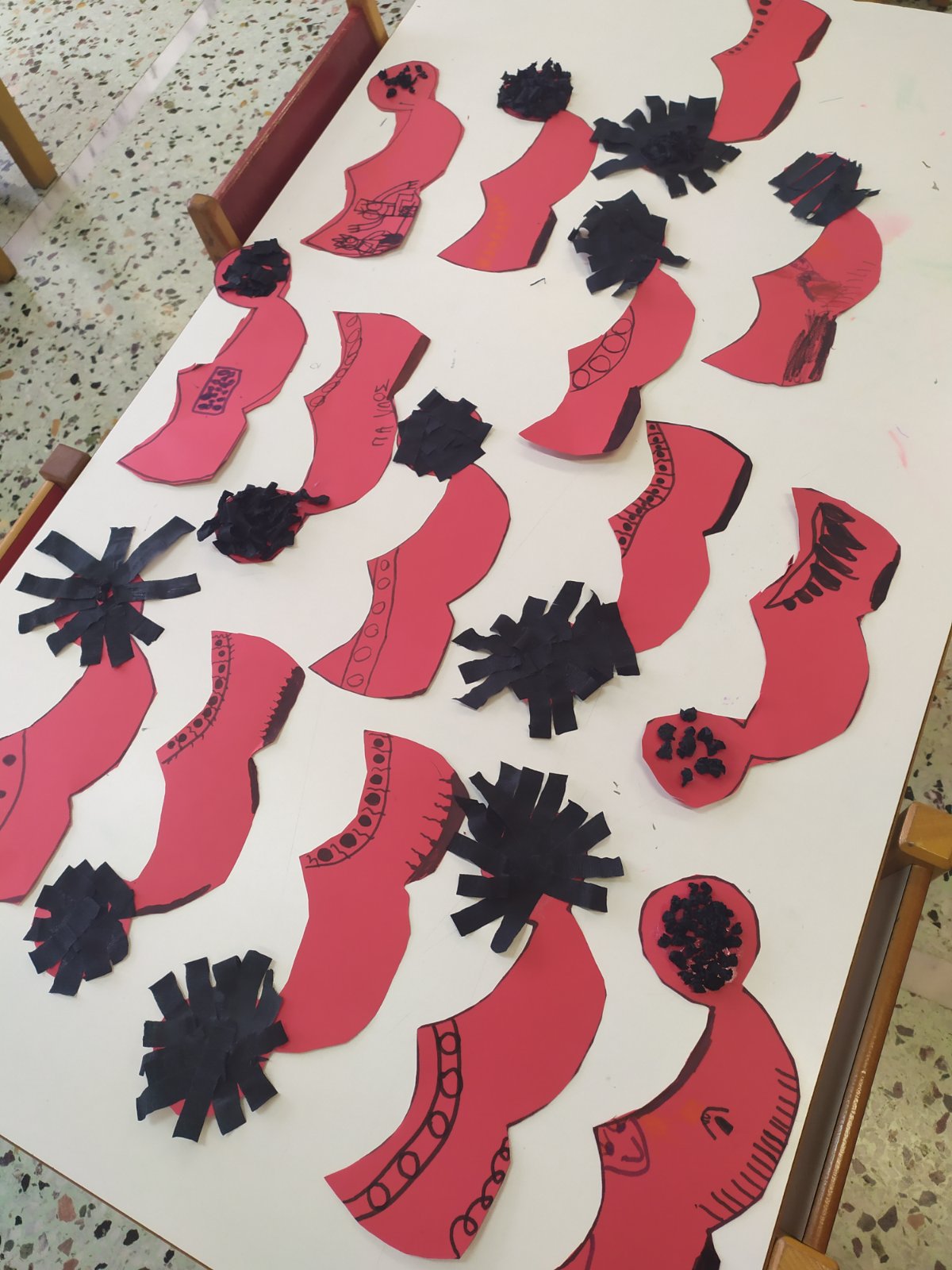 Από ένα σωστό τσολιά δεν λείπει ποτέ το φεσάκι του και τα τσαρούχια του! Η Νηπιαγωγός κατασκεύασε τα φεσάκια και τα παιδιά επιμελήθηκαν τα τσαρουχάκια! Σε κόκκινο χαρτόνι κάνσον, η Νηπιαγωγός πατρόναρε το τσαρούχι και τα παιδιά το έκοψαν… Έπειτα, κόλλησαν μαύρο γκοφρέ χαρτί είτε σε μορφή “μπαλάκι” είτε ανοιχτό στην μύτη του τσαρουχιού! Έτοιμοι για παρέλαση!