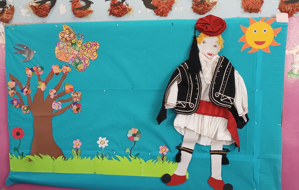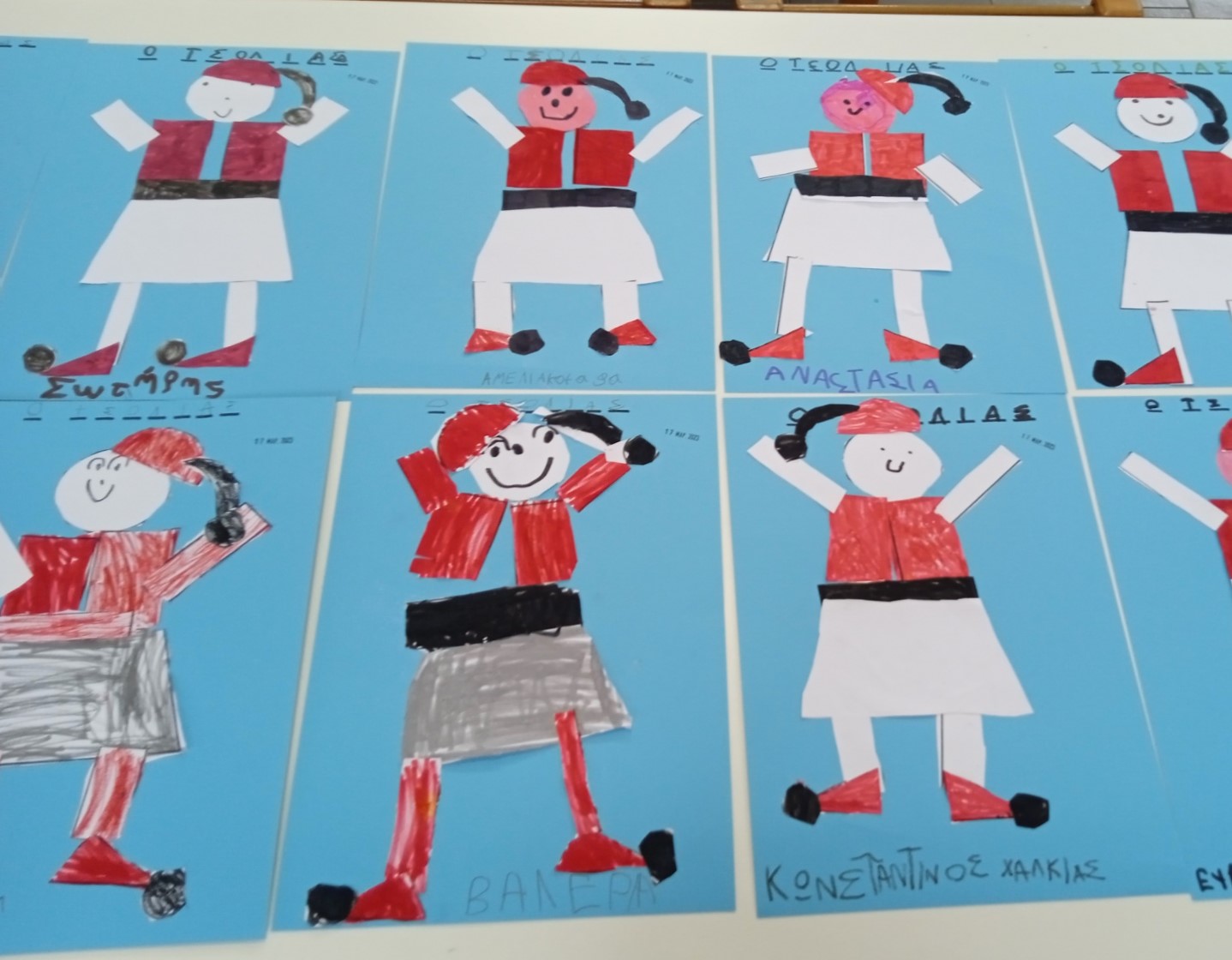 Η πρώτη νύξη για την εθνική επέτειο της 25ης Μαρτίου ξεκίνησε! Μιλήσαμε για τη τιμημένη στολή του τσολιά και φτιάξαμε μία ομαδική κατασκευή για να στολίσουμε την τάξη μας! Ο συμμαθητής μας ξάπλωσε σε χαρτόνι κάνσον για να πατρονάρουμε το σώμα του και με αυτό τον τρόπο να δημιουργήσουμε το σώμα του τσολιά! Διαμορφώσαμε το το πρόσωπο και τα μαλλιά του τσολιά και έπειτα, προσθέσαμε τα απαραίτητα αξεσουάρ του (τσαρούχια, φουστανέλα, γιλέκο κ.τ.λ)! Τέλος, τον τοποθετήσαμε σε ένα ανοιξιάτικο τοπίο όπως επιβάλλει η εποχή!