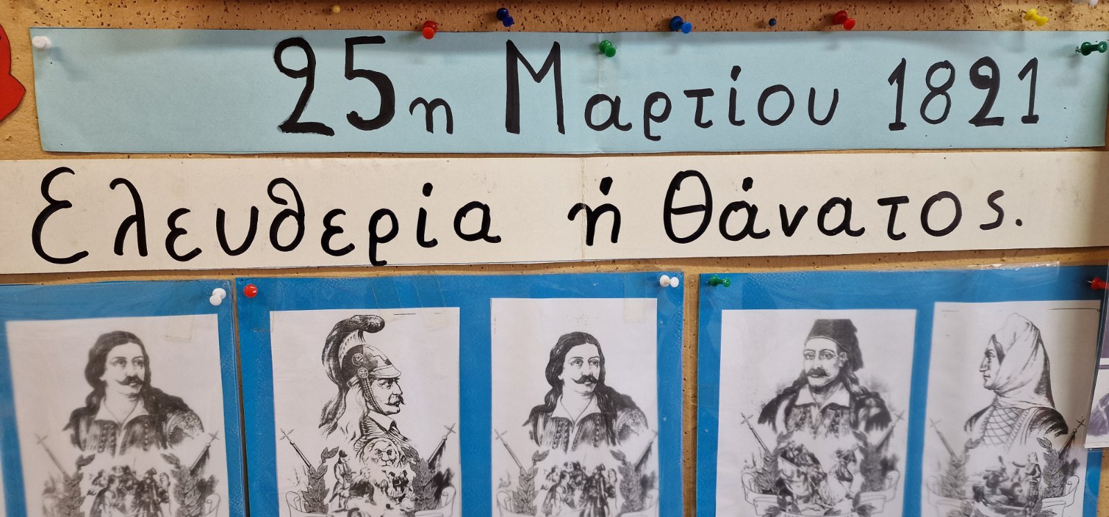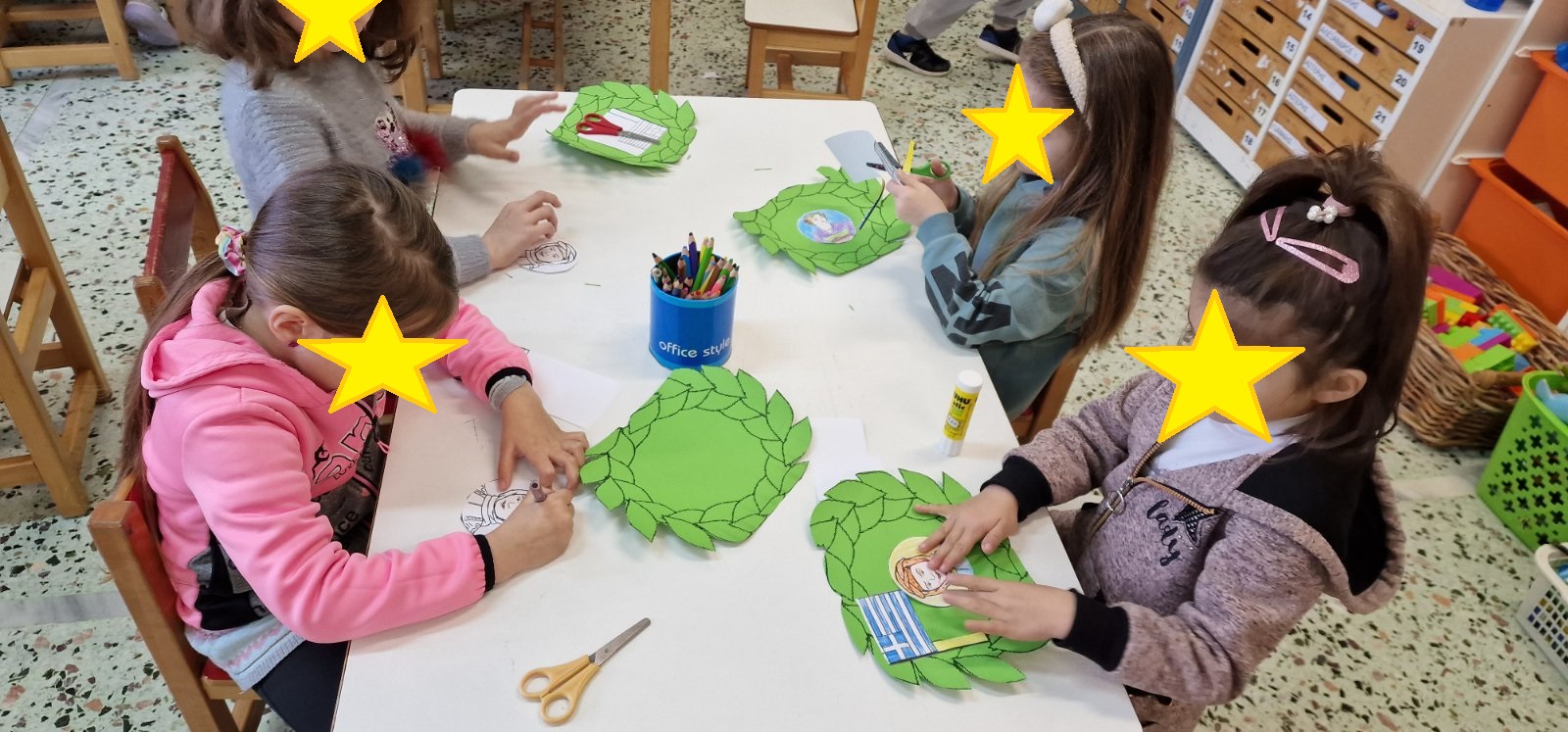 Ποιοι/-ες ήταν εκείνοι/-ες οι γενναίοι/-ες πολεμιστές/-στριες που υπέρ πατρίδας, θρησκείας και οικογένειας ανάκτησαν την Ελευθερία τους; Με αφορμή αυτές τις σπουδαίες προσωπικότητες κόψαμε στεφανάκια τα οποία ήταν εκτυπωμένα σε πράσινο χαρτόνι κάνσον… Ζωγραφίσαμε την ελληνική σημαία καθώς και έναν ήρωα ή μία ηρωίδα ο καθένας μας και τα κολλήσαμε στο στεφανάκι! Ολοκληρώσαμε την κατασκευή μας με τον στίχο από τον “Θούριο” του Ρήγα…