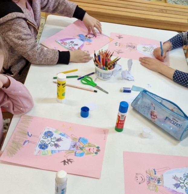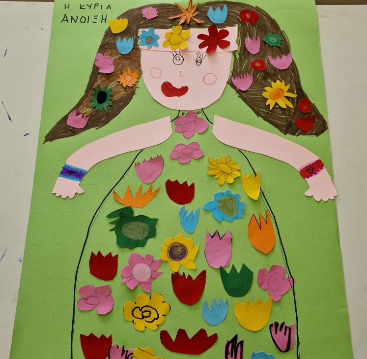 Η Νηπιαγωγός σχημάτισε το σώμα της αγαπημένης μας κυρίας “Άνοιξης” και τα παιδιά δημιούργησαν, ομαδικά, με βελουτέ χαρτί διάφορα λουλουδάκια τα οποία τα κόλλησαν σε όλο της το σώμα! Η κυρία “Άνοιξη” έδωσε χρώμα και χαρά στην τάξη μας και στολίστηκε ώστε να την βλέπουμε και να την καμαρώνουμε όλοι και όλες!
