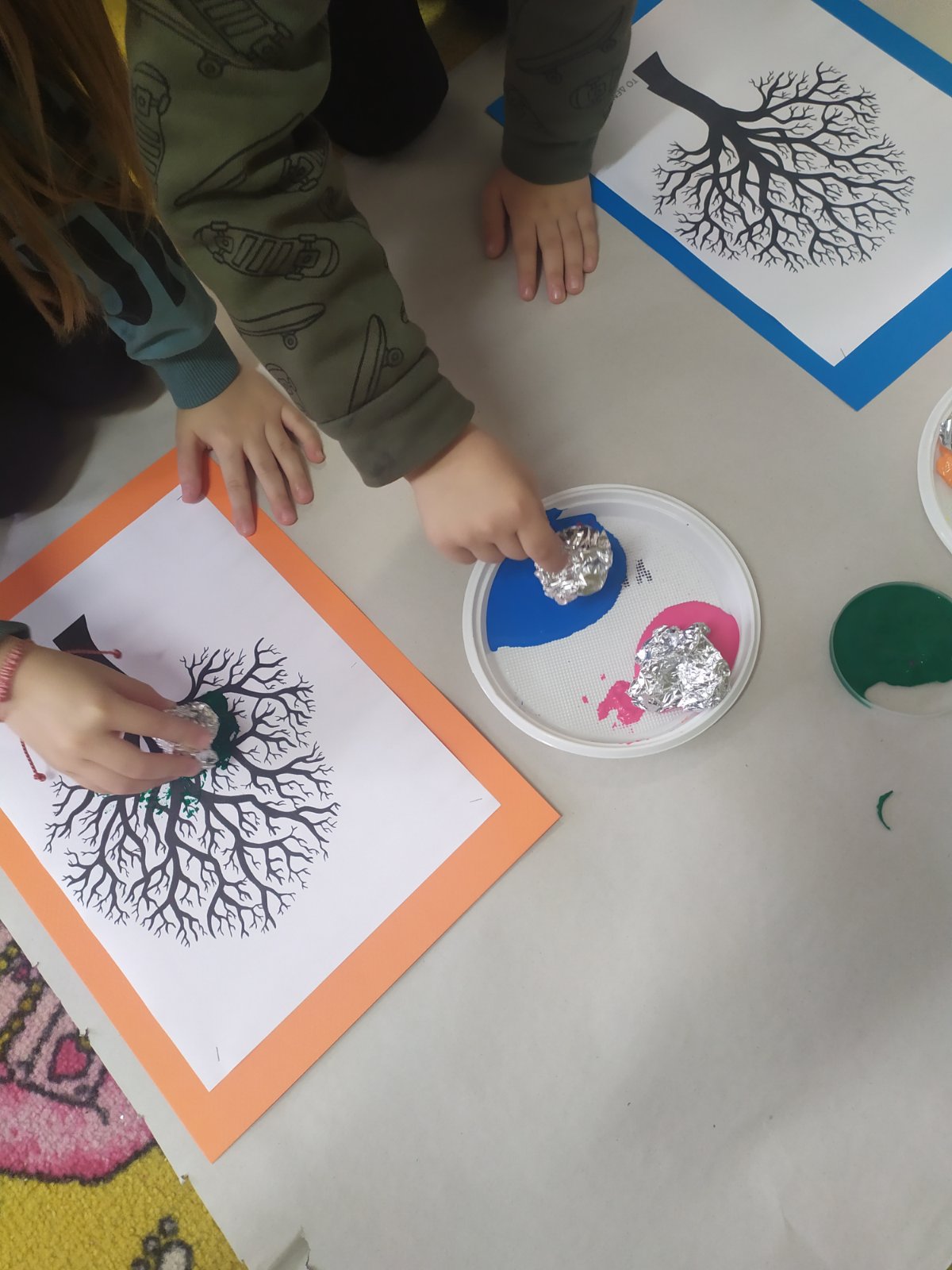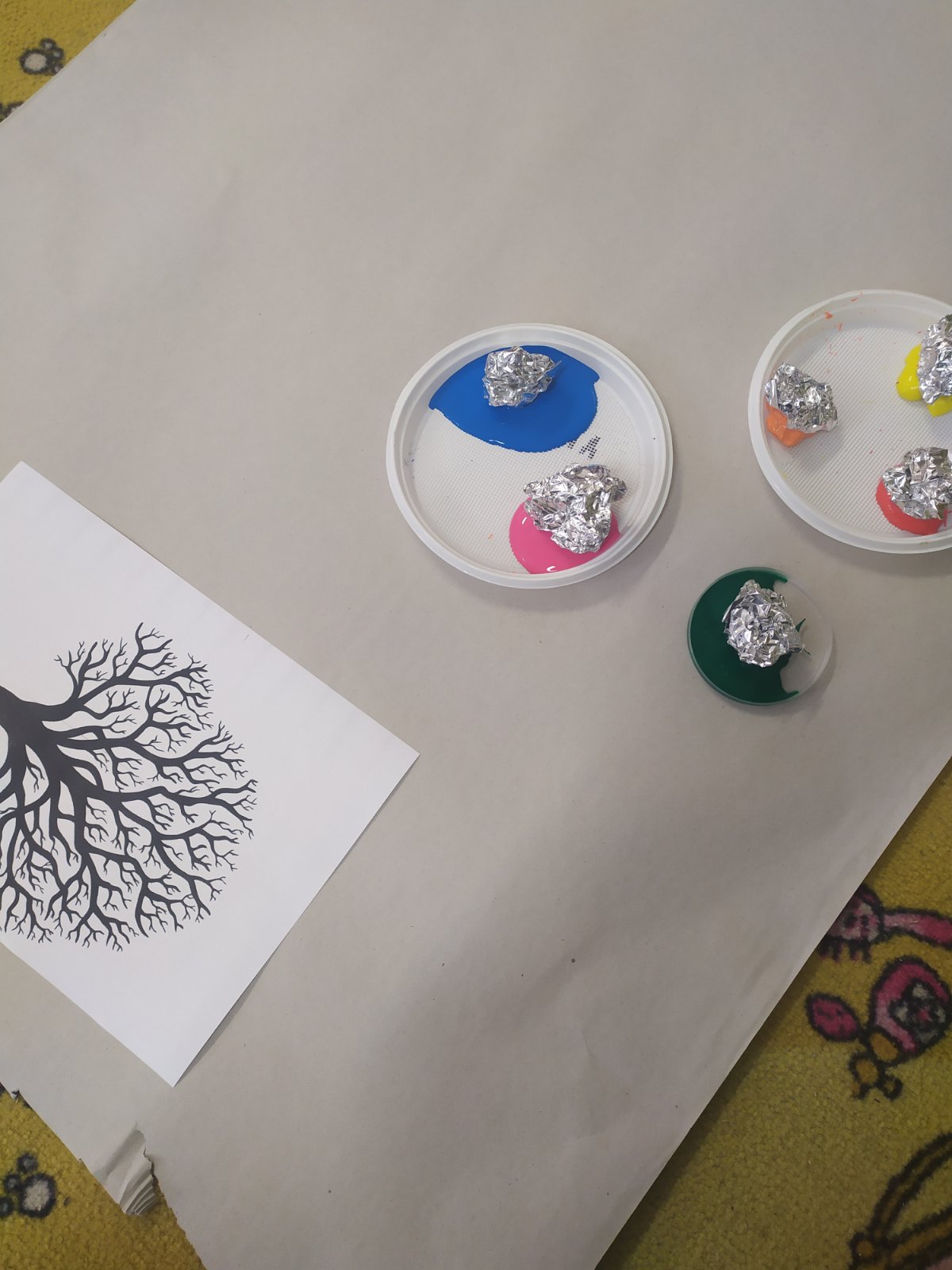 Φτιάξαμε ακόμη ένα δεντράκι, αυτή τη φορά με αποτυπώματα από αλουμινόχαρτο! Η Νηπιαγωγός, έφτιαξε κάποια μπαλάκια με τσαλακωμένο αλουμινόχαρτο και τοποθέτησε ένα σε κάθε χρώμα τέμπερας… Τα παιδιά βουτούσαν τα μπαλάκια αλουμινόχαρτου στα χρώματα και έφτιαχναν αποτυπώματα πάνω σε ένα εκτυπωμένο “γυμνό” δέντρο! Μας συνεπήρε η Άνοιξη και προσθέσαμε παραπάνω χρώματα από αυτά που συνηθίζουμε στα δεντράκια αυτή την εποχή! Όπως και να έχει το ευχαριστηθήκαμε και μας άρεσαν πολύ!