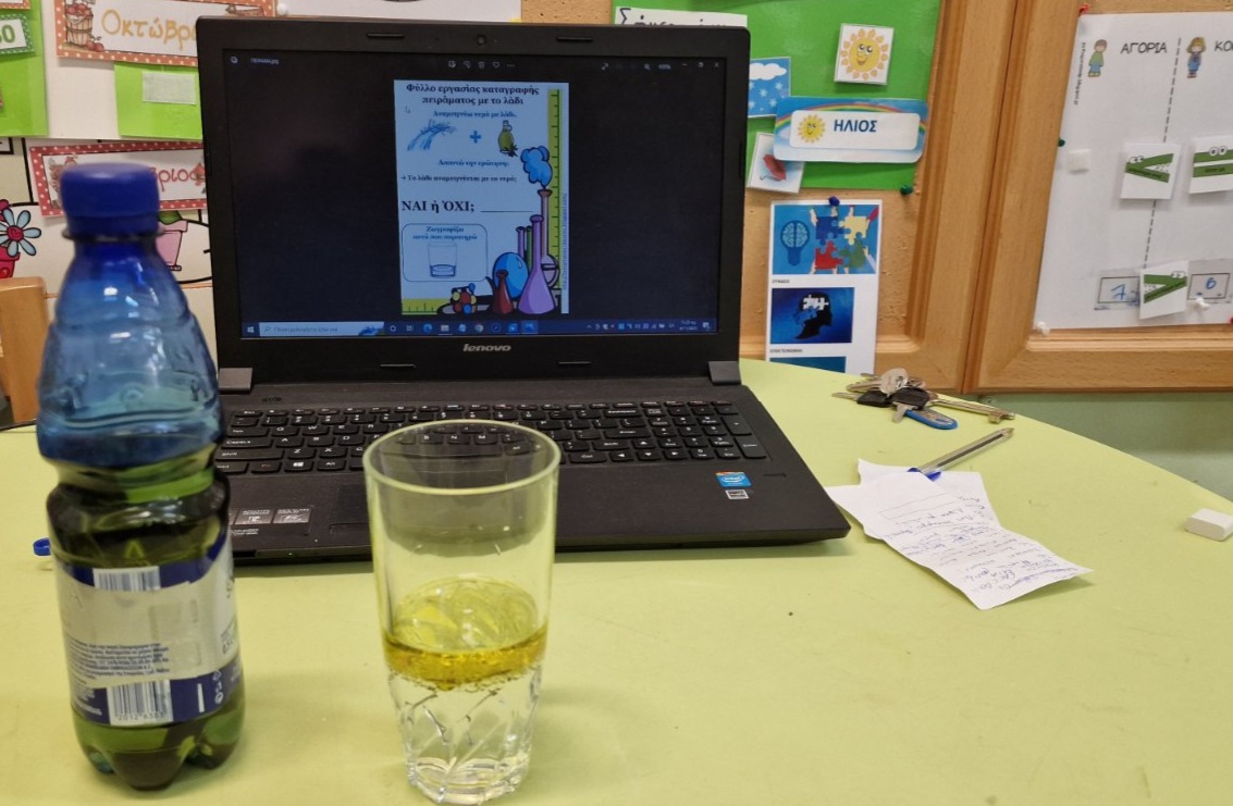 Σήμερα, εφαρμόσαμε μία ιδέα της Τάνιας Μάνεση κάνοντας ένα πείραμα για τη διαλυτότητα… Αναμείξαμε λάδι με νερό και είδαμε τι συνέβη..! Τα παιδιά παρατήρησαν πως το λάδι δεν αναμειγνύεται με το νερό όπως επίσης και ότι το λάδι στέκεται στην επιφάνεια του νερού! Η διαδικασία ήταν πολύ ενδιαφέρουσα και προσέλκυσε τα παιδιά!