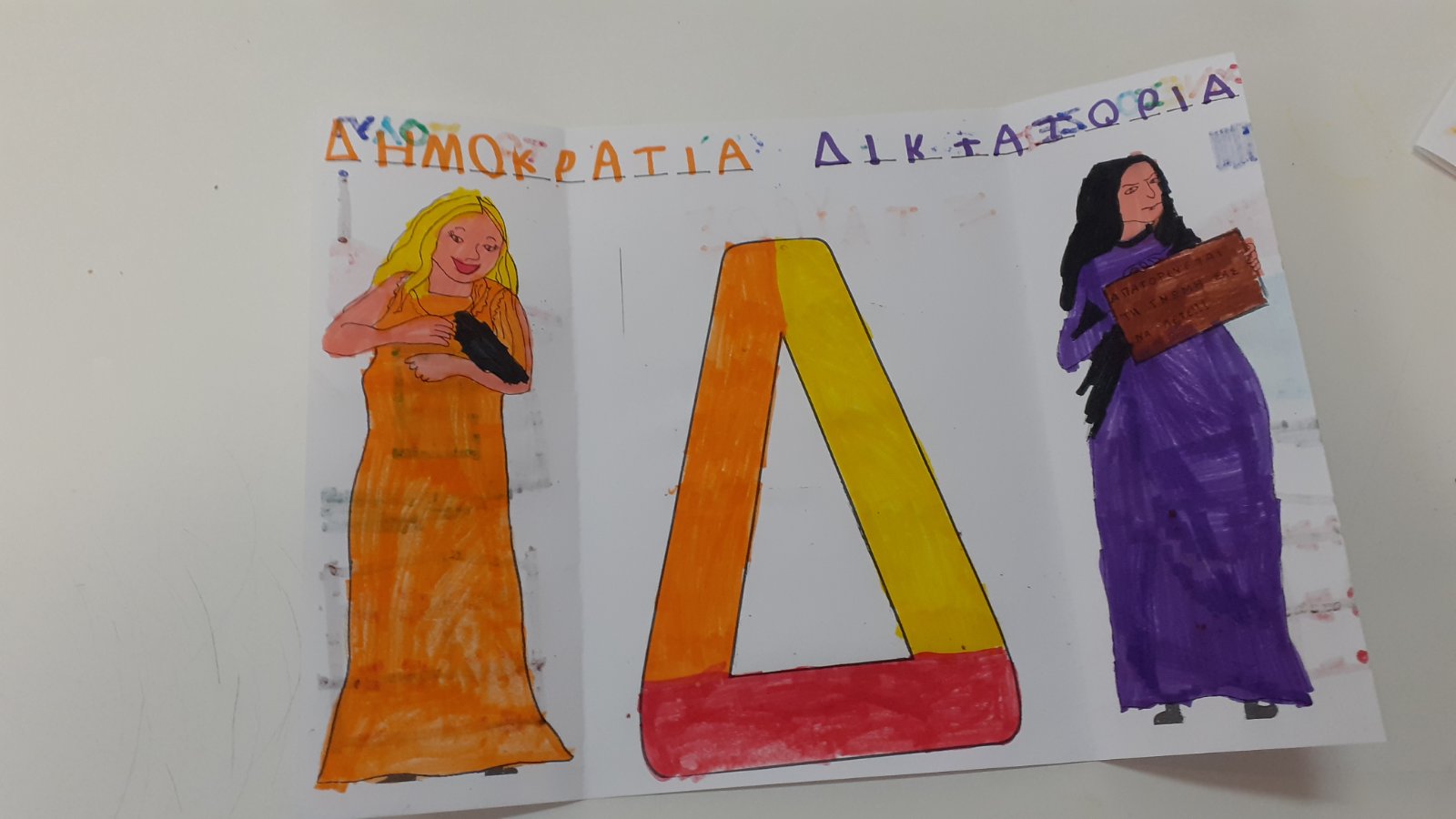 Τα παιδιά κατασκεύασαν ομαδικές αφίσες με την κυρά Δημοκρατία και την κυρά Δικτατορία και τι συμβολίζει η καθεμιά.