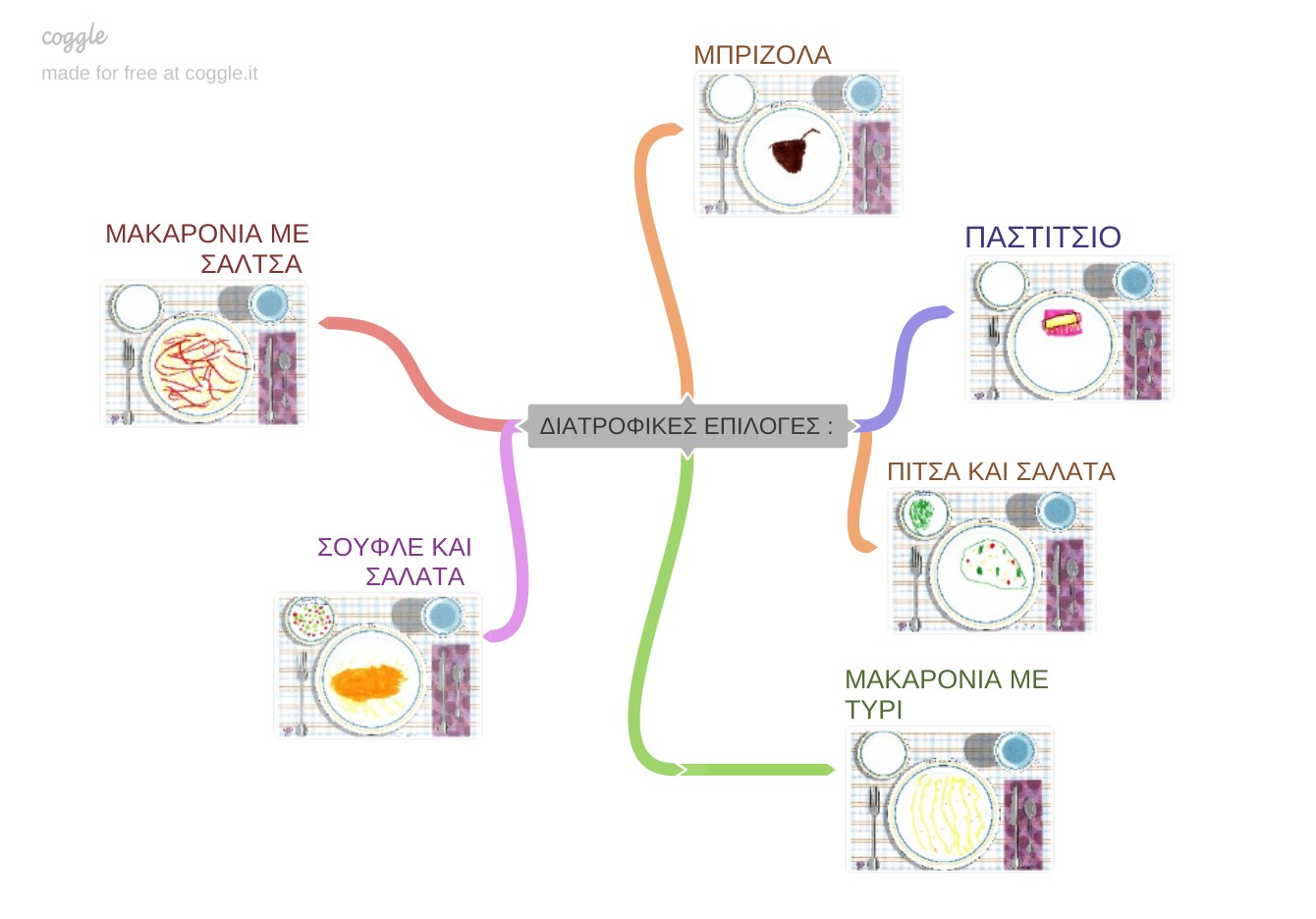 -Με αφόρμηση το πρωινό των νηπίων και τα σχόλια ορισμένων μαθητών σχετικά με τις διατροφικές επιλογές των συμμαθητών τους η Εκπαιδευτικός αποφασίζει να εστιάσει στο θέμα της Υγιεινής Διατροφής. Θέτει ερωτήσεις για το πρωινό που έφεραν στην τάξη και τους ζητά να αιτιολογήσουν την επιλογή τους για να διερευνήσει τις πρότερες γνώσεις των παιδιών και να ανιχνεύσει τις γνωστικές δυσκολίες σχετικά με το θέμα. Στη συνέχεια τα παιδιά καλούνται να ζωγραφίσουν το αγαπημένο τους πιάτο. Η εκπαιδευτικός σκανάρει με τη συμμετοχή των παιδιών τις ζωγραφιές τους και κάθε παιδί παρουσιάζει τη ζωγραφιά του στην ολομέλεια. Έπειτα όλες οι ζωγραφιές θα χρησιμοποιηθούν στην δημιουργία ενός εννοιολογικού χάρτη με τη χρήση του εργαλείου coggle, με κεντρική έννοια “ Διατροφικές επιλογές”.