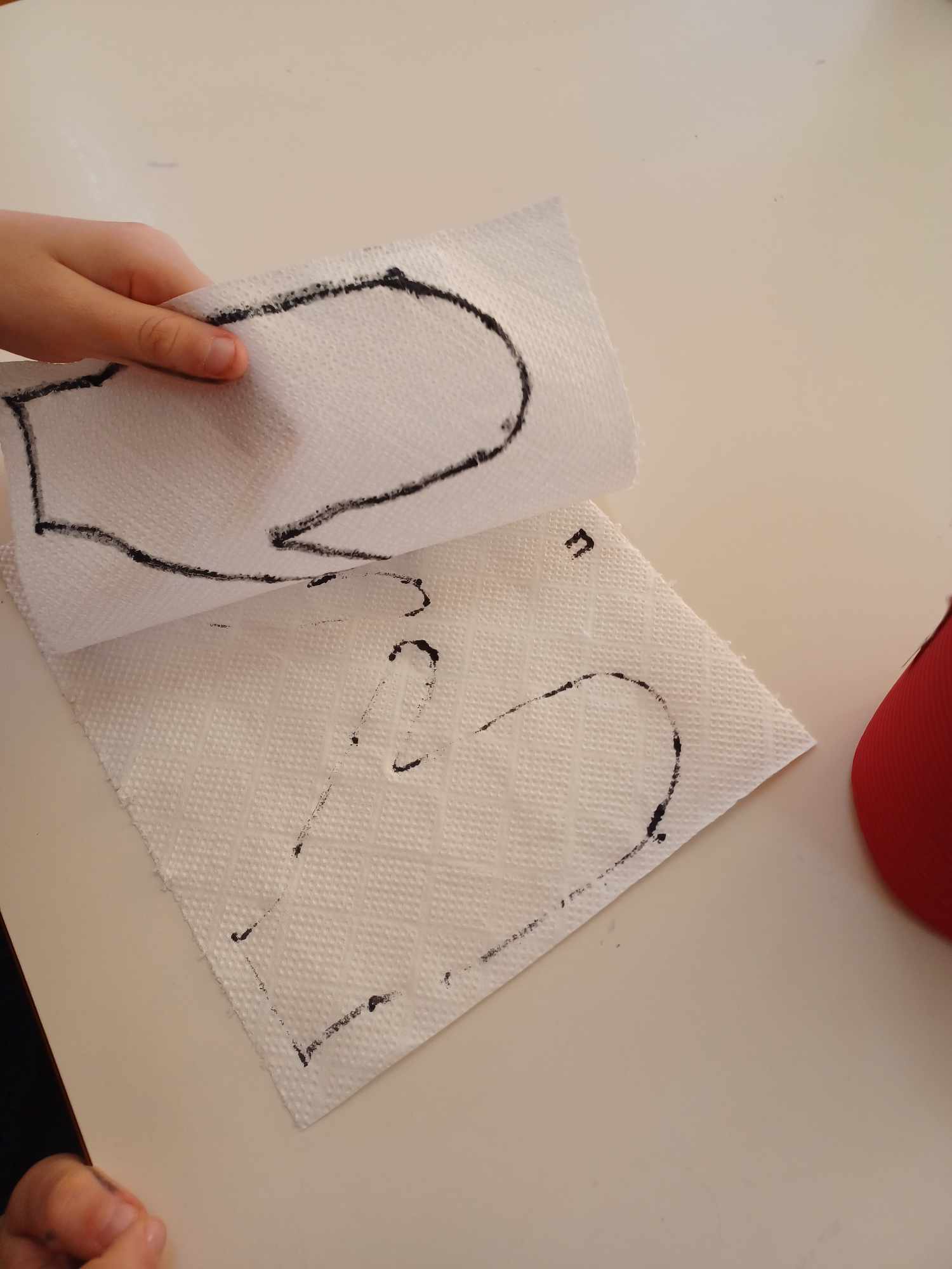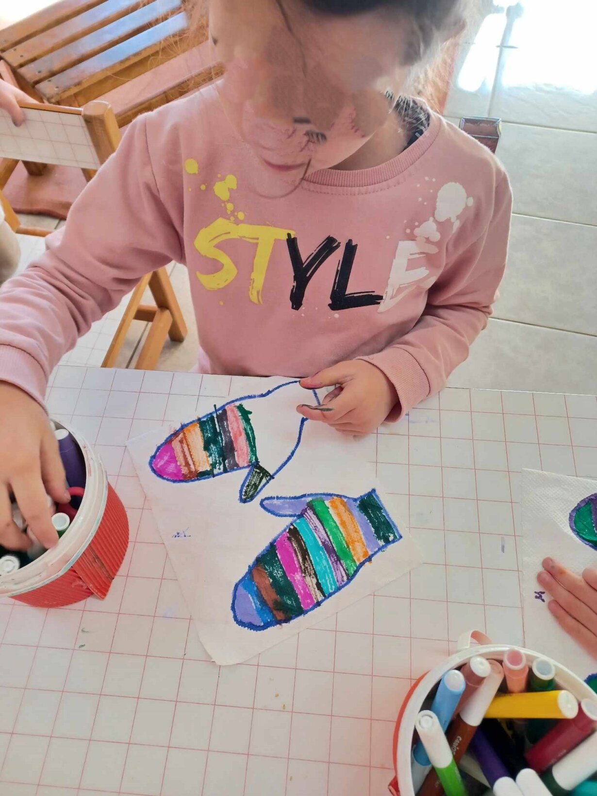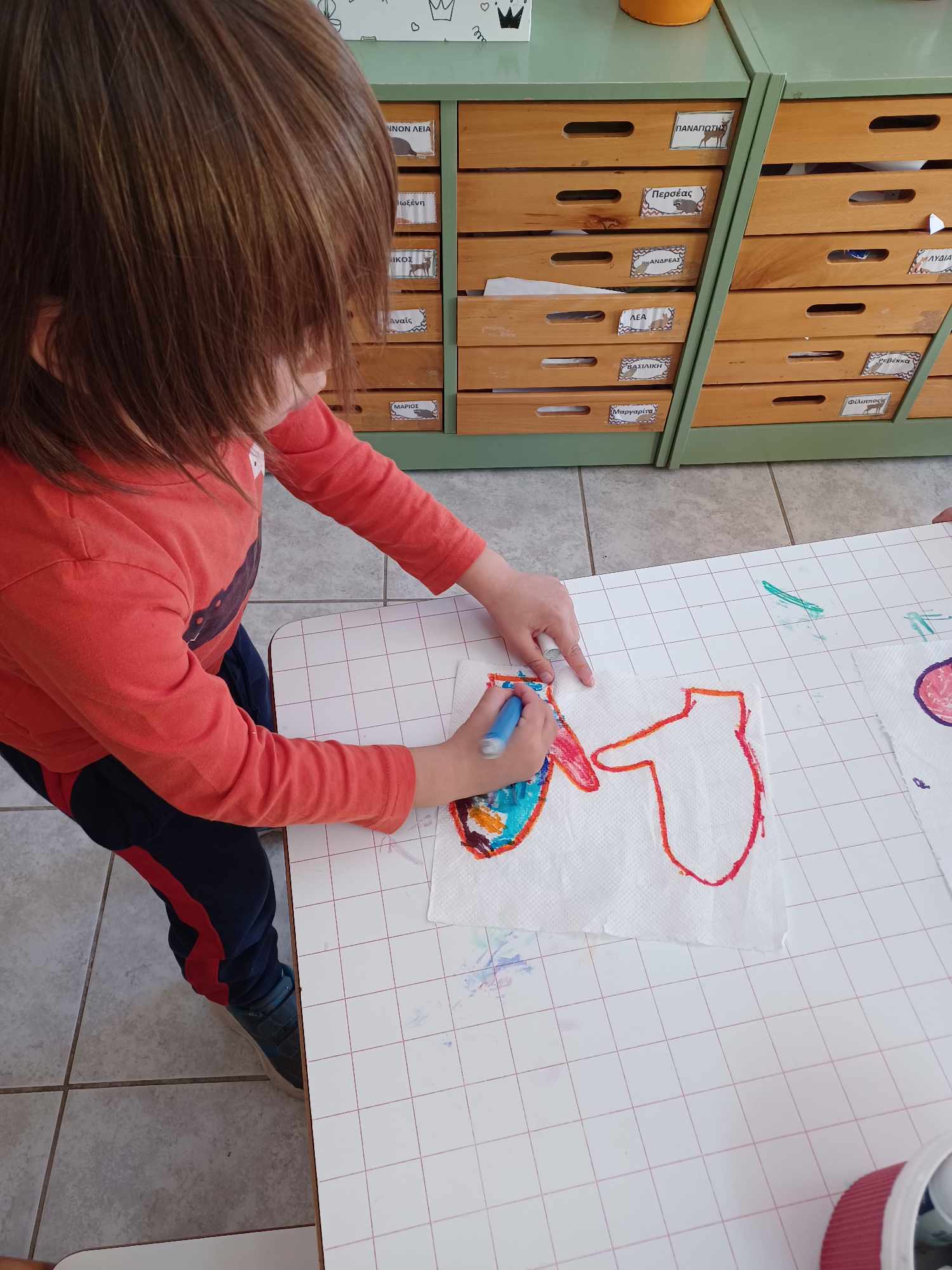 Τα παιδιά σχεδίασαν το χέρι τους με κλειστά δάχτυλα σε ένα κομμάτι χαρτί κουζίνας, φτιάχνοντας ένα γάντι όπως αυτό της ιστορίας. Στη συνέχεια διαχώρισαν τα δύο φύλλα από το χαρτί κουζίνας και το ένα το ζωγράφισαν. Μετά έβαλαν το φύλλο που δεν είχε χρώμα επάνω στο ζωγραφισμένο και το ακούμπησαν σε ένα ρηχό δοχείο με νερό.