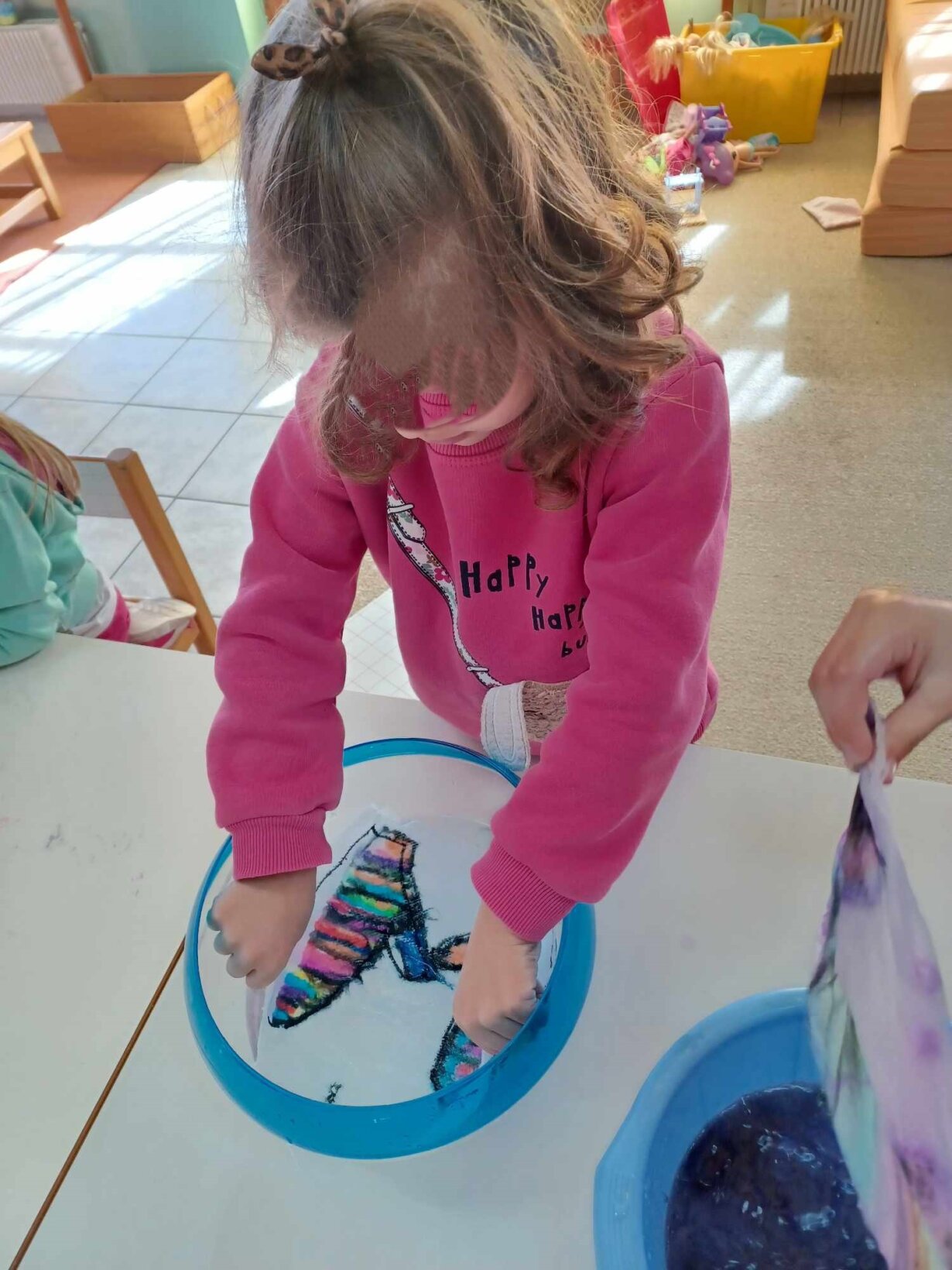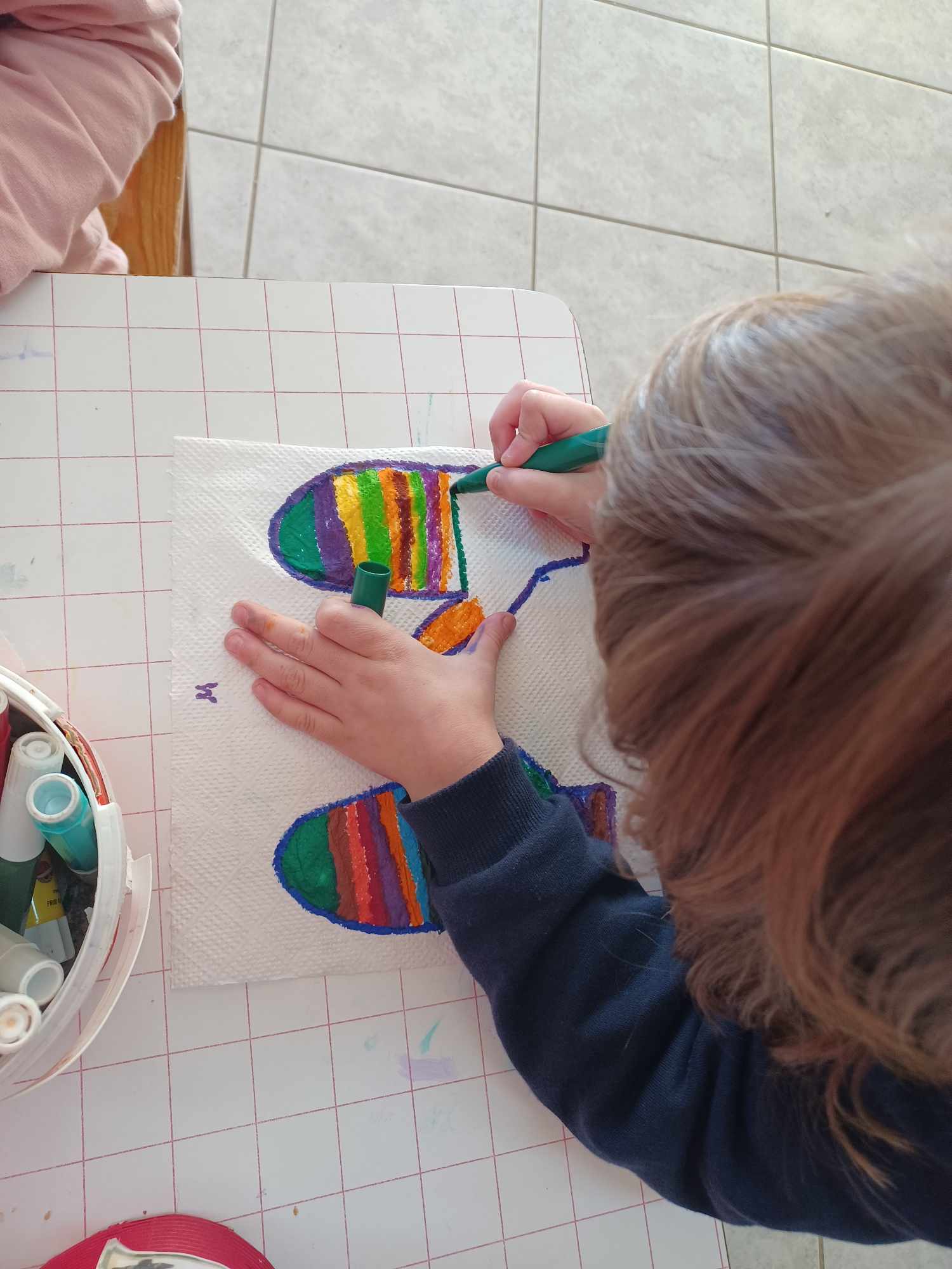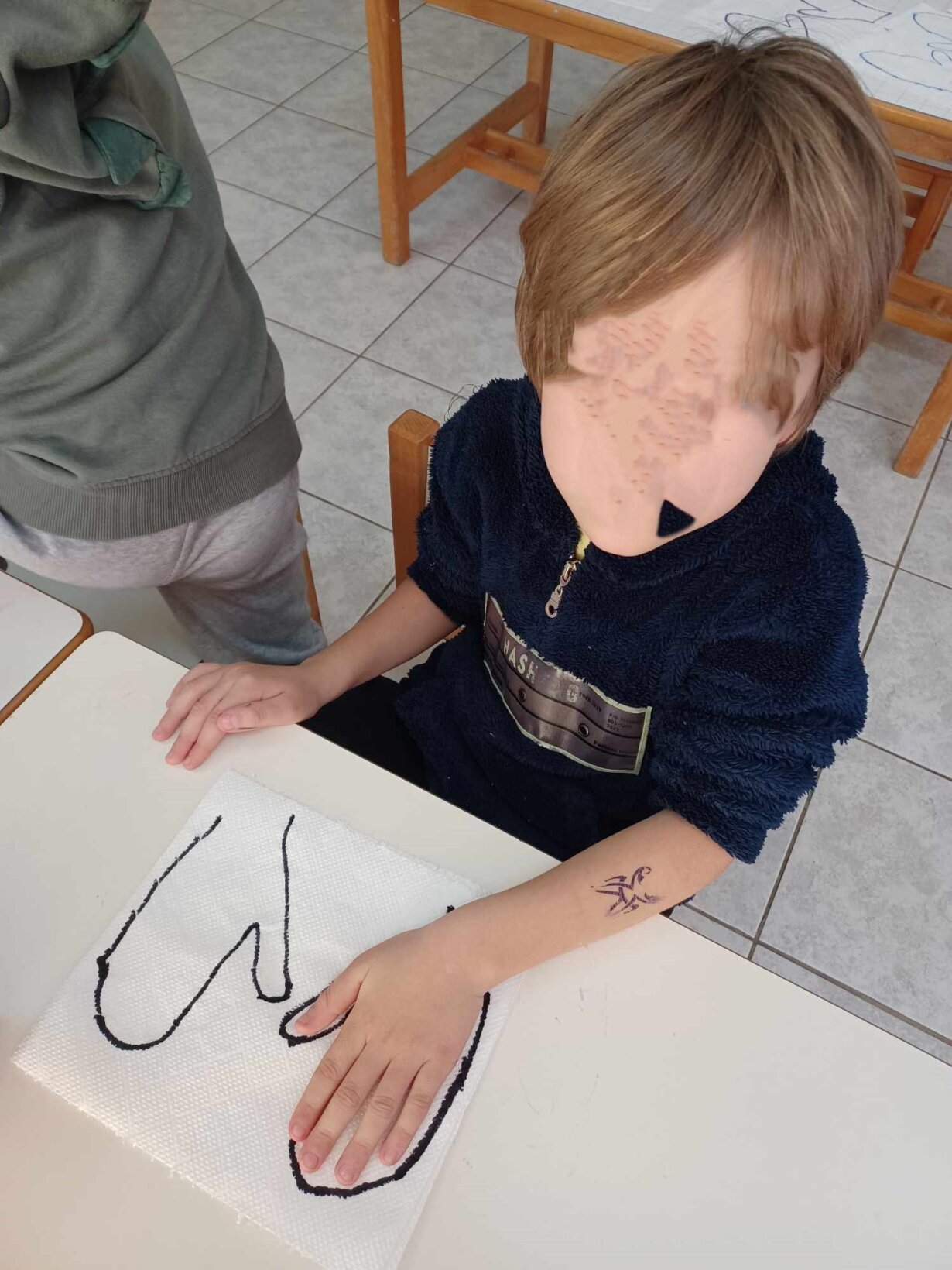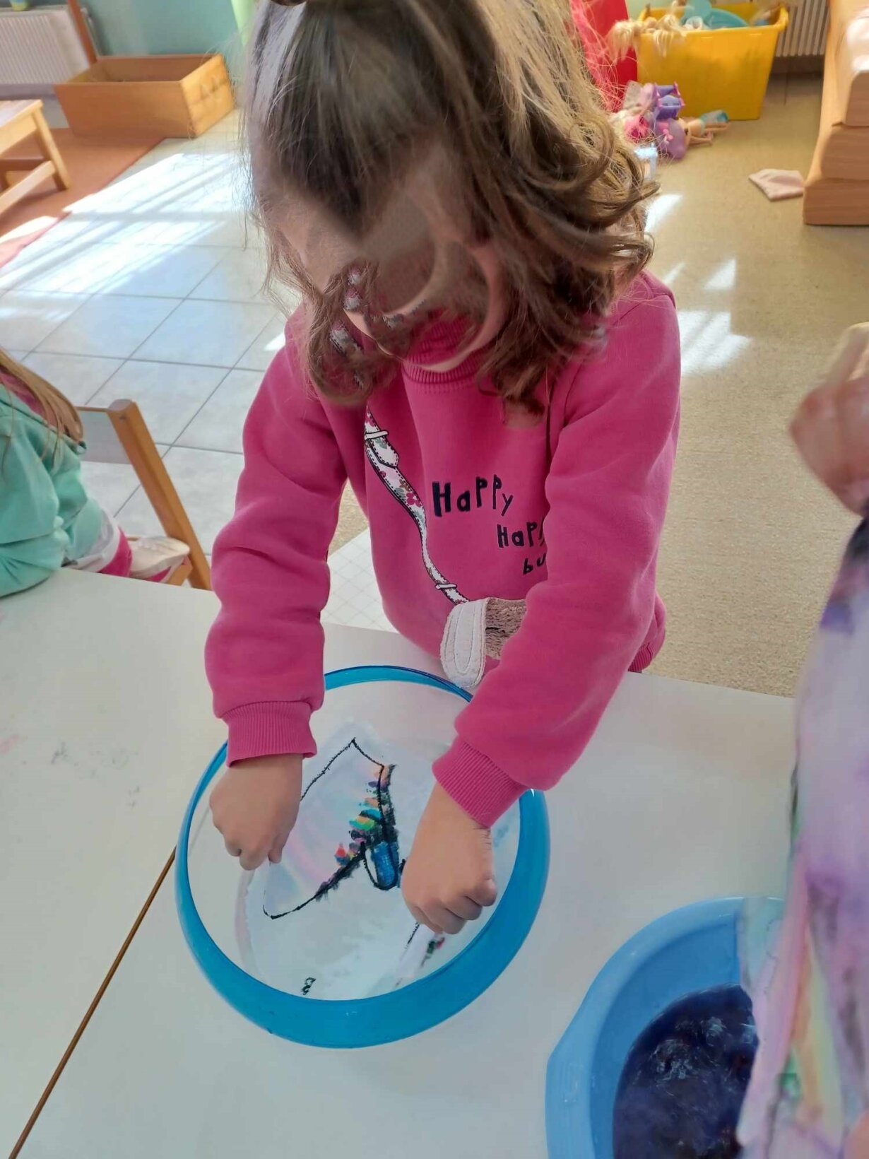 Τα παιδιά σχεδίασαν το χέρι τους με κλειστά δάχτυλα σε ένα κομμάτι χαρτί κουζίνας, φτιάχνοντας ένα γάντι όπως αυτό της ιστορίας. Στη συνέχεια διαχώρισαν τα δύο φύλλα από το χαρτί κουζίνας και το ένα το ζωγράφισαν. Μετά έβαλαν το φύλλο που δεν είχε χρώμα επάνω στο ζωγραφισμένο και το ακούμπησαν σε ένα ρηχό δοχείο με νερό.