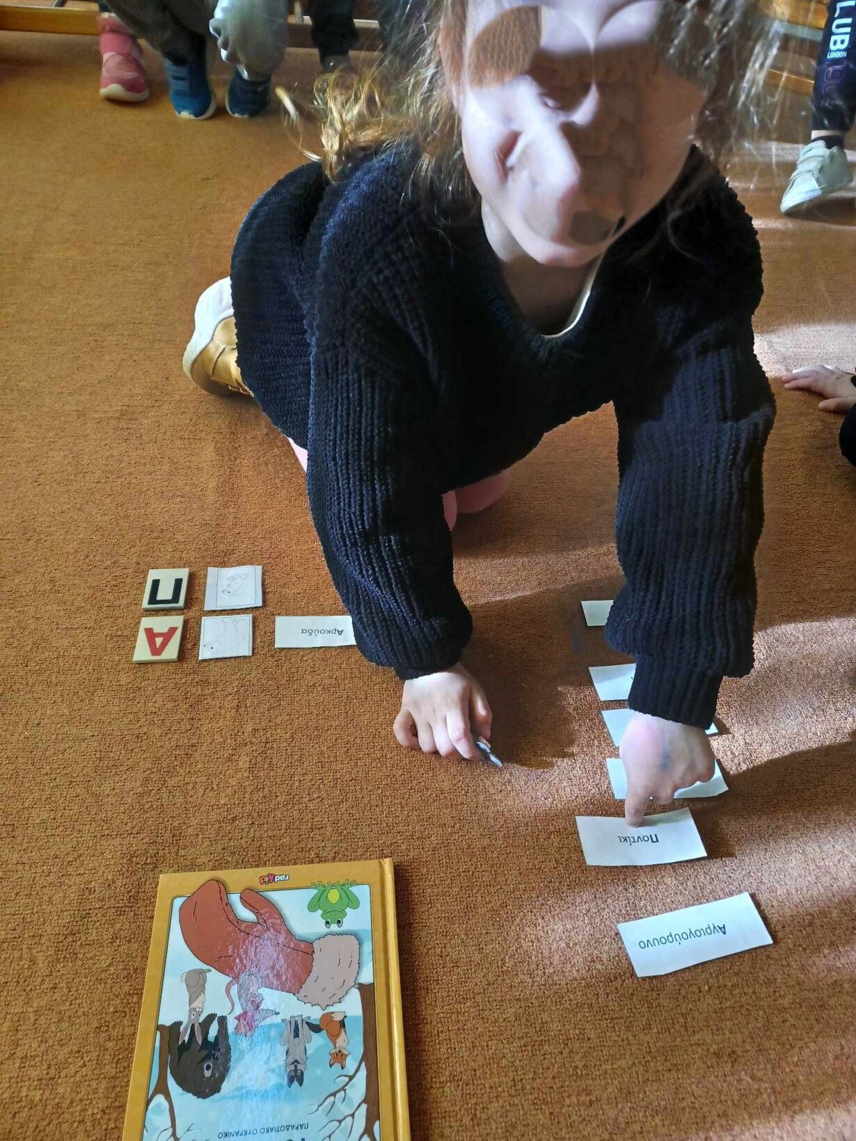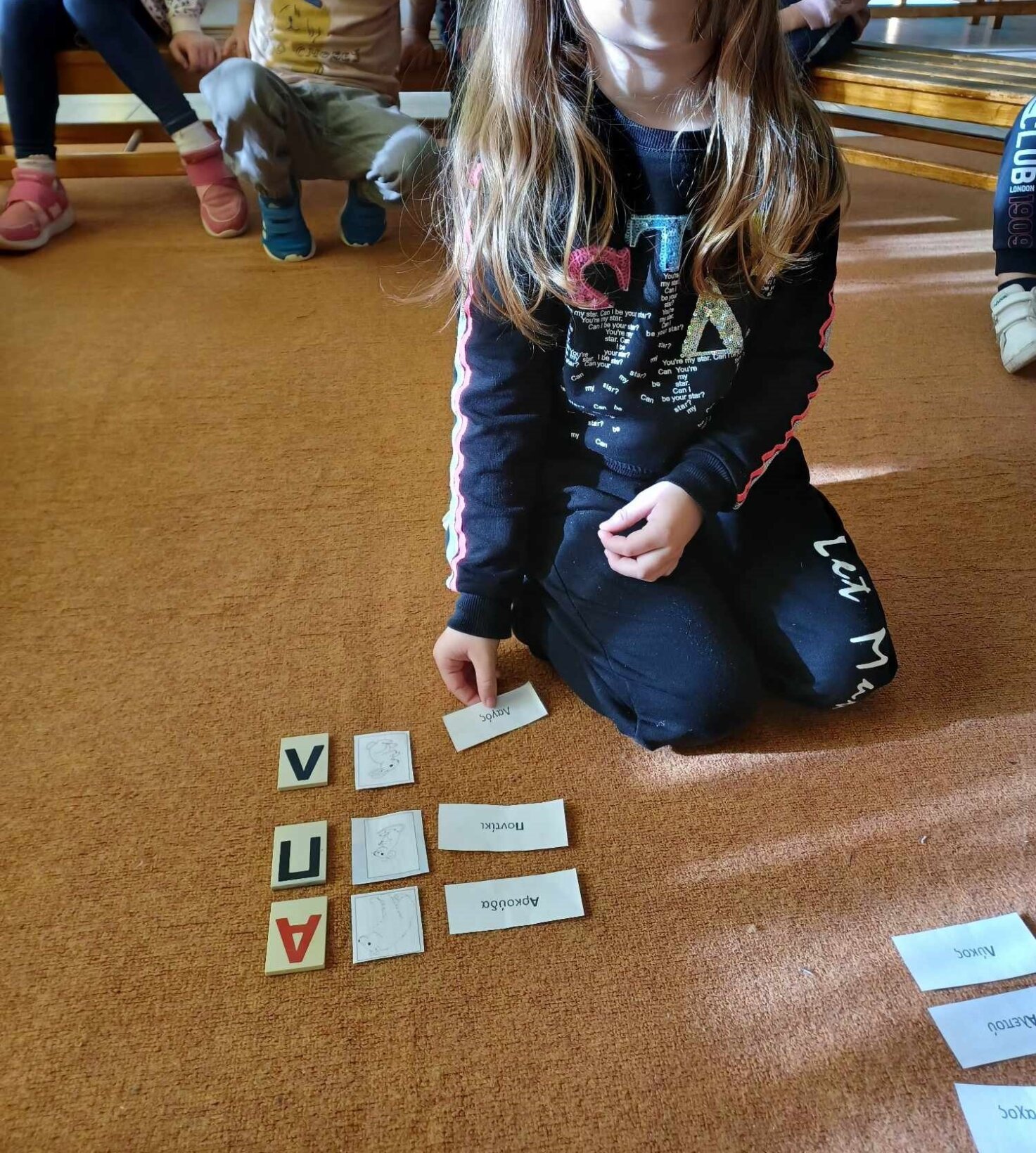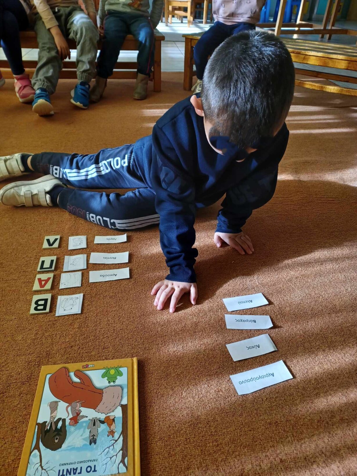 Παίξαμε γλωσσικό παιχνίδι αντιστοίχισης, με τη λέξη του κάθε ζώου- ήρωα της ιστορίας, την εικόνα του και το αρχικό του γράμμα.