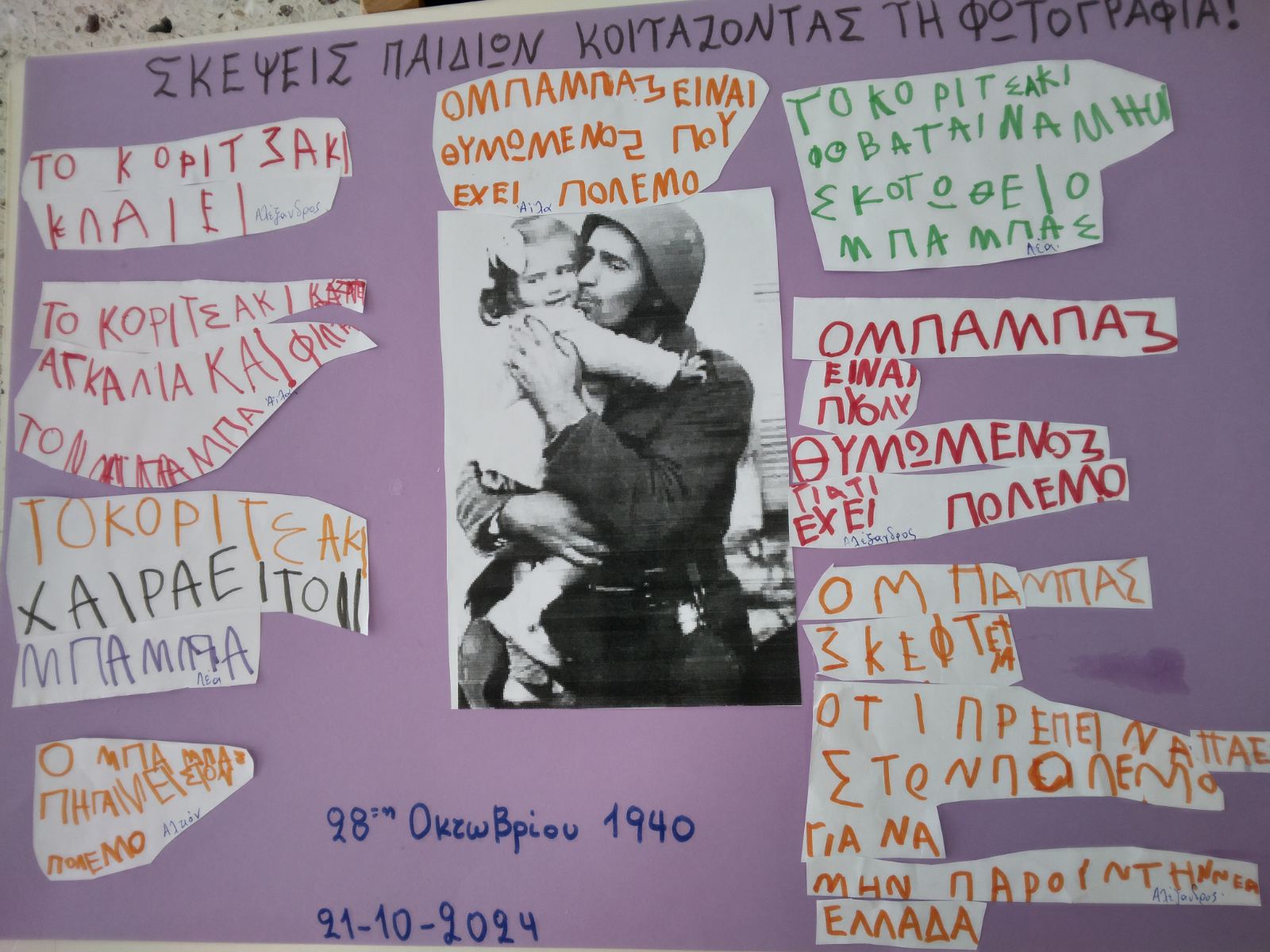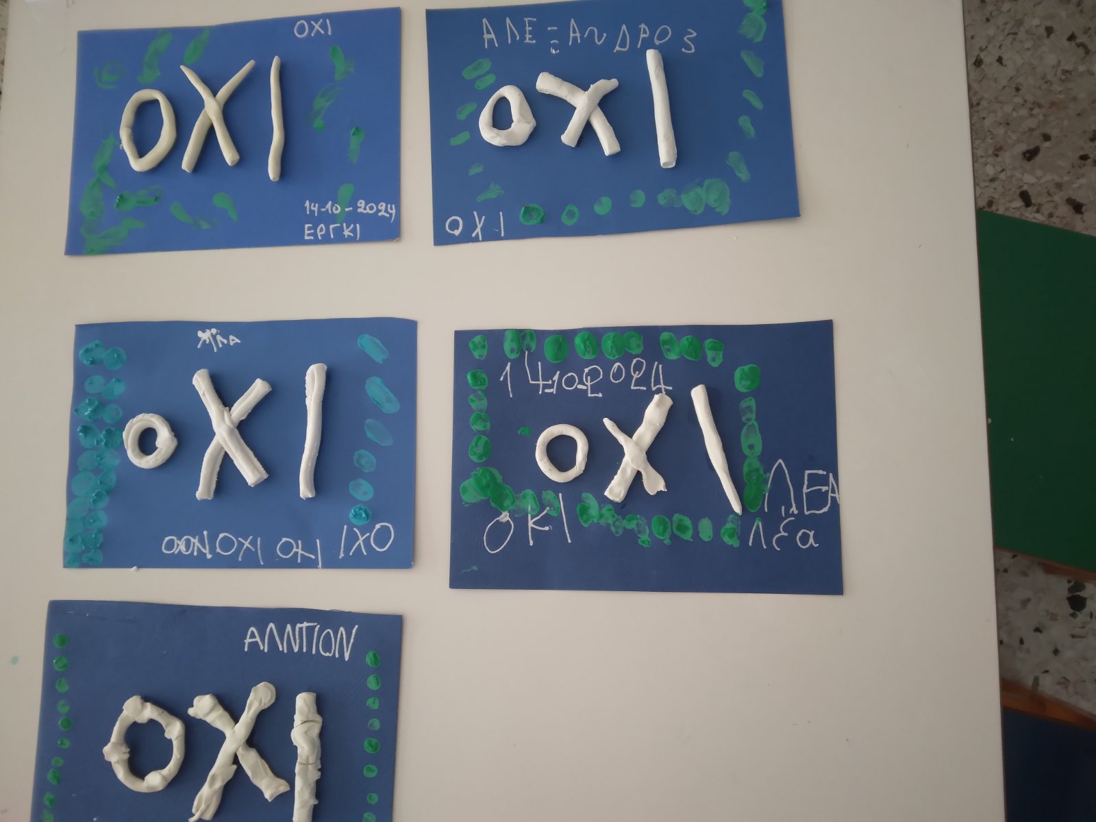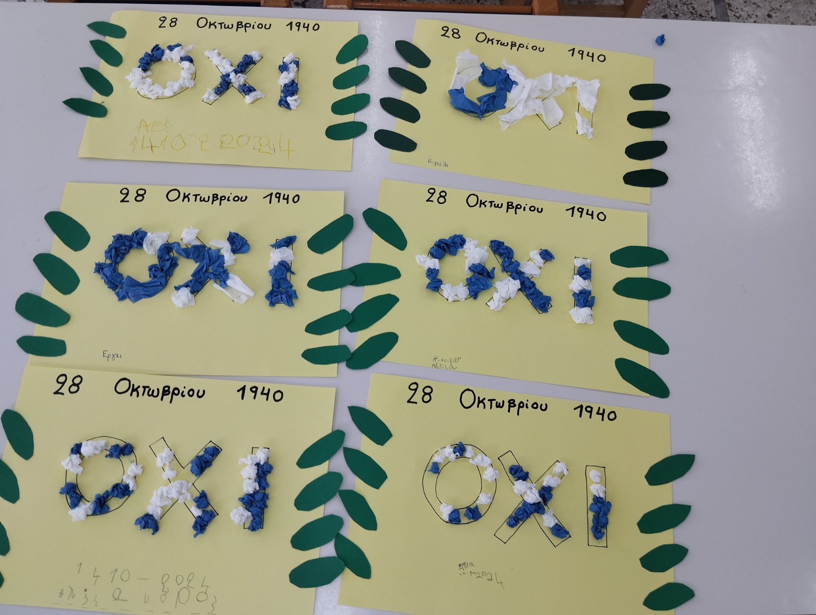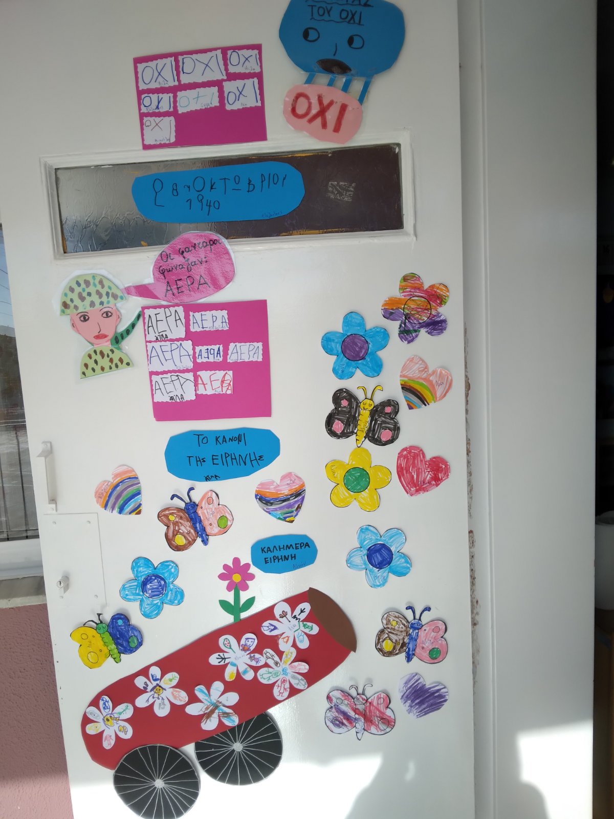 Στα πλαίσια του εορτασμού για την 28η Οκτωβρίου στο σχολείο μας κάναμε διάφορες δράσεις και κατασκευές, μάθαμε τραγούδια, ποιήματα, κάναμε φωνολογικές ασκήσεις με το γράμμα Ο του “όχι” και το Α του” Άέρα” και παίξαμε διαδραστικά εκπαιδευτικά παιχνίδια. Επίσης, φτιάξαμε μαζί με το Δημοτικό Σχολείο το σκηνικό μας για την επέτειο του ηρωικού ” όχι”.