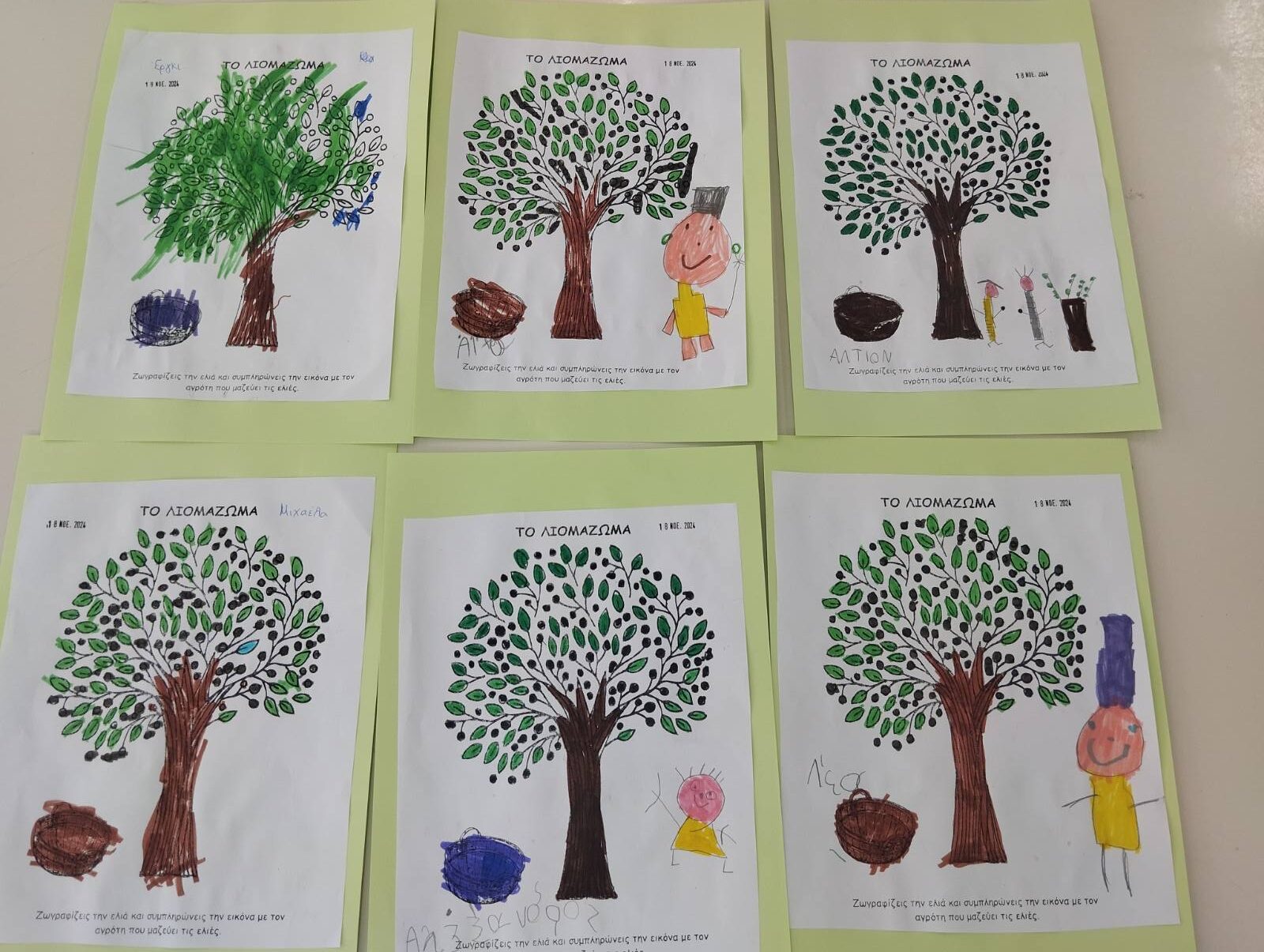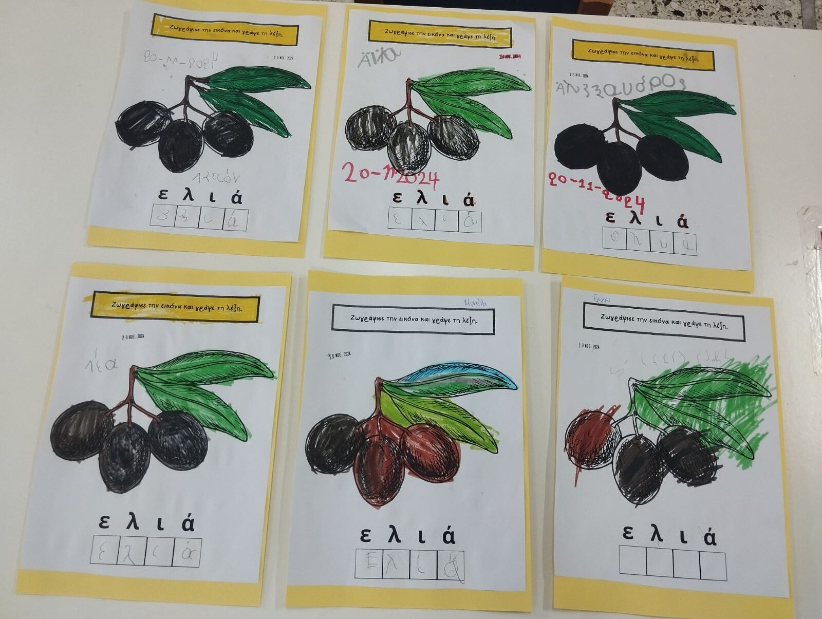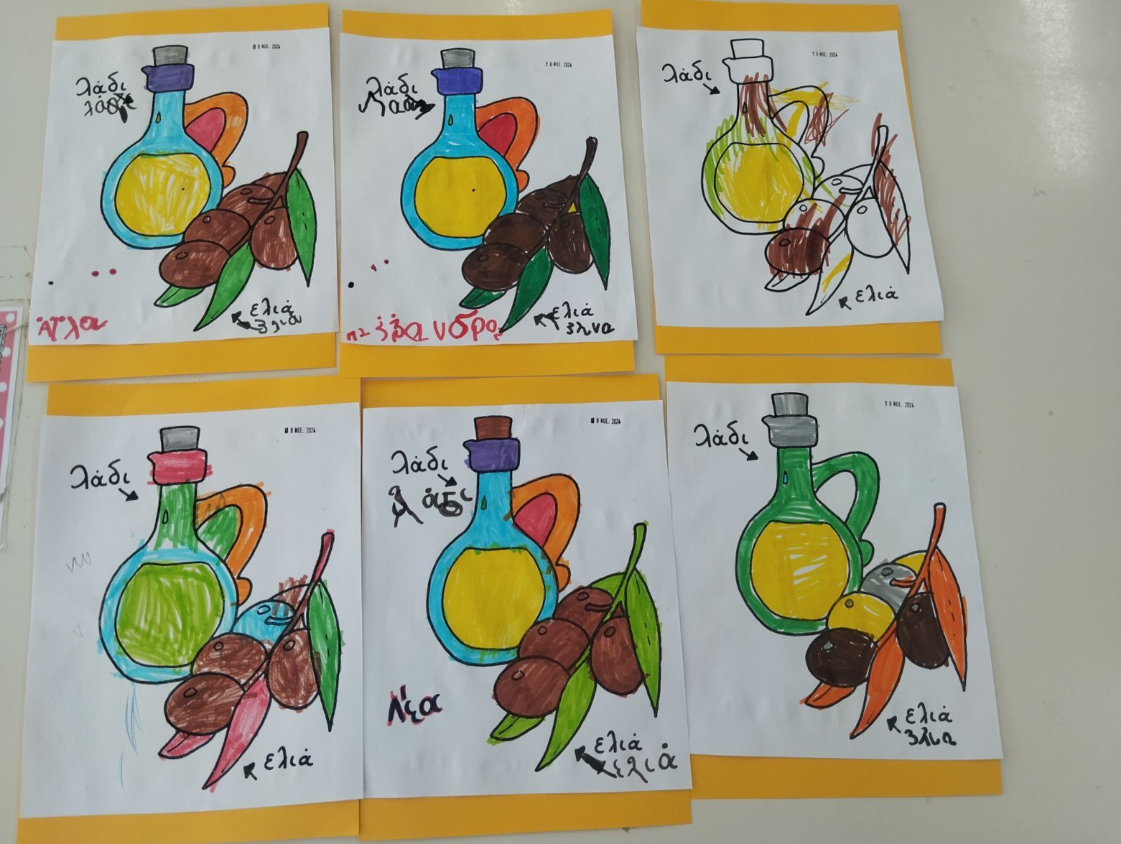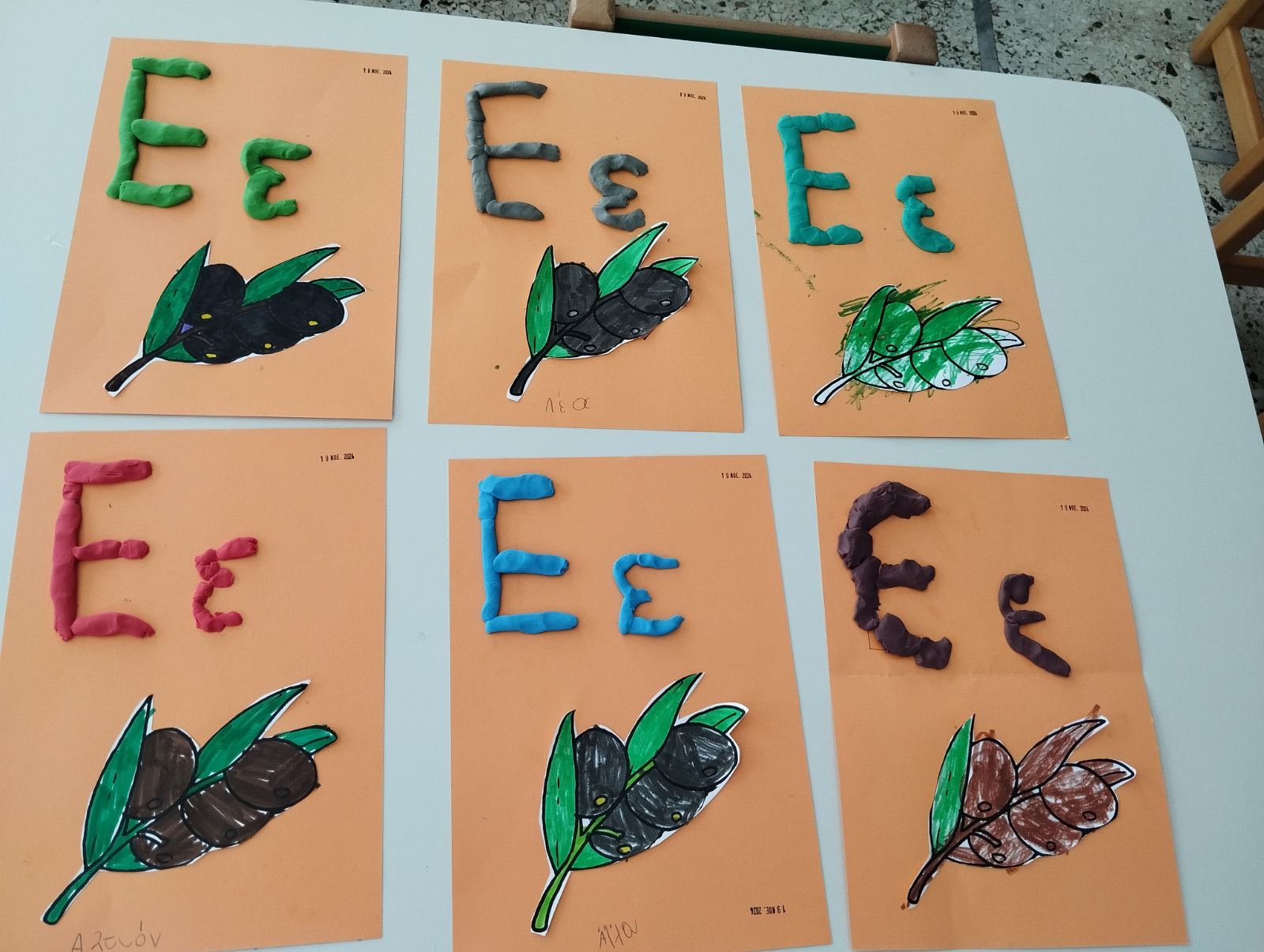 Στα πλαίσια της θεματικής ενότητας ” η ελιά και τα προϊόντα της” μιλήσαμε για το αιωνόβιο δέντρο την ελιά που καλλιεργούνταν από την αρχαία Ελλάδα και πόσο σημαντικό ρόλο είχε στη ζωή των αρχαίων Ελλήνων. Μάθαμε μύθους, ποιήματα και τραγούδια. Μιλήσαμε για το λιομάζωμα, τη διαδικασία παραγωγής του λαδιού και το πόσο πολύτιμο είναι στη ζωή μας το ελαιόλαδο. Είδαμε διάφορα προϊόντα που παρασκευάζονται με πρώτη ύλη το λάδι, φτιάξαμε λαδοκούλουρα, κάναμε κατασκευές ατομικές και ομαδικές, κάναμε φωνολογικές ασκήσεις με το γράμμα Ε, ε και παίξαμε διαδραστικά παιχνίδια.