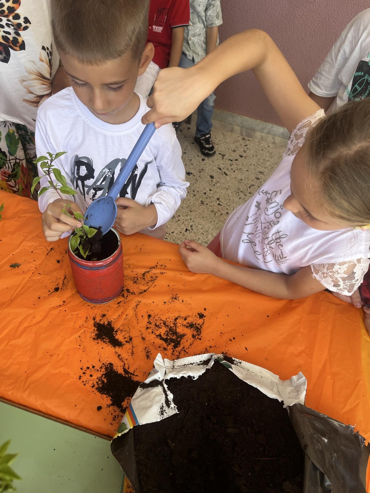 Και φυσικά, η δράση κορυφώθηκε με τους μικρούς μας μαθητές να φυτεύουν το δικό τους γλαστράκι με βασιλικό, αναλαμβάνοντας έτσι τη φροντίδα και την ευθύνη για το δικό τους ιερό φυτό!