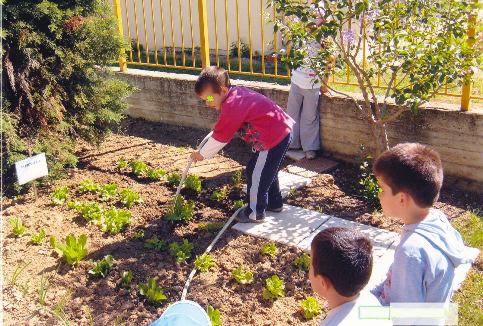 Δηλαδή τα νήπια φυτεύουν λουλούδια την ανάλογη εποχή και ακόμη λάχανα ,μαρουλάκια , κρεμμυδάκια , σπανάκι κ.α. τα οποία φροντίζουν (πότισμα , σκάλισμα , βοτάνισμα)και στο τέλος τα παίρνουν στο σπίτι τους.