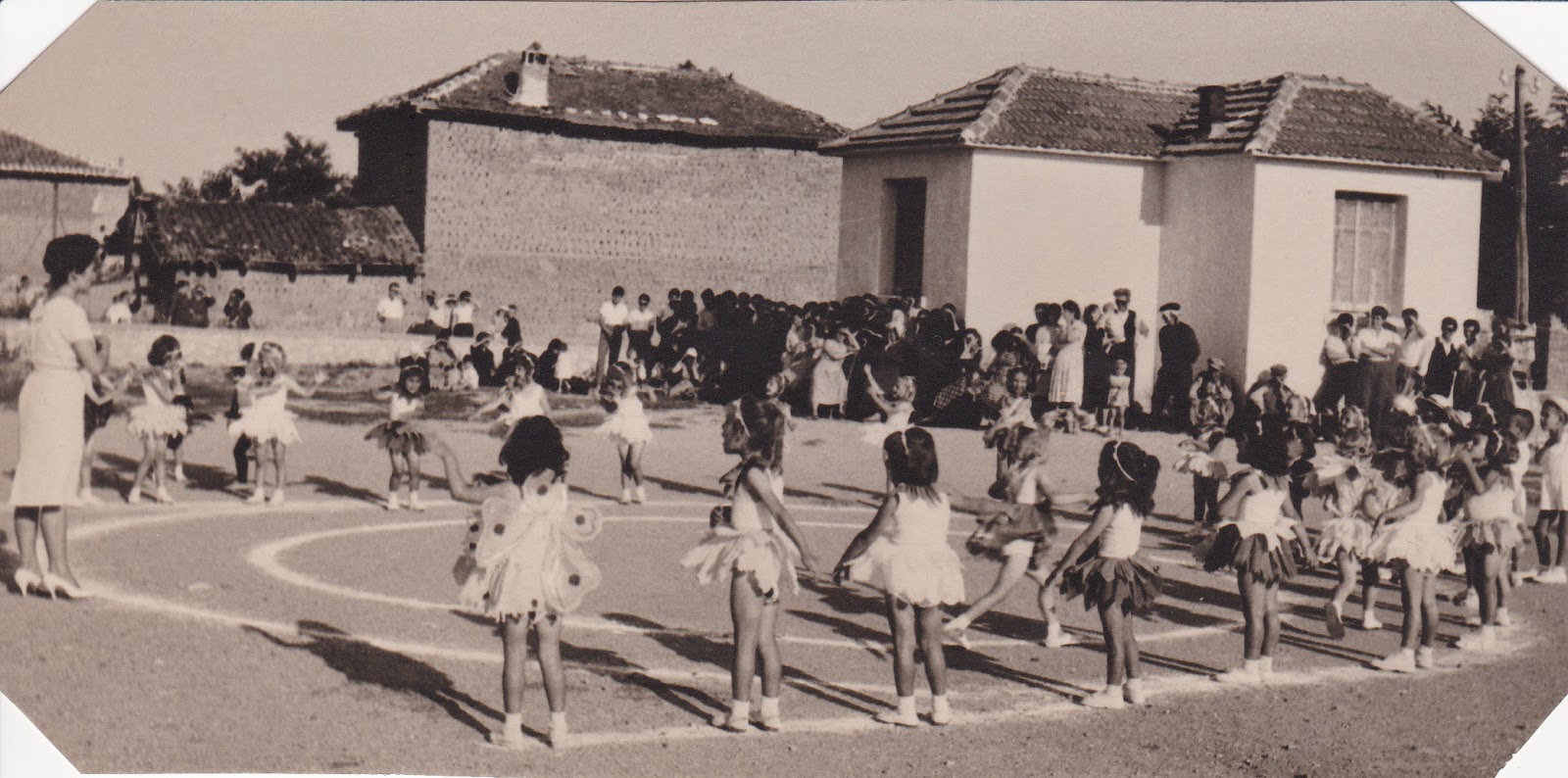 Διάλειμμα στην αυλή του Δημοτικού 1961 , όλα τα παιδάκια φορούν ποδίτσες και τα κορίτσια άσπρους φιόγκους |