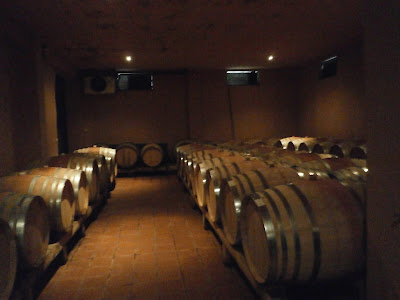 Είδαμε το υπόγειο με τα ξύλινα βαρέλια με το κρασί που πρέπει να ωριμάσει.