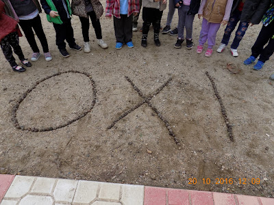 28η Οκτωβρίου Ειρήνη -Πόλεμος Μάθαμε τα ιστορικά γεγονότα μέσα από εικόνες , βιβλία, το διαδίκτυο. Διαβάσαμε την “Ειρήνη” του Αριστοφάνη και φτάξαμε την ειρήνη και τον πόλεμο ομαδικά . Στην αυλή με τα κουκουνάρια από τα πεύκα μας δημιουργήσαμε …διαφορετικά!!!!