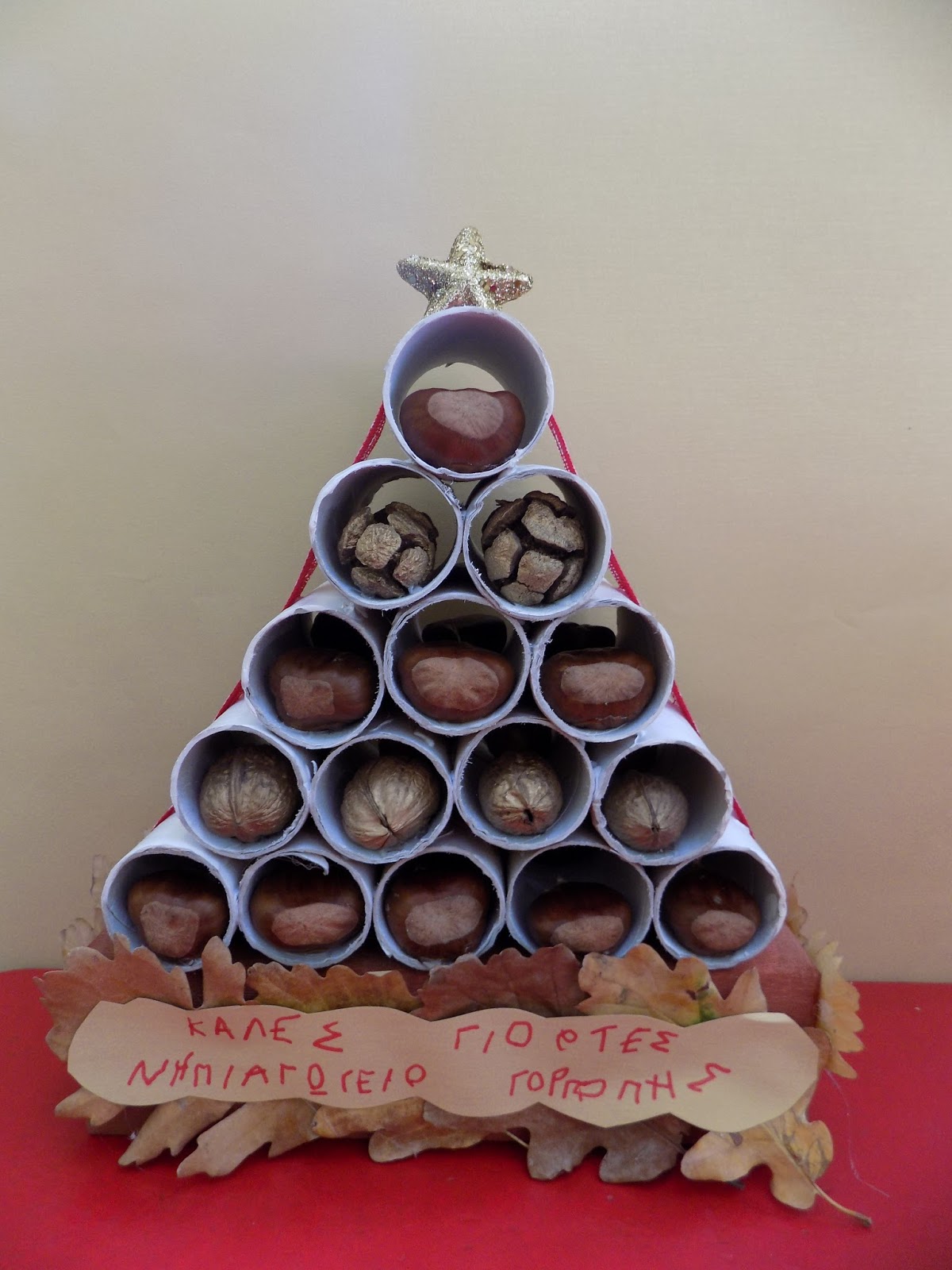 Χριστουγεννιάτικο δέντρο από ρολά υγείας ,κουτί από χυμό ,ξηρούς καρπούς , φύλλα και κουκουνάρια.