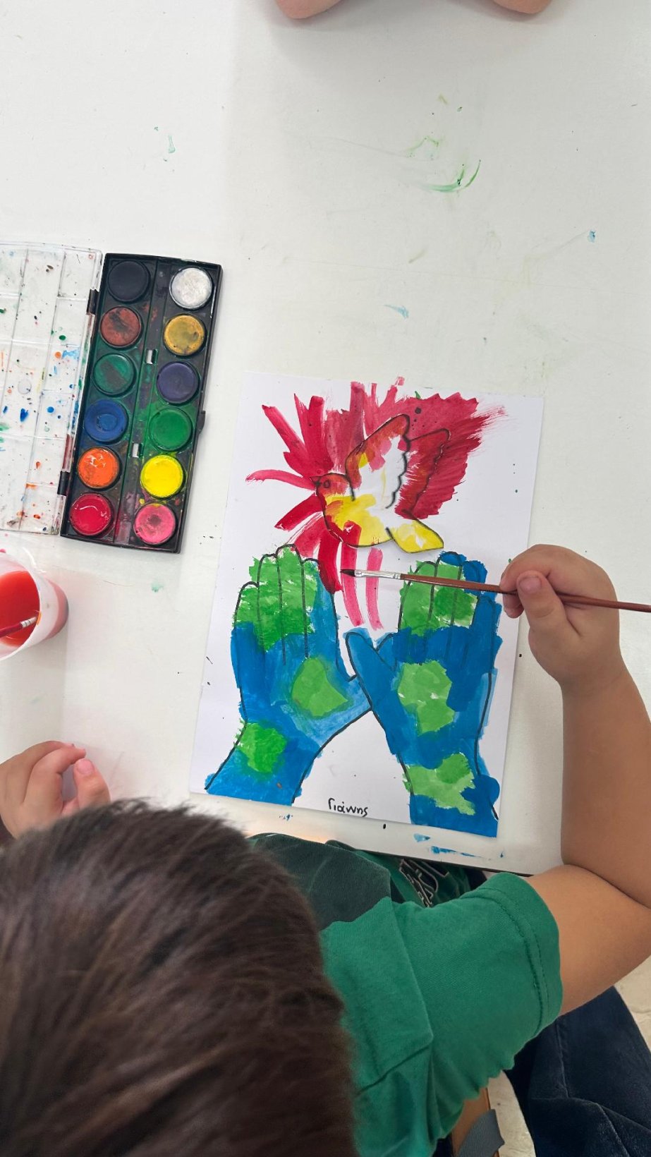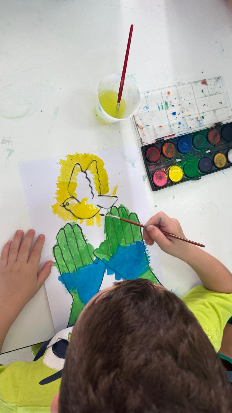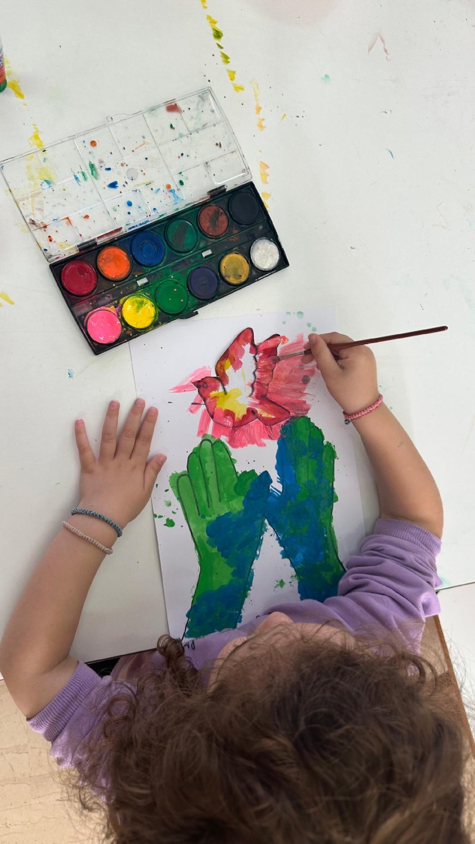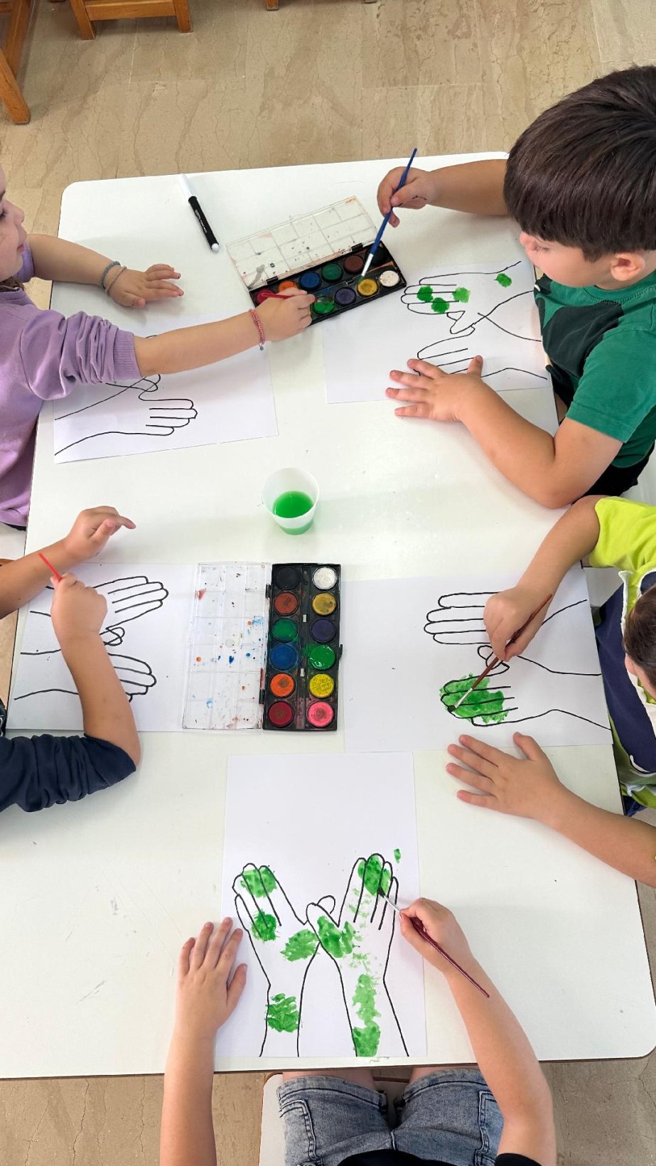 Ακολούθησε συζήτηση με τα παιδιά για τις διαφορές ανάμεσα στον πόλεμο και την ειρήνη, με τη βοήθεια κατάλληλου εποπτικού υλικού. Δόθηκε έμφαση στην Ειρήνη. Πραγματοποιήθηκε Aτομική εργασία:🕊️ «Η Ειρήνη είναι στα χέρια μας» ✋🌍. Κάθε παιδί αποτύπωσε το περίγραμμα των χεριών του πάνω σε χαρτί. Τα χέρια ζωγραφίστηκαν με χρώματα της γης – καφέ, πράσινο, μπεζ – συμβολίζοντας τη φύση, τον άνθρωπο και τον πλανήτη μας. Ακριβώς πάνω από τα χέρια, τοποθετήθηκε ένα λευκό περιστέρι, σαν να ξεπηδά μέσα από αυτά, μεταφέροντας το μήνυμα πως η ειρήνη ξεκινά από εμάς τους ίδιους.