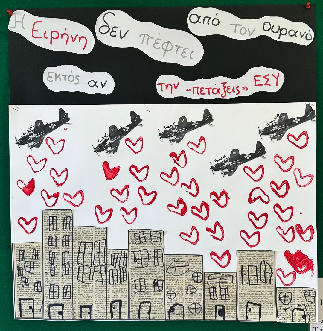 Τέλος, διαβάσαμε στα παιδιά ένα αυτοσχέδιο παραμύθι «Το μικρό αεροπλανάκι και η αποστολή της καρδιάς», όπου ένα μικρό αεροπλανάκι, αντί για βόμβες, πετάει καρδιές 💌 σε όλο τον κόσμο, φέρνοντας αγάπη και χαρά. Με αφορμή το παραμύθι, δημιουργήσαμε μια ομαδική κατασκευή: Κατασκευάσαμε σπίτια σε γκρι και μαύρο, χρησιμοποιώντας κομμάτια από εφημερίδες, για να απεικονίσουμε έναν γκρίζο, σοβαρό κόσμο. 🏘️ Από πάνω, «πέταξαν» αεροπλάνα — τόσα όσα και τα παιδιά της τάξης — τα οποία αντιπροσώπευαν το μικρό αεροπλανάκι του παραμυθιού. ✈️ Από κάθε αεροπλάνο ξεπετάγονταν καρδιές, οι οποίες φτιάχτηκαν με τύπωμα ρολού υγείας σε σχήμα καρδιάς ❤️, φέρνοντας χρώμα, αγάπη και χαρά στον γκρίζο κόσμο των σπιτιών. Η δραστηριότητα συνδύασε φαντασία, συνεργασία και τέχνη, ενώ έδωσε στα παιδιά τη δυνατότητα να εκφράσουν συναισθήματα αγάπης και ειρήνης μέσα από την κατασκευή τους. 🌈
