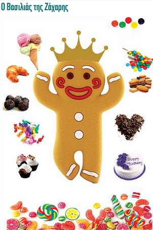 Βάζουμε τις φωτογραφίες τροφών στο πάτωμα και κάνουμε έναν κύκλο γύρω τους. Η μουσική ξεκινά. Τα παιδιά περνούν τη ζωγραφιά του Βασιλιά της Ζάχαρης από χέρι σε χέρι. Όταν η μουσική σταματήσει, όποιος έχει τον Βασιλιά της Ζάχαρης σηκώνεται από τον κύκλο και διαλέγει μία εικόνα από το πάτωμα και την τοποθετεί στο κατάλληλο πανί.