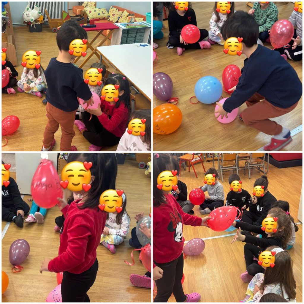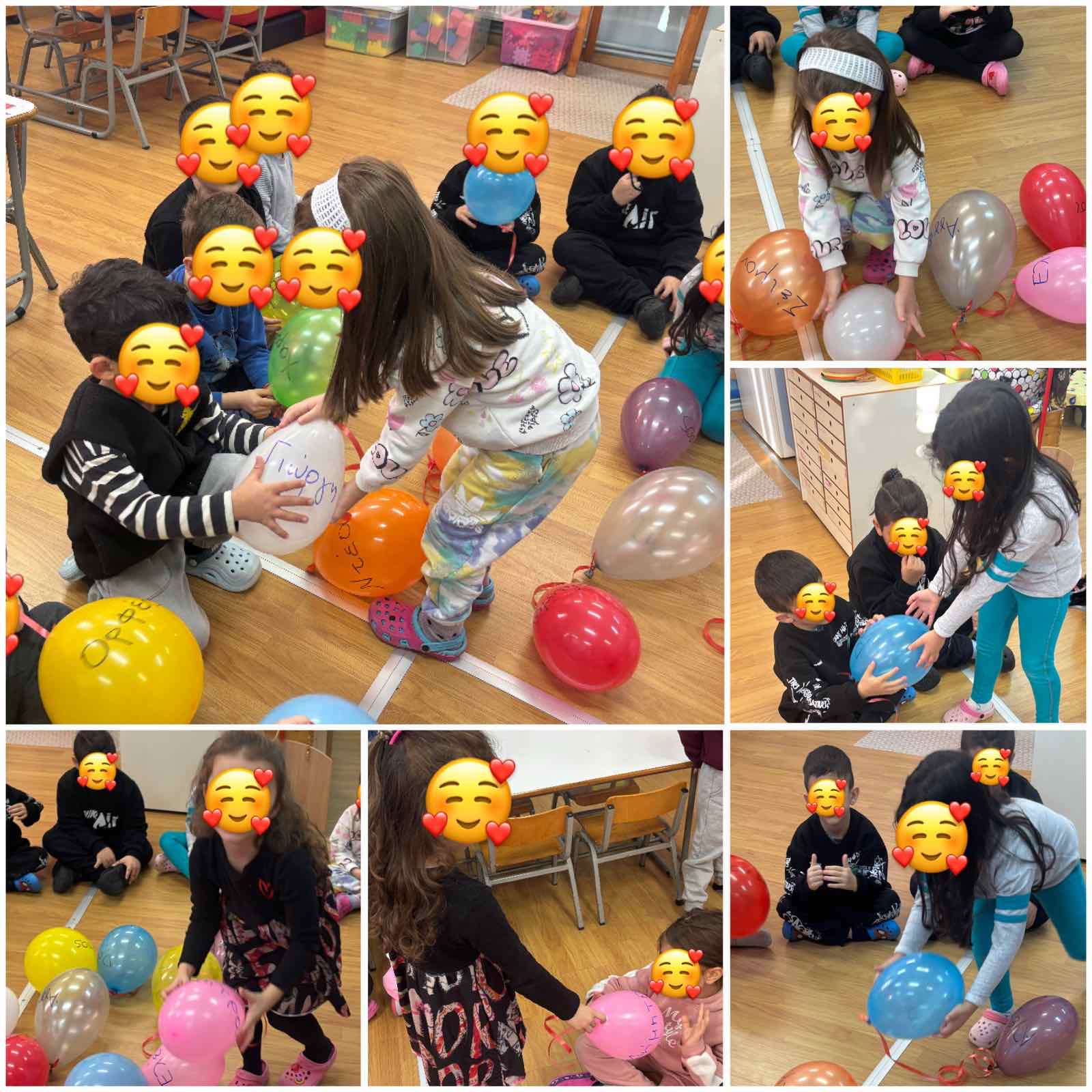 Οι μαθητές/τριες αφού συστήθηκαν στην ολομέλεια κρατώντας ο καθένας το μπαλόνι με το όνομά του, τα πέταξαν στον αέρα! Τα μπαλόνια με τα ονόματα είναι πια μπερδεμένα!Η εκπαιδευτικός σηκώνει ένα παιδί να επιλέξει τυχαία ένα μπαλόνι και να προσπαθήσει να αναγνωρίσει το όνομα που αναγράφεται πάνω σ΄ αυτό! Μόλις καταλάβει σε ποιον ανήκει το μπαλόνι πηγαίνει να του το προσφέρει ως ένδειξη καλοσύνης, ευγένειας και γενναιοδωρίας!