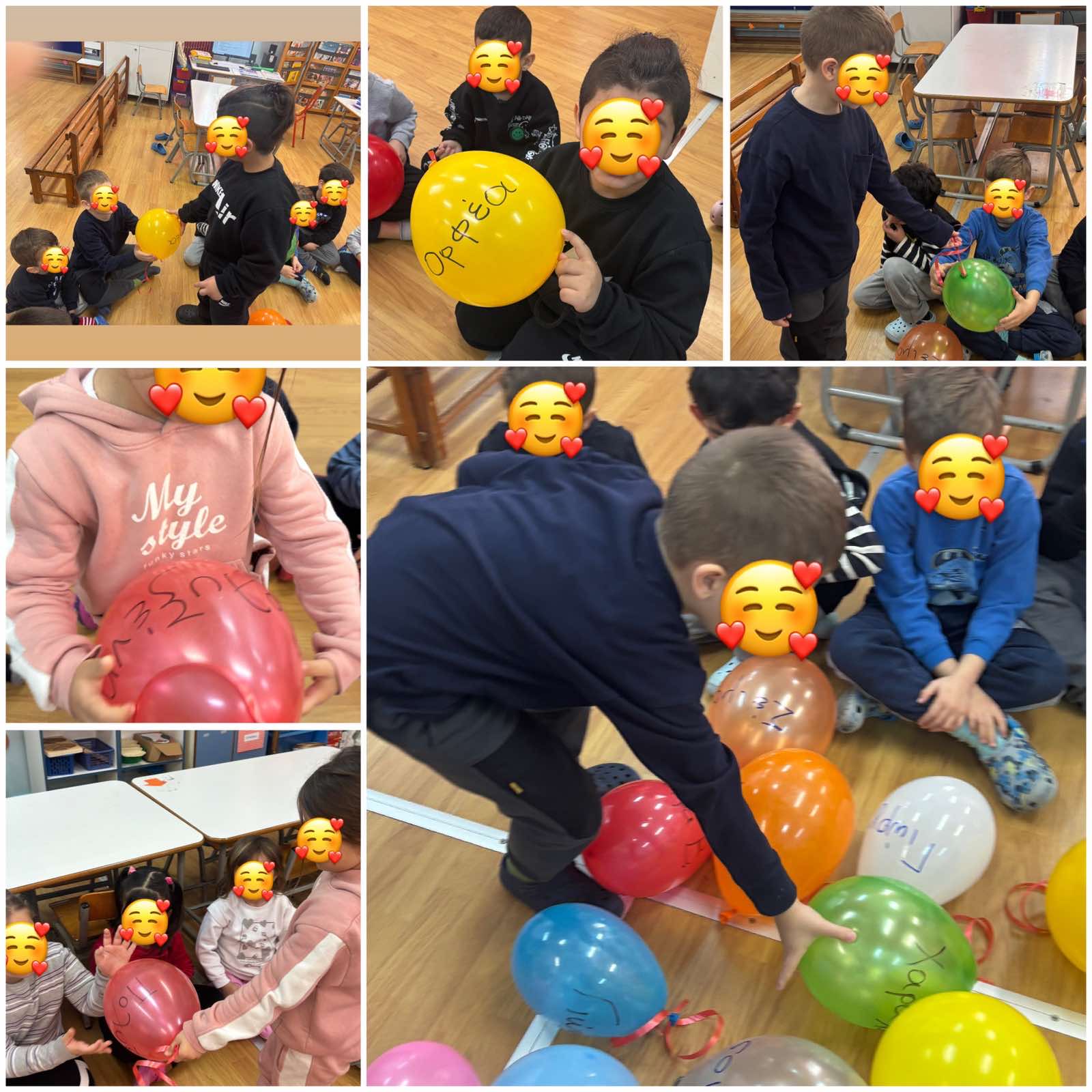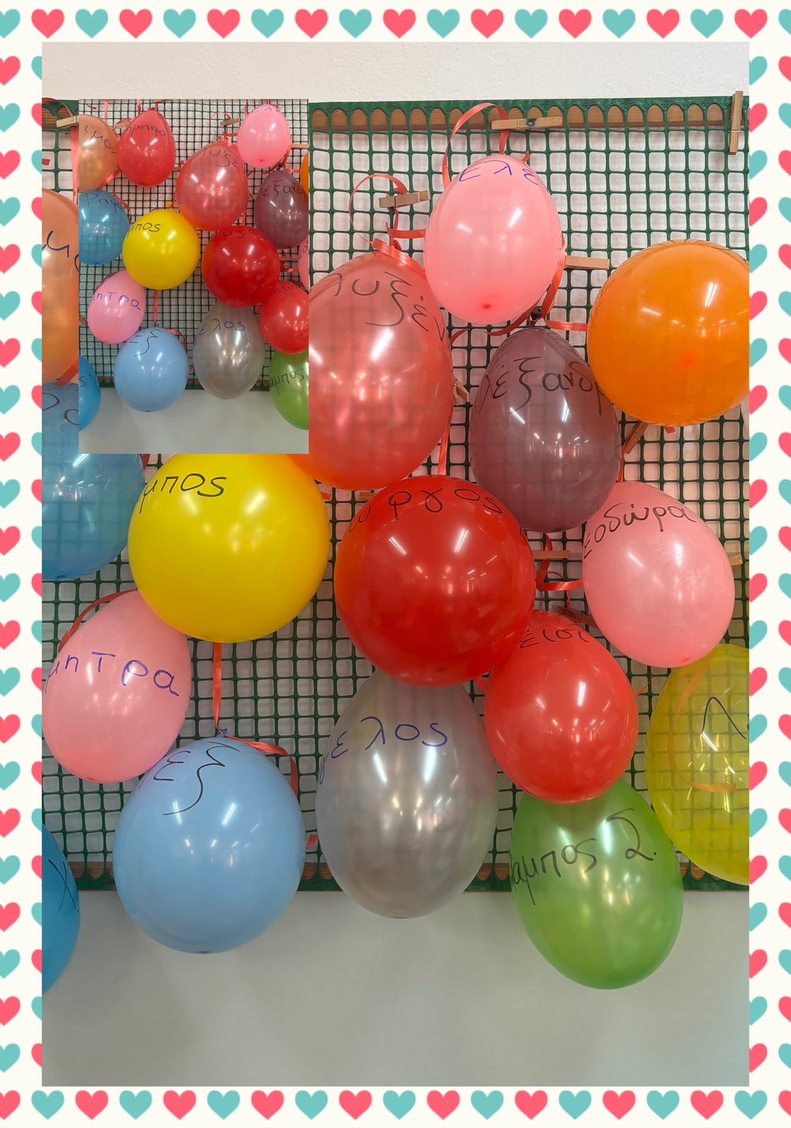 Μόλις ολοκληρώθηκε η παραπάνω διαδικασία, κρεμάσαμε τα μπαλόνια με τα ονόματα όλα μαζί στον τοίχο🎈🎈🎈🎈🎈🎈🎈🎈🎈