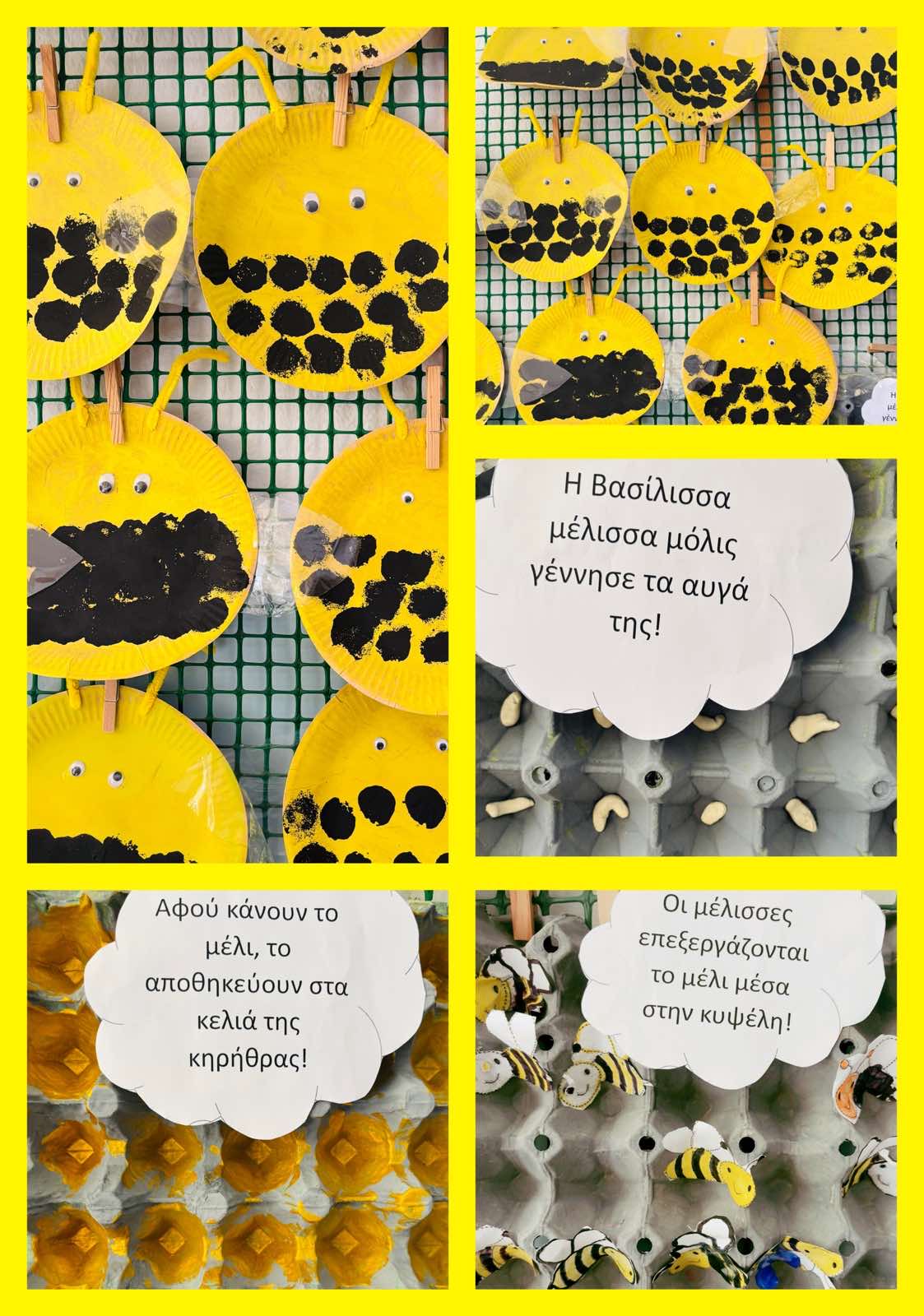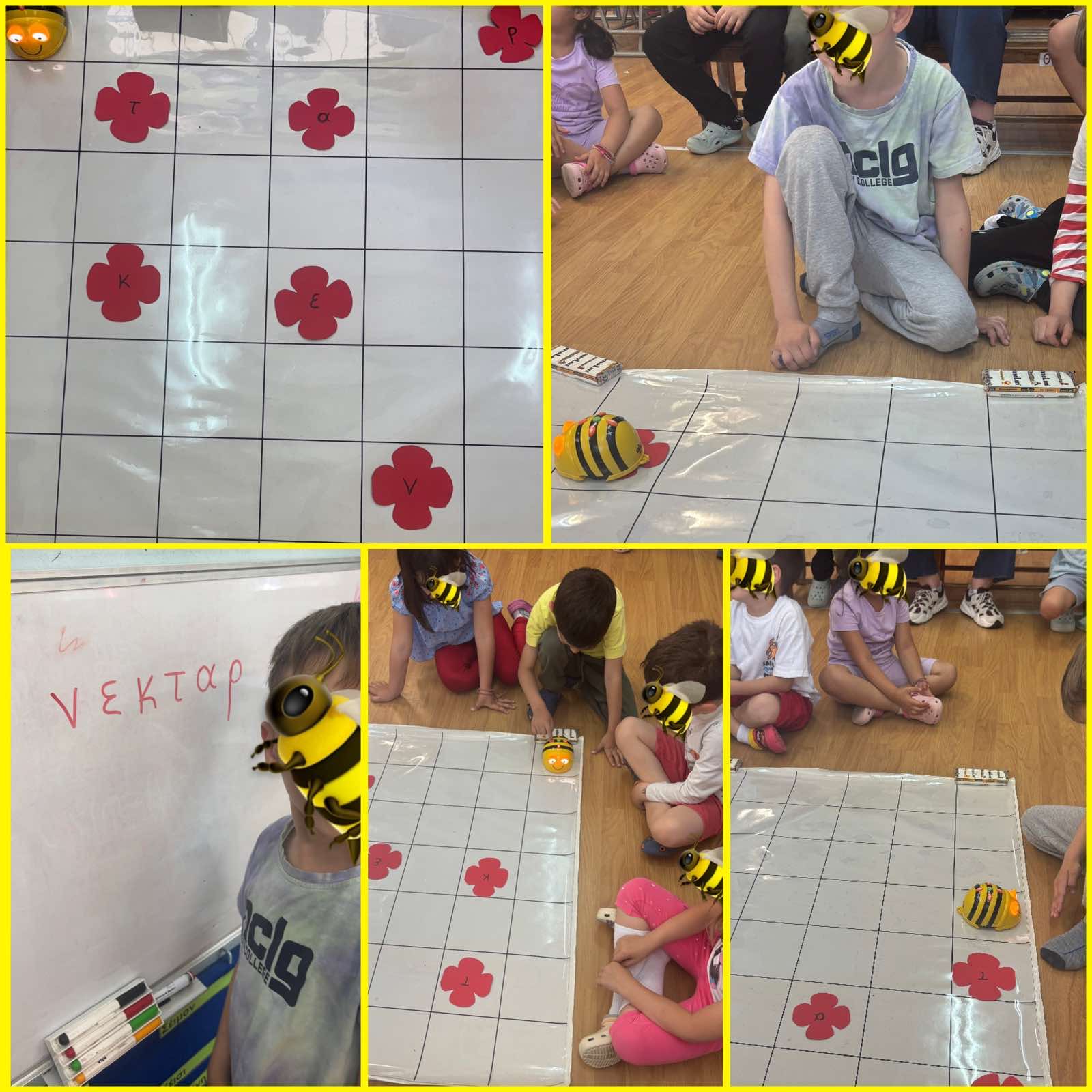 Αφού διαβάσαμε ένα παραμύθι σχετικό για τη μέλισσα, κατασκευάσαμε με χάρτινο πιάτο μελισσούλες! Για κεραίες χρησιμοποιήσαμε σύρμα πίπας και για φτερά ζελατίνες φύλλων (διαφάνειες). Επίσης, χρησιμοποιήσαμε αυγοθήκες για να φτιάξουμε τα στάδια παραγωγής του μελιού!Ώρα για bee bot! Τα παιδιά κλήθηκαν ατομικά να βρουν στο δάπεδο του bee bot τα γράμματα που σχηματίζουν τη λέξη νέκταρ!