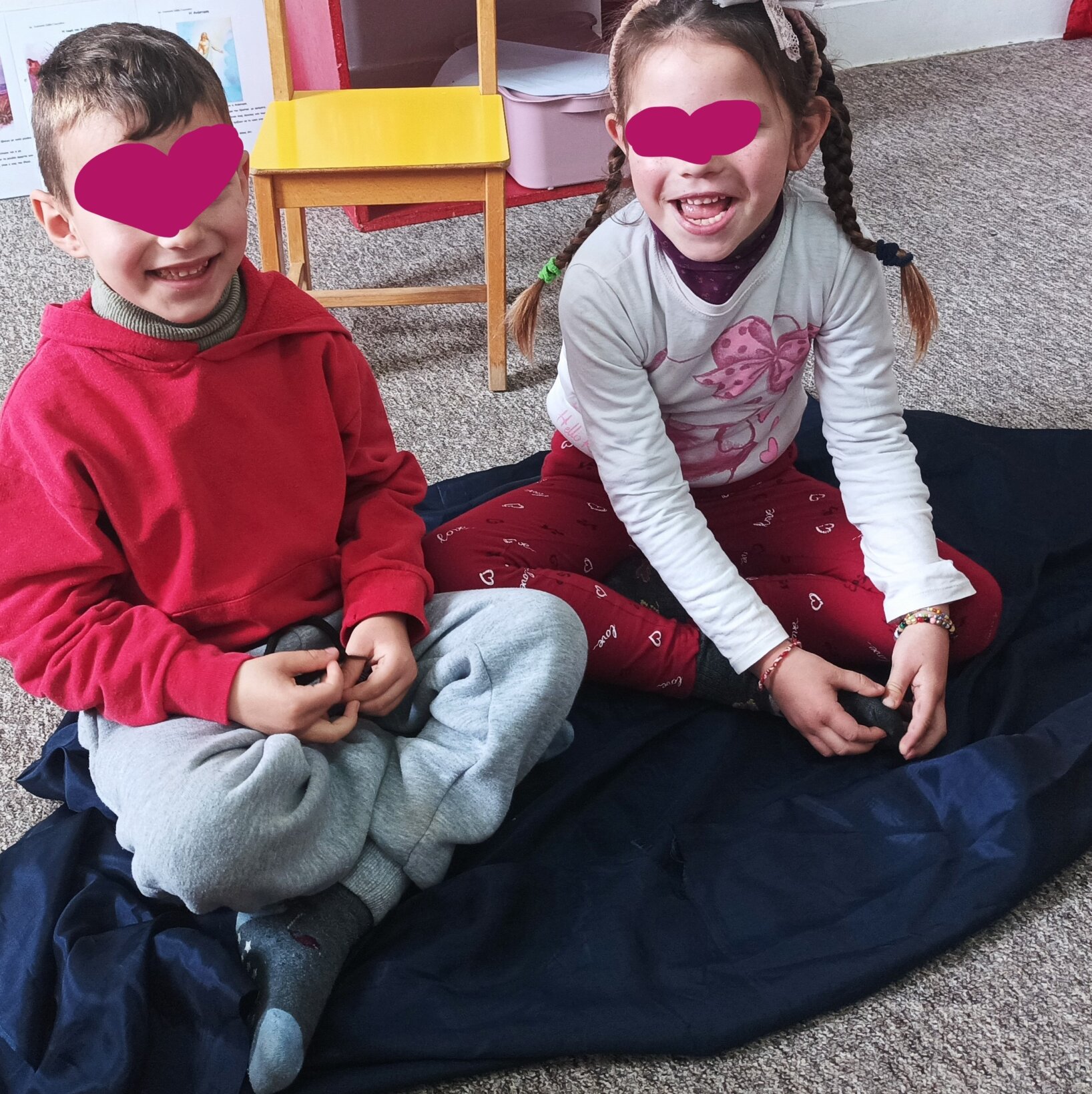 Με ελεύθερους ατοσχεδιασμούς και θεατρικές τεχνικές καλωσορίζουμε γλυκύτατους “εξωγήινους” στην τάξη μας! Κάθε παιδί – εξωγήινος μας μιλάει ακαταλαβίστικα για τον πλανήτη του και το ζευγάρι του (το άλλο παιδί) κάνει τον μεταφραστή, ώστε να καταλάβουμε τί λέει και οι υπόλοιποι …. Ελευθερία, Συνεργασία, Επικοινωνία μέσα σε κλίμα αλληλοαποδοχής, αλληλουποστήριξης και χαράς! Στη θεατρική σύμβαση προστίθενται και γάτες αλλά κοντοπυθαρούληδες εφευρέτες που οδηγούν τα παιδιάσε δημιουργικότατες στιγμές…Τα παιδιά δημιουργούν ακολουθώντας οδηγίες των εφευρετών μέσω ασυρμάτου μία μηχανή κόλλας!!! Μία μηχανή- ρομπότ που θα βρίσκεται στη γωνιά του μάστορα (αλλά όχι μόνο) και όποτε κάποιο παιχνίδι στο σχολείο μας χρειάζεται επιδιόρθωση, θα ενεργοποιείται με το πάτημα των κουμπιών του…(με άλλο κουμπί μιλάει, με άλλο παίζει μουσική, με άλλο βγάζει κόλλα, με άλλο σταματάει…).