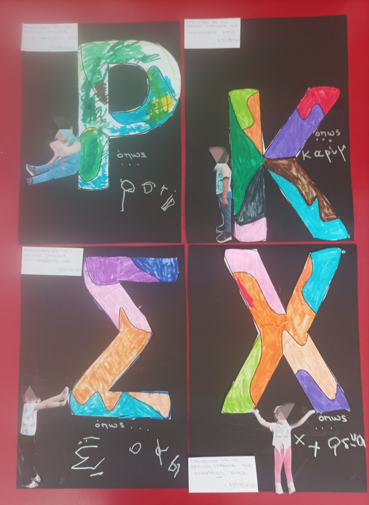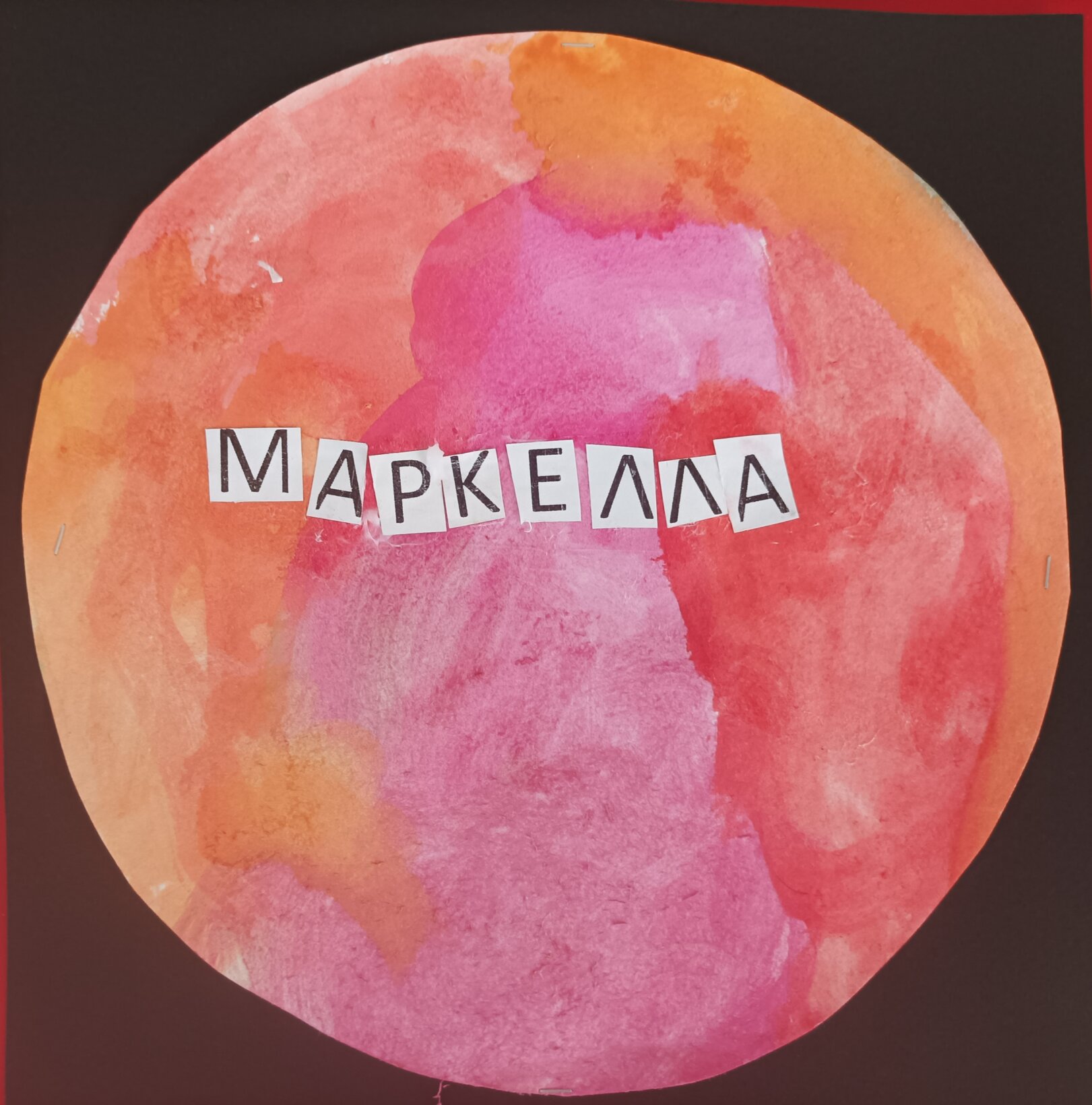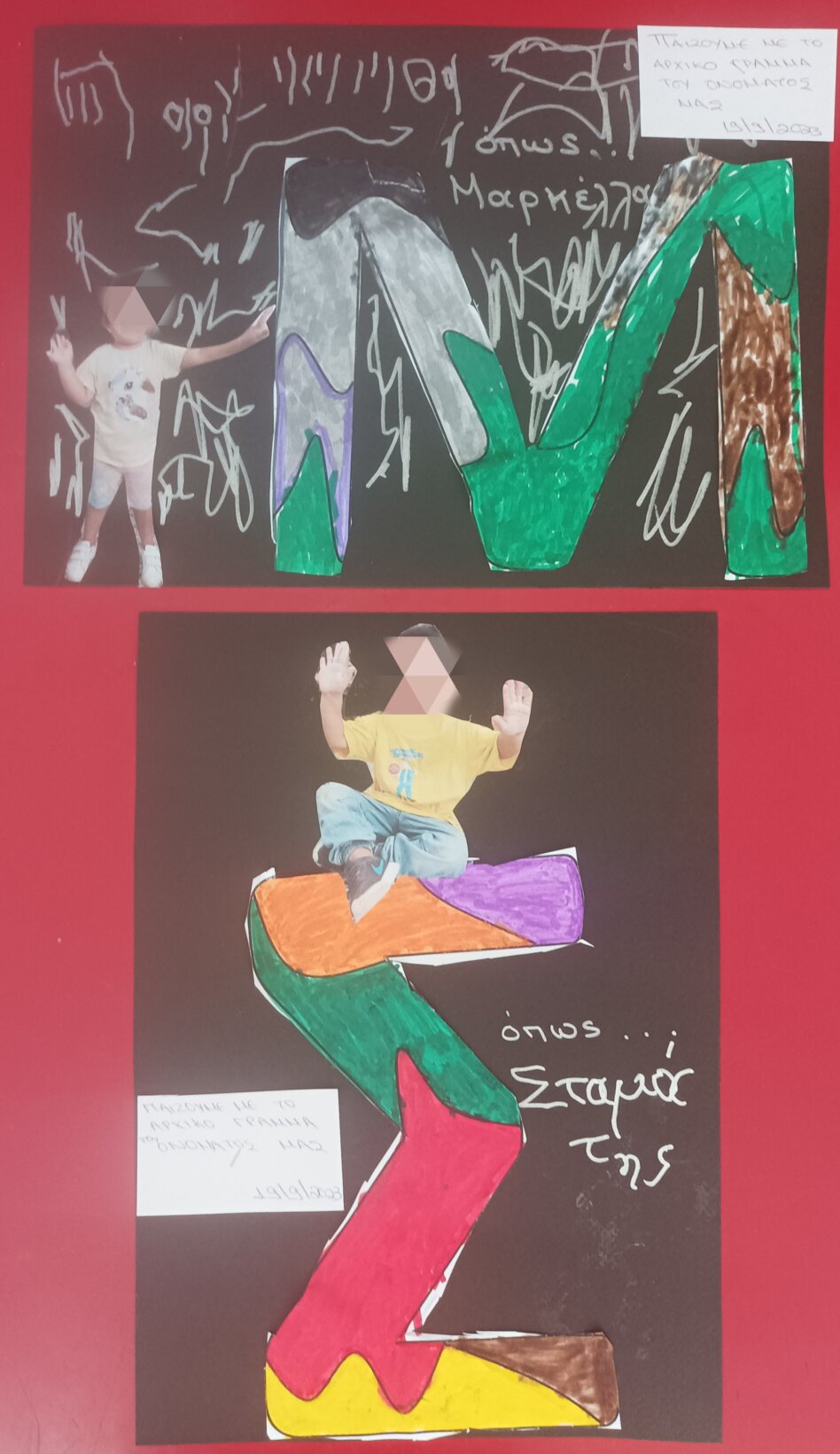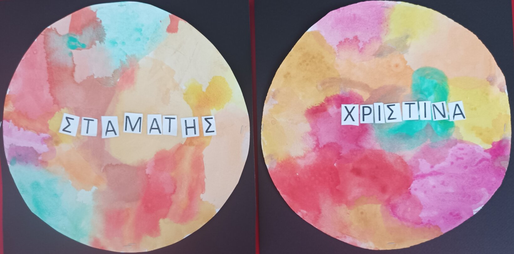 Επίσης χρησιμοποιήσαμε τυπωμένα τα αρχικά γράμματα των ονομάτων μας από το zentangle Art (blog Τάνια Μάνεση) αλλά και φωτογραφίες που βγάλαμε επιτόπου, χρώματα και φαντασία…Παράλληλα γνωρίσαμε να χρησιμοποιούμε νέα υλικά, όπως οι νερομπογιές και τα πινέλα, ενώ κάναμε μία πρώτη προσπάθεια με τα ψαλίδάκια…