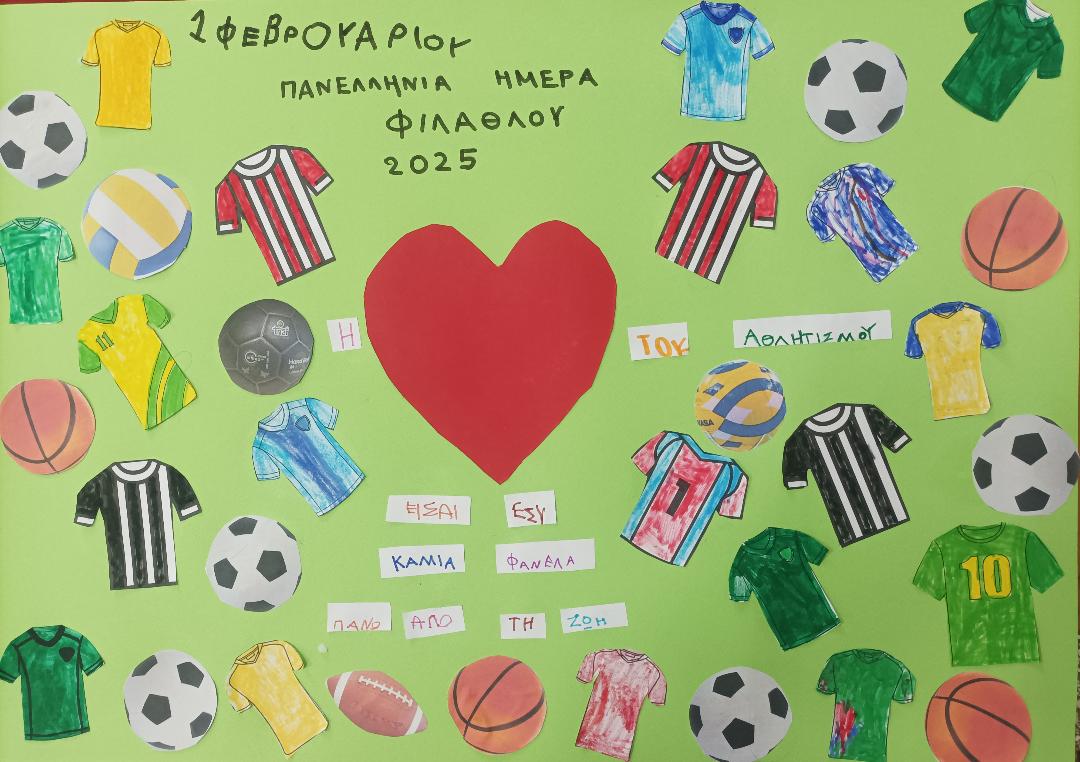 Με σύνθημα “Η καρδιά του αθλητισμού είσαι εσύ, καμιά φανέλα πάνω από τη ζωή” την Παρασκευή 31 Ιανουαρίου πραγματοποιήθηκαν στο νηπιαγωγείο μας, διαδραστική παρουσίαση για την ιδέα του ευ αγωνίζεσθαι αλλά και πολλές αθλητικές δραστηριότητες και ομαδικά παιχνίδια εντός κι εκτός τάξης. Δόθηκε η ευκαιρία στα παιδιά να ευαισθητοποιηθούν αλλά και να συνεργαστούν προκειμένου να δημιουργήσουν από κοινού την παρακάτω αναλογική αφίσα.