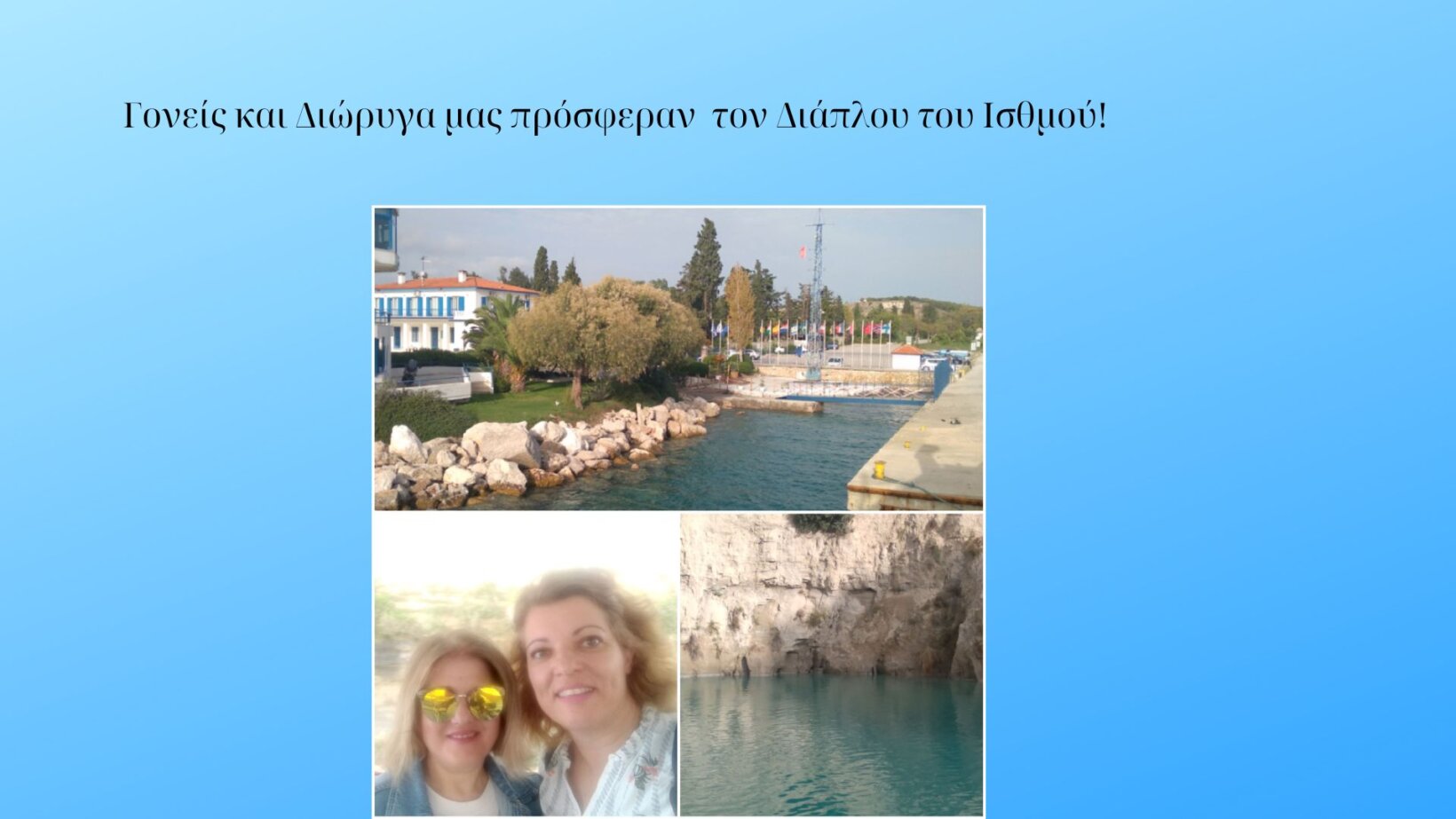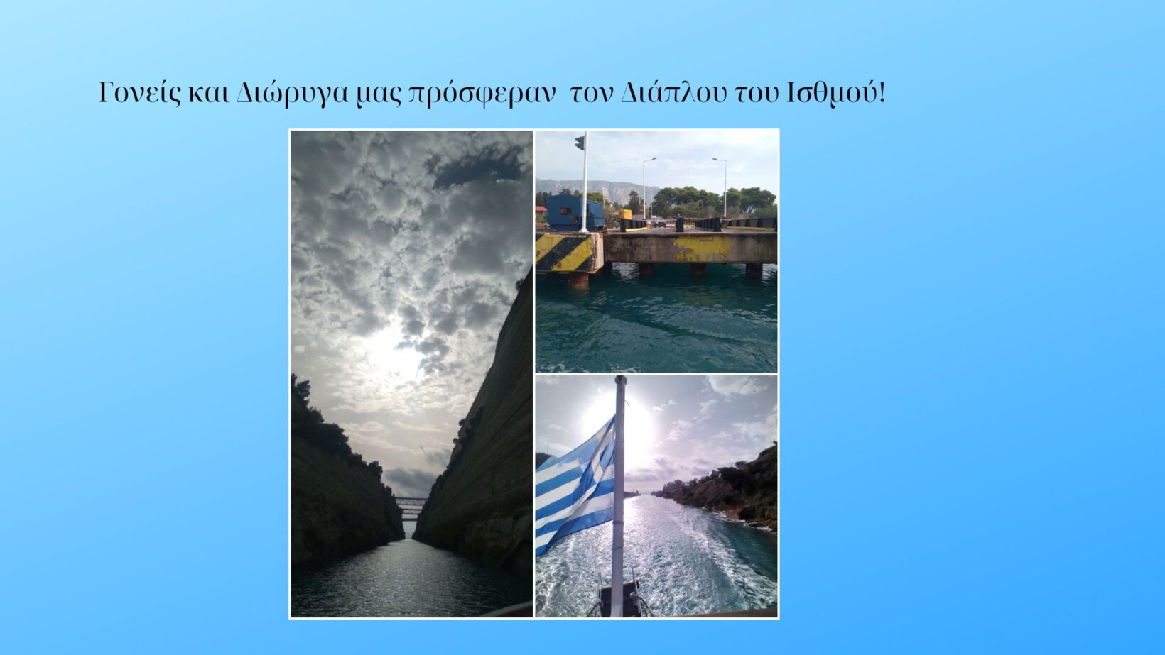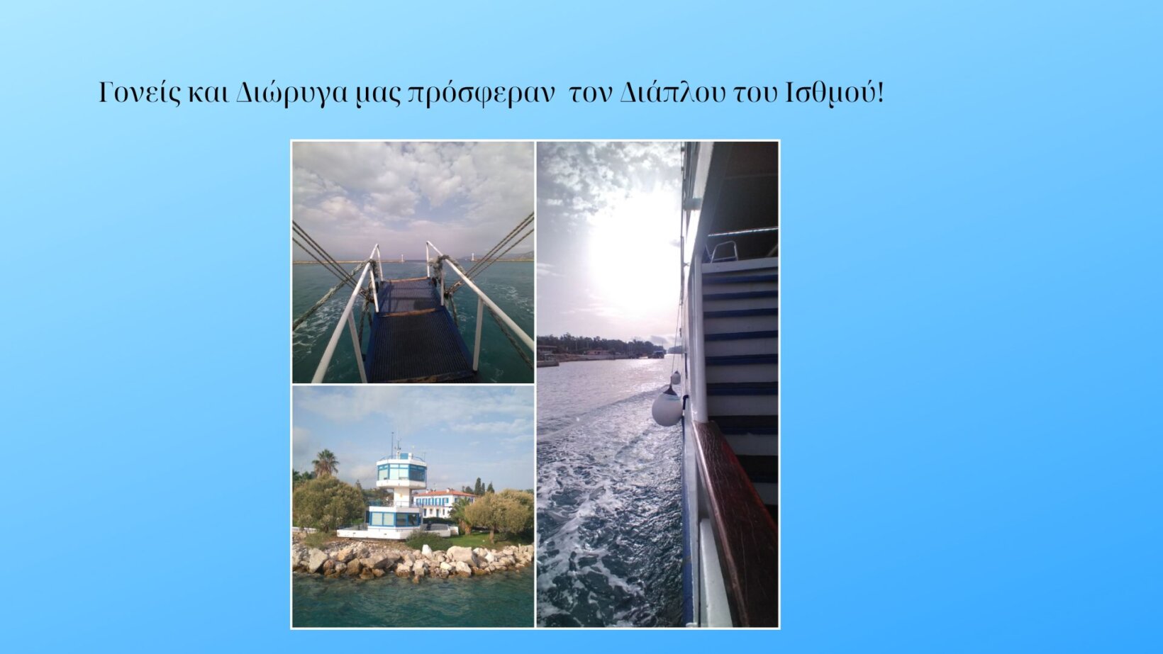 Ευχαριστούμε θερμά κηδεμόνα του Νηπιαγωγείου Ισθμίας καθώς και την Ανώνυμη Εταιρεία Διώρυγας Κορίνθου Α.Ε.ΔΙ.Κ. για την ευγενική προσφορά τους, προκειμένου παιδιά, εκπαιδευτικοί και γονείς του νηπιαγωγείου μας, να πραγματοποιήσουν δωρεάν τον διάπλου του Ισθμού Κορίνθου. Εκπληκτική εμπειρία!