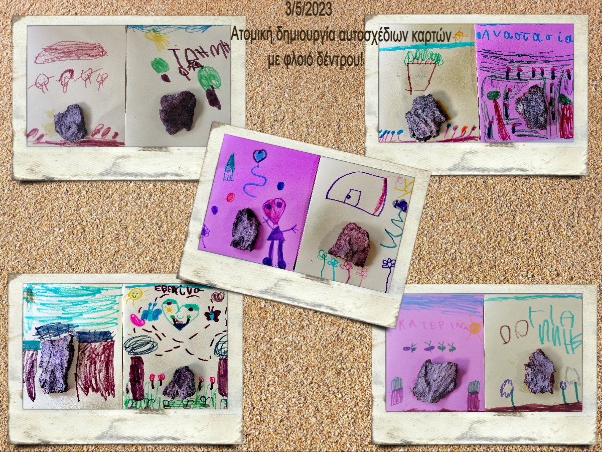 Αποχαιρετώντας τα΄΄Βιβλία σε ρόδες΄΄φτιάξαμε ατομικές κάρτες με φλοιούς δέντρων, που είχαμε μαζέψει από την αυλή μας και στείλαμε τα δικά μας περιβαλλοντικά μηνύματα, μέσα σε φάκελο ζωγραφισμένο από τα χεράκια μας!