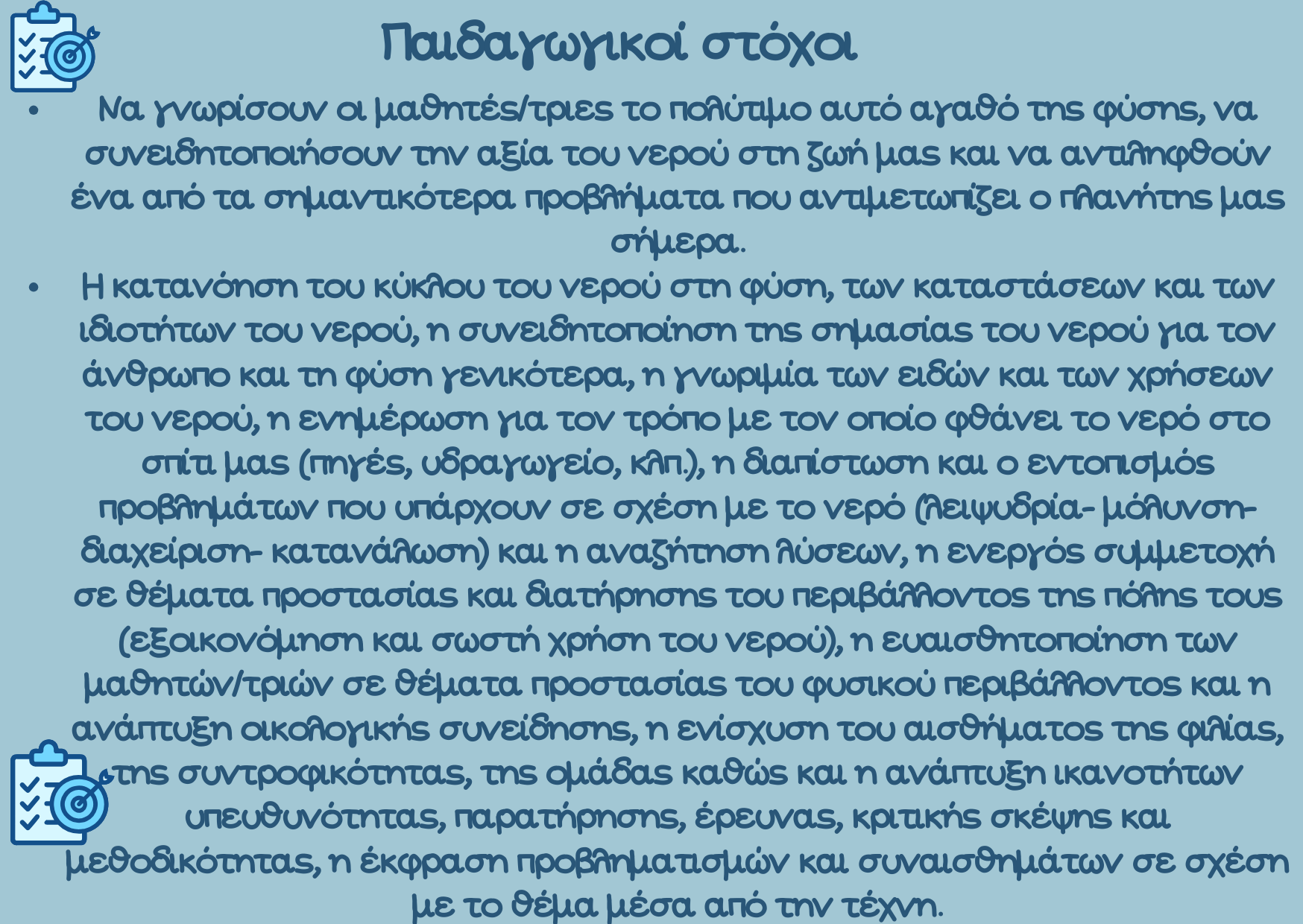 Σκοπός της διδακτικής παρέμβασης ήταν να καταλάβουν οι μαθητές  πόσο πολύτιμο είναι το νερό στον πλανήτη μας ,αλλά και πως αυτό καθορίζει τη ζωή μας.