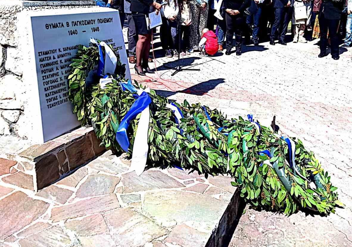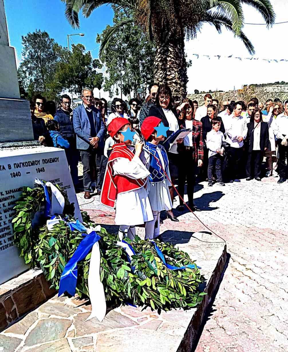 Πραγματοποιήθηκε δοξολογία και κατάθεση στεφάνων στο ηρώο πεσόντων της περιοχής μας. Οι μαθητές Γιώργος και Αναστασία εκπροσώπησαν το νηπιαγωγείο μας, κατέθεσαν στεφάνι προς τιμή των πεσόντων και απήγγειλαν ποιήμα με τίτλο΄΄Ευλογημένη μέρα΄΄.