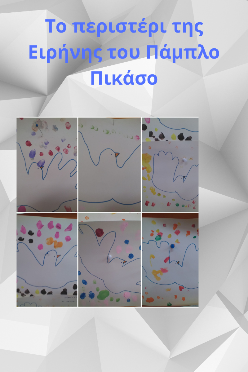 Μελετώντας τον πίνακα του Πάμπλο Πικάσο΄΄Το παιδί και το περιστέρι΄΄χωριστήκαμε σε ομάδες και δημιουργήσαμε α) πολεμικές και ειρηνικές ζωγραφιές σε χαρτί Α3, β) ατομικές και ομαδικές δημιουργίες
