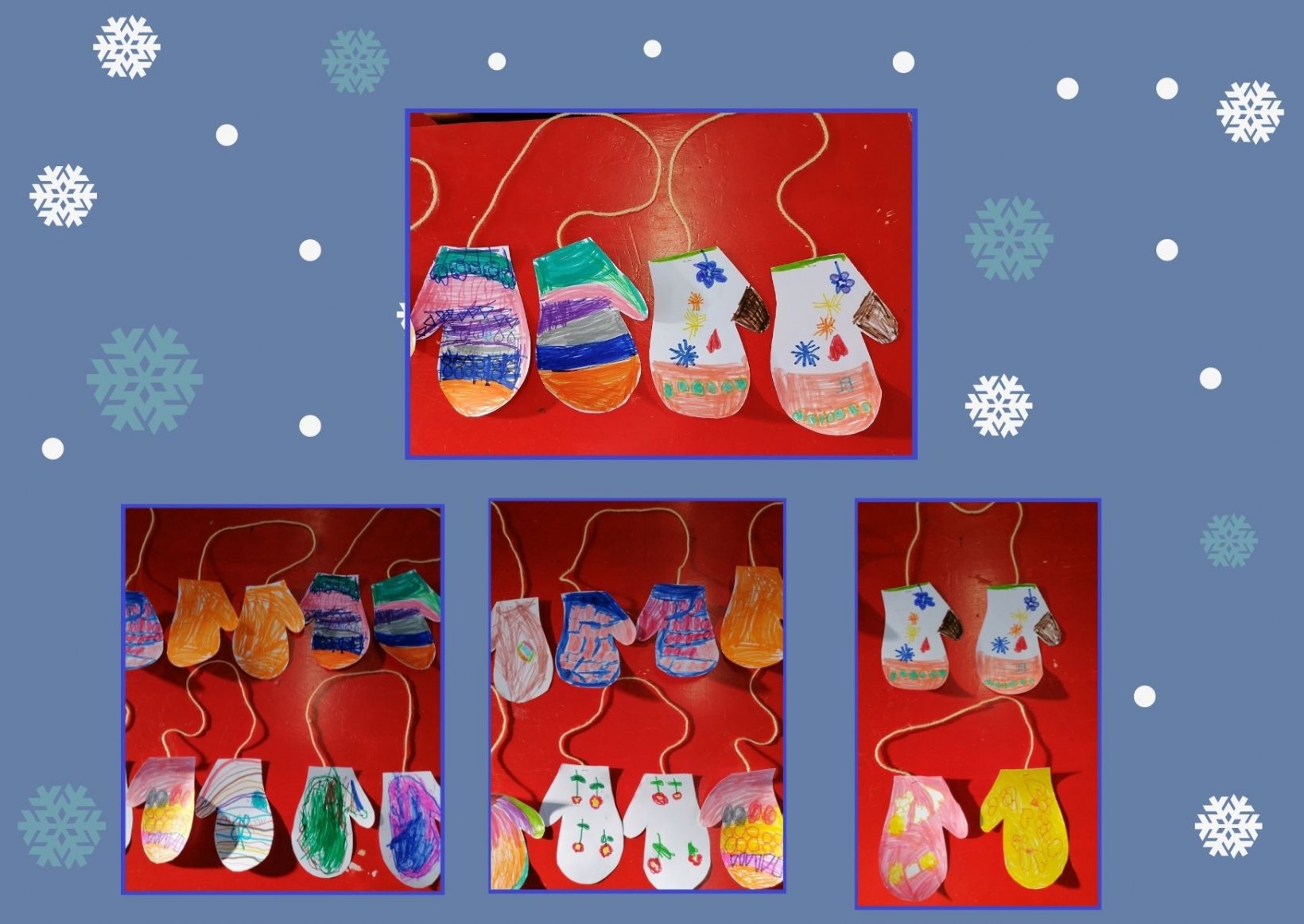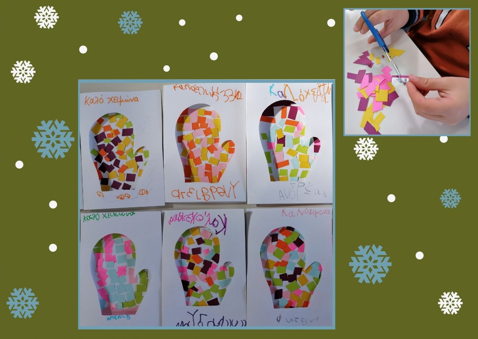 - Φτιάξαμε κάρτα γάντι, κόβοντας και κολλώντας πολύχρωμα χαρτάκια της αρεσκείας μας σε σχήμα γαντιού και γράψαμε ΄΄καλό χειμώνα΄΄
