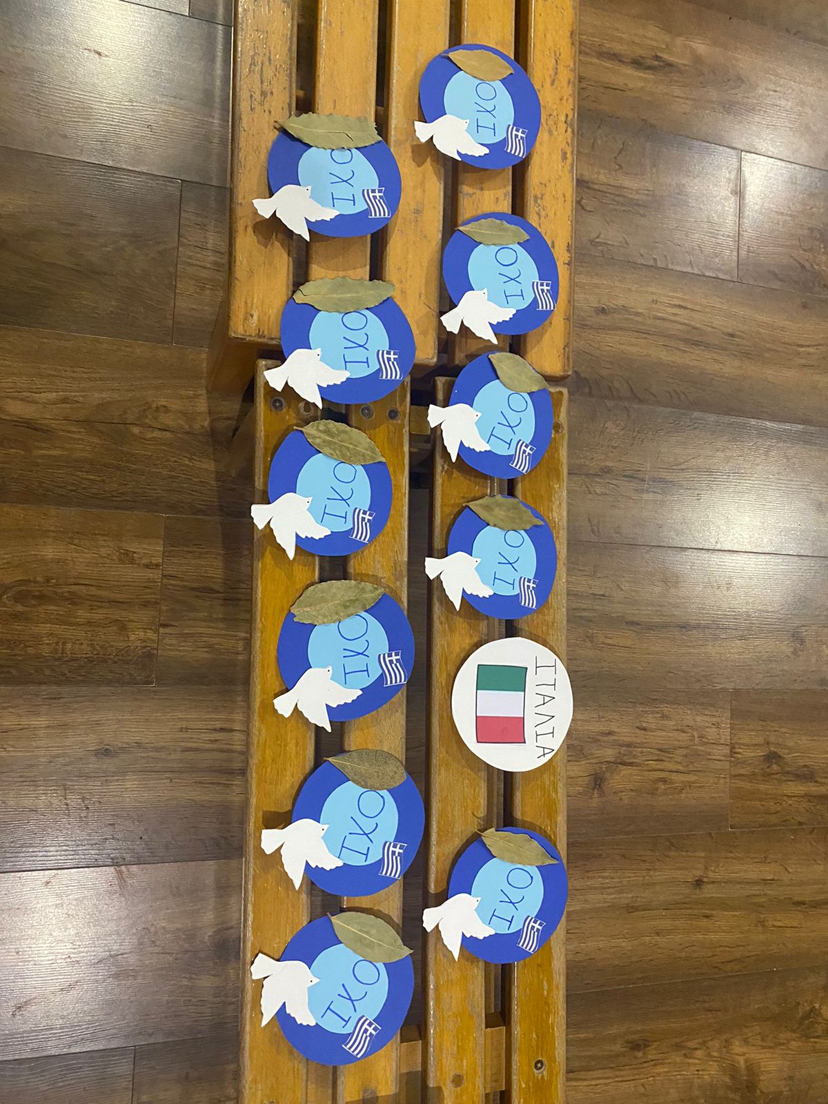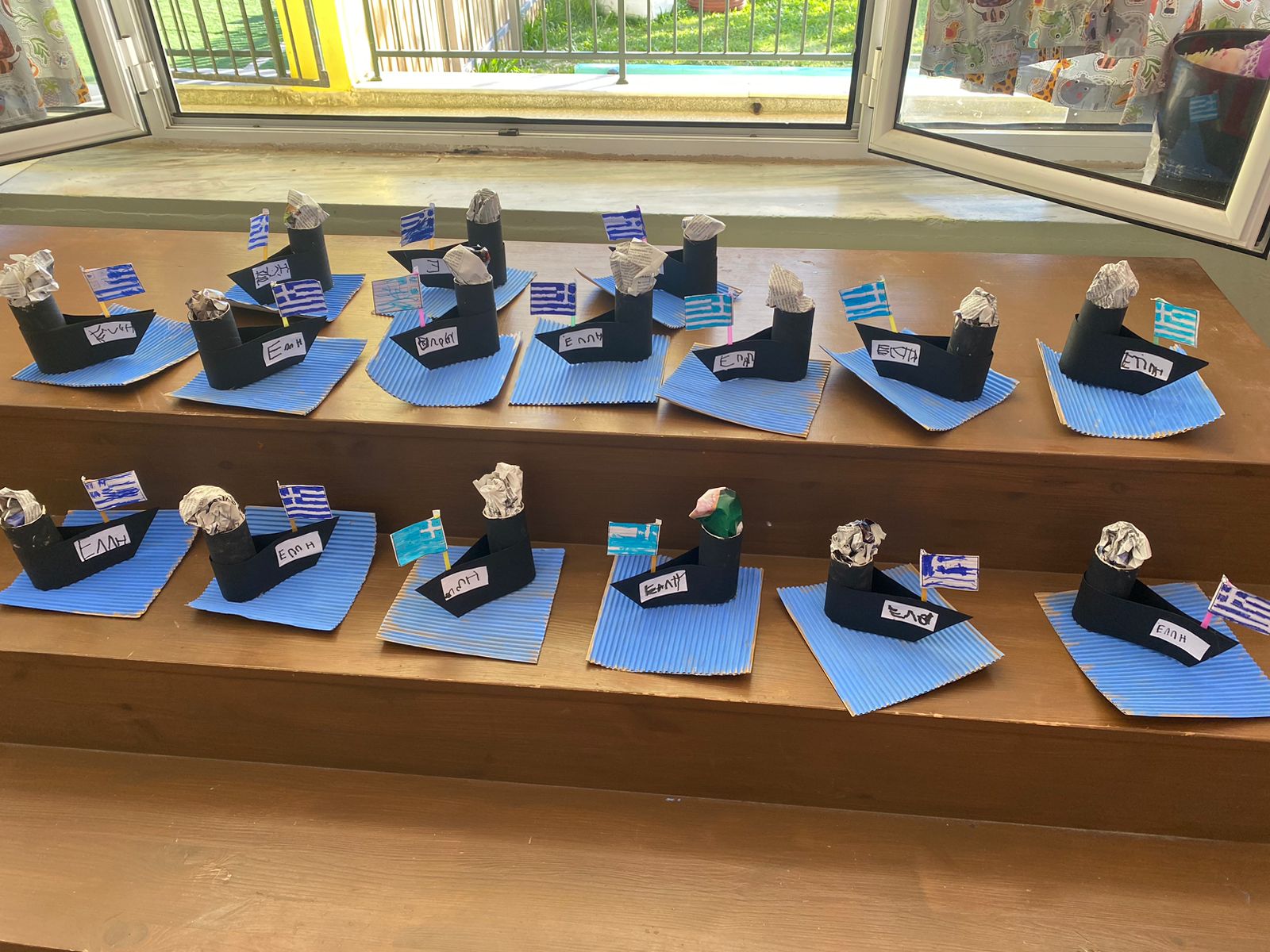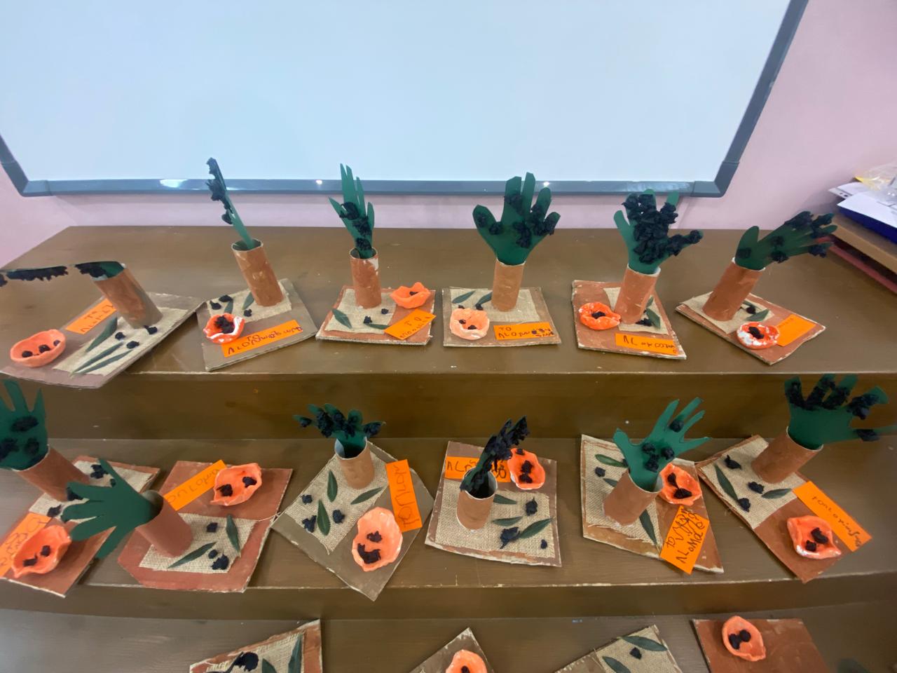 Στη συνέχεια, τα παιδιά αναπαράστησαν το λιομάζωμα με το δικό τους τρόπο μέσα από τη χειροτεχνία τους. Ζωγράφισαν για κορμό της ελιάς ένα ρολό από χαρτί και για κλαδιά ελιάς τη παλάμη τους, την οποία γέμισαν με γκοφρέ για καρπό. Κόλλησαν τα λιόπανα και πάνω σε αυτά ελιές και κλαδιά. Έπλασαν κοφίνια από πηλό και το βάψανε. Τέλος, γράψανε ως τίτλο “Το Λιομάζωμα”.